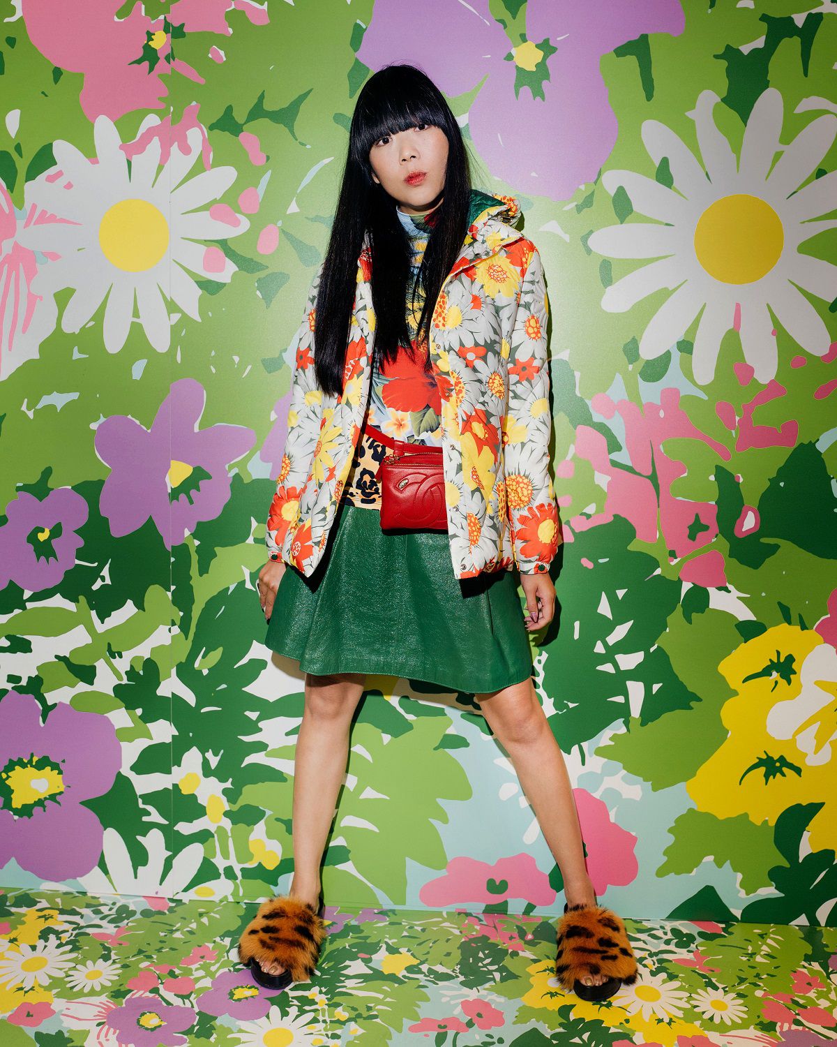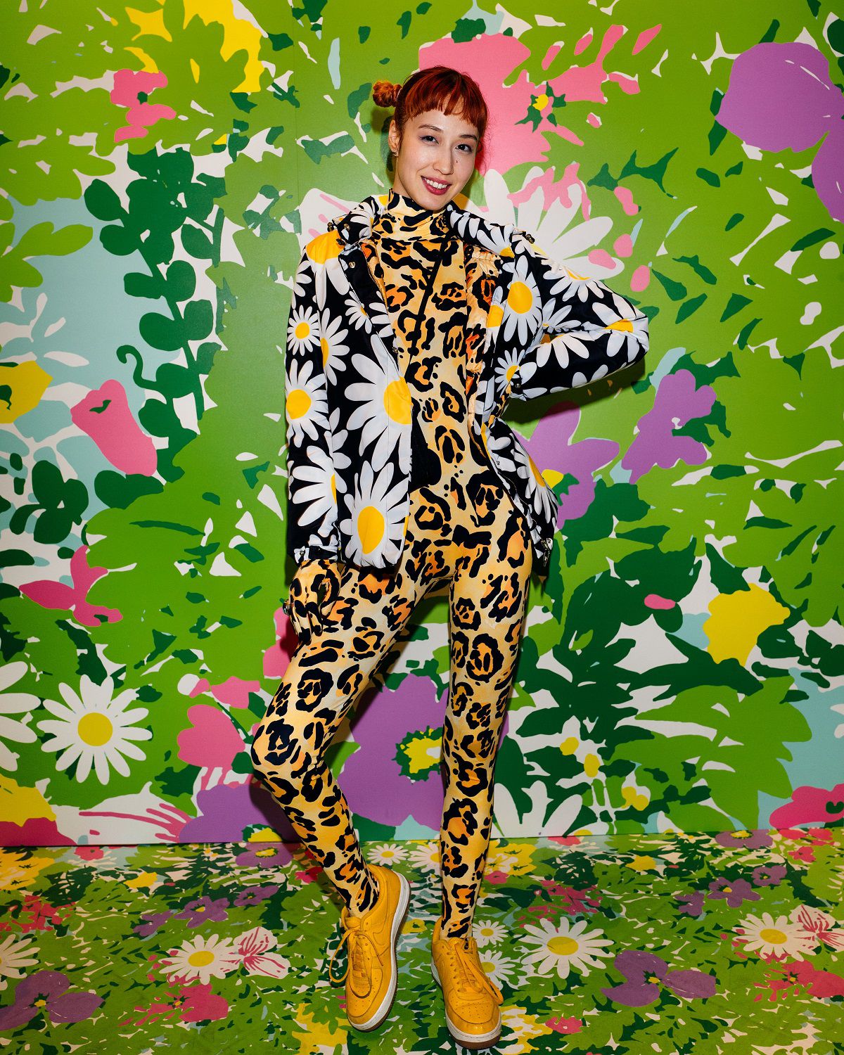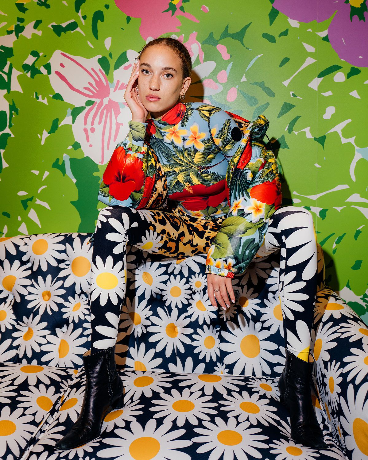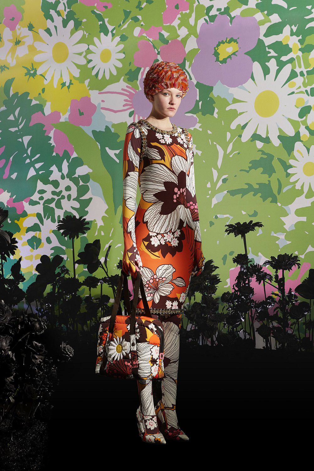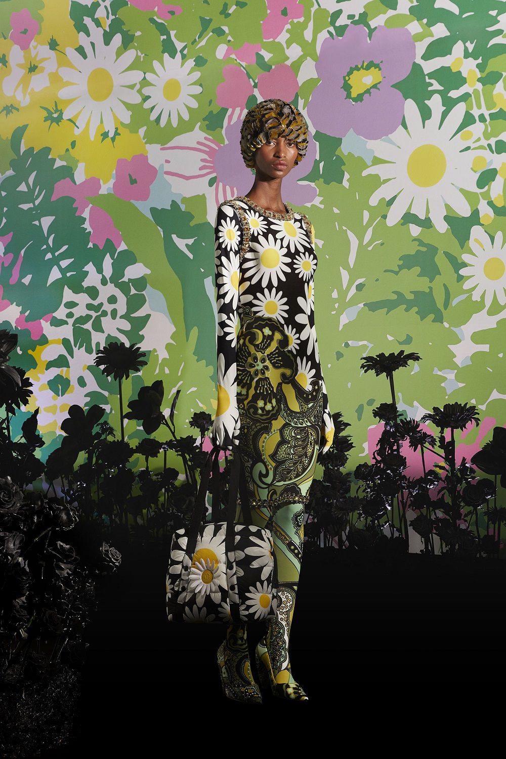 Il risultato, ispirato all'eleganza della couture degli anni '50 e '60, è una combinazione di outerwear accattivante, tute stampate e cuissard imbottiti. Un mix'n'match di stampe vibranti invade ogni capo: dalle giacche imbottite in piuma con maniche a bracciale e chiusura diamantata ai bodysuit, dai pajamas suit trapuntati con bottoni gioiello ai piumini oversize in versione animalier, dai piumini con la scritta Moncler a caratteri cubitali dal mood eighties ai cuissard con tacco a banana.