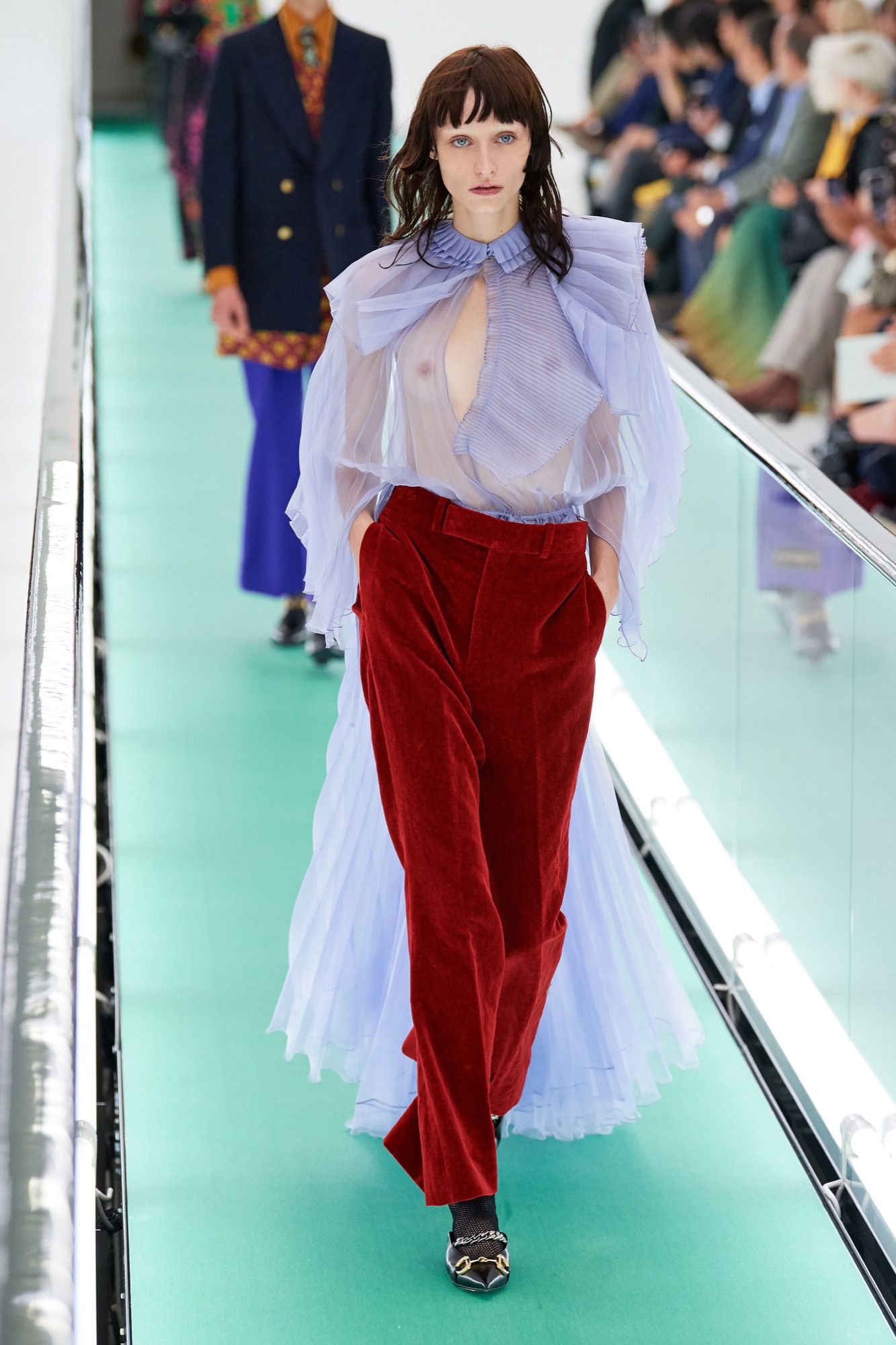 "Ho paura di annoiarmi" ha dichiarato Alessandro Michele al termine della sfilata per raccontare la nuova collezione di Gucci - e onestamente anche noi avevamo molto timore di annoiarci con l'ennesimo show di Gucci condito di esoterismo, barocco, accessori esagerati, teste mozzate, e chi più ne ha più ne metta. Questa volta, però, Michele ha fatto leva sul togliere piuttosto che sull'aggiungere. Lo show si apre con 21 modelli in total white su una vera passerella che si muove. E' il momento della purificazione, siamo pronti a goderci il futuro firmato Gucci. Un futuro non esattamente inedito, che trae indubbiamente spunto dai codici estetici della Maison, questa volta riproposti però in forma nuova. C'è tutto quello a cui Michele ci ha abituato, ma è meglio, perchè è più contenuto. Gli anni Settanta, i completi stampati, le gonne midi, il logo, gli accessori esagerati, c'è ancora tutto, ma è arricchito da un twist ancora più contemporaneo, che farà sicuramente vendere a Gucci più di quanto non faccia già ora.