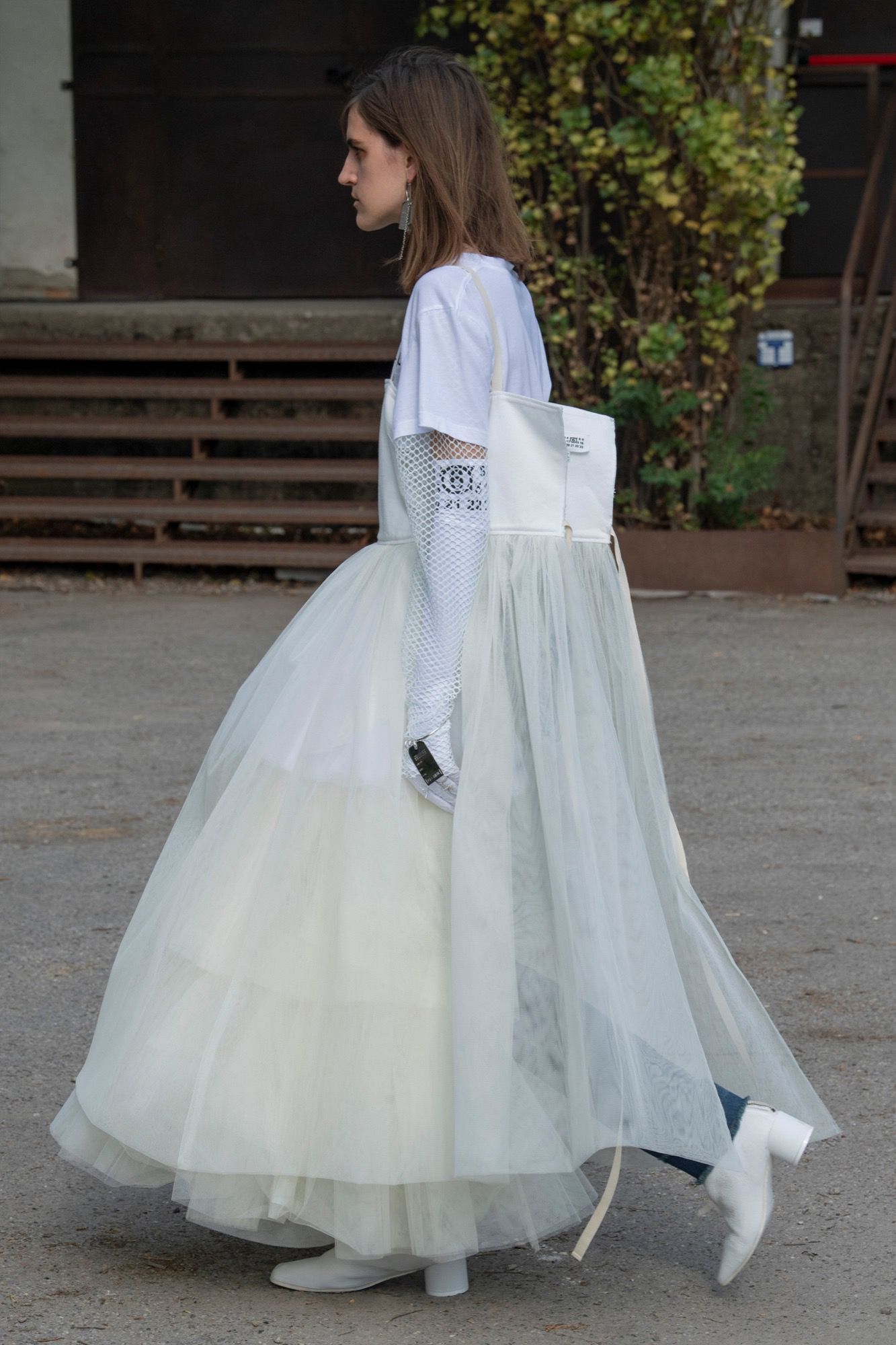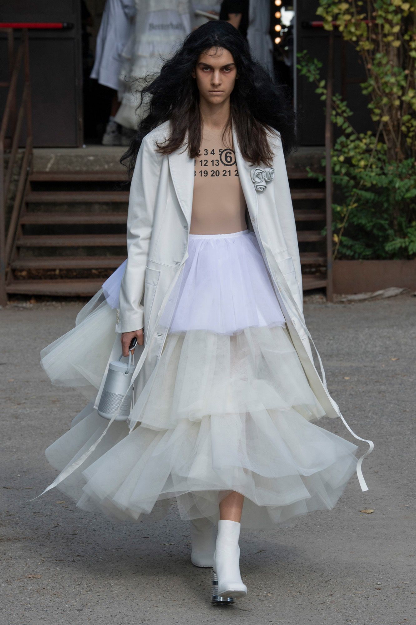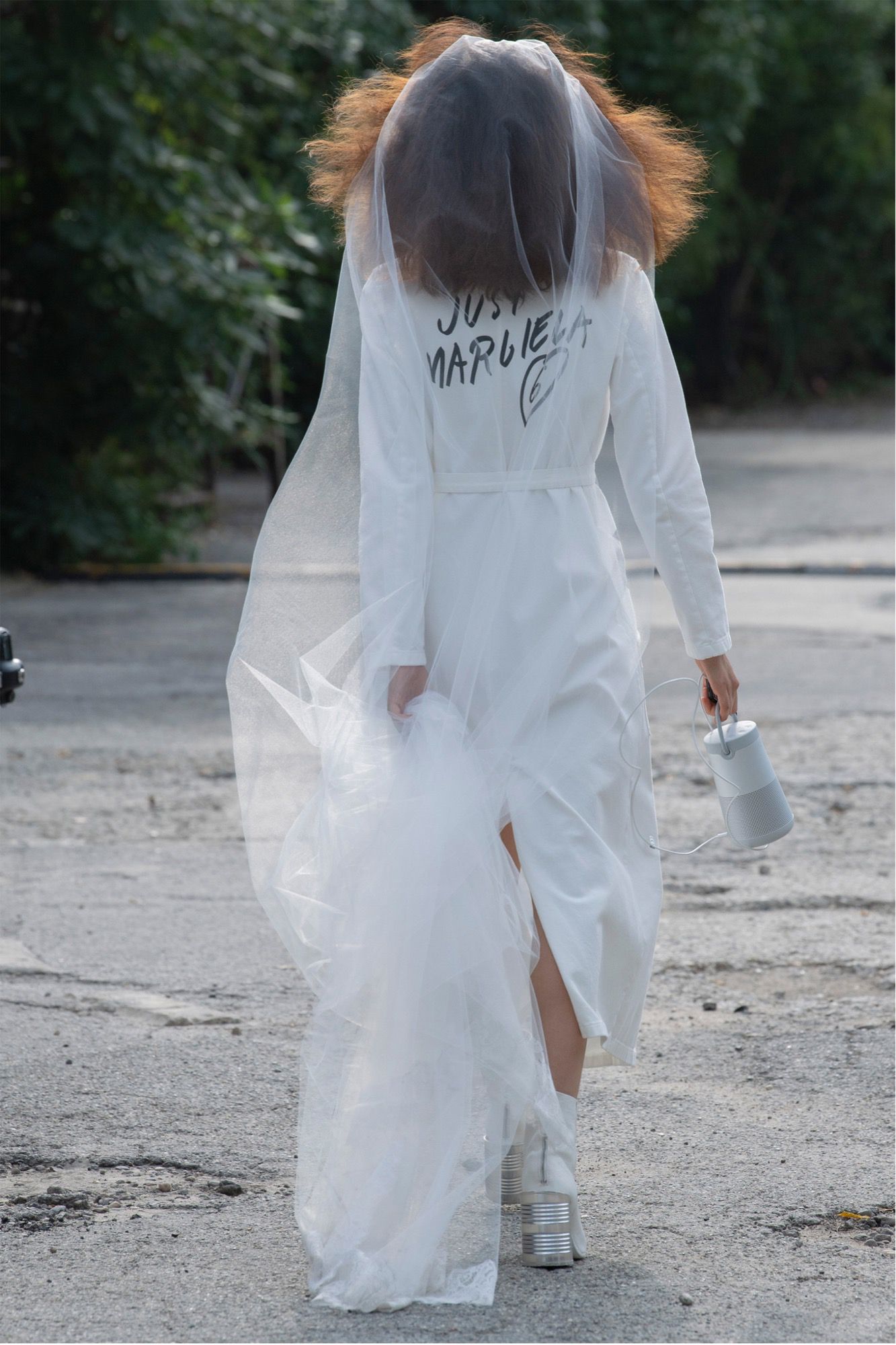 Sembra che l'ispirazione principale per questa collezione sia arrivata da John Lennon e Yoko Ono, in particolare dalla famosa fotografia che li ritrae nel letto insieme. La proposta si nutre infatti del concetto di stare insieme, facendo riferimento all'istituzione del matrimionio, dai capi decorati dalle scritte Just Married, all'inserimento e all'utilizzo di tulle bianco in look anche non da sposa. Nonostante l'ispirazione, la collezione non è romantica, eccessivamente sognante o irreale, resta invece molto concreta, contemporanea e molto interessante. Sicuramente non piacerà a tutti, come è tipico di Margiela, ma è senza dubbio una proposta ispirata e ragionata, quasi una rarità ormai.