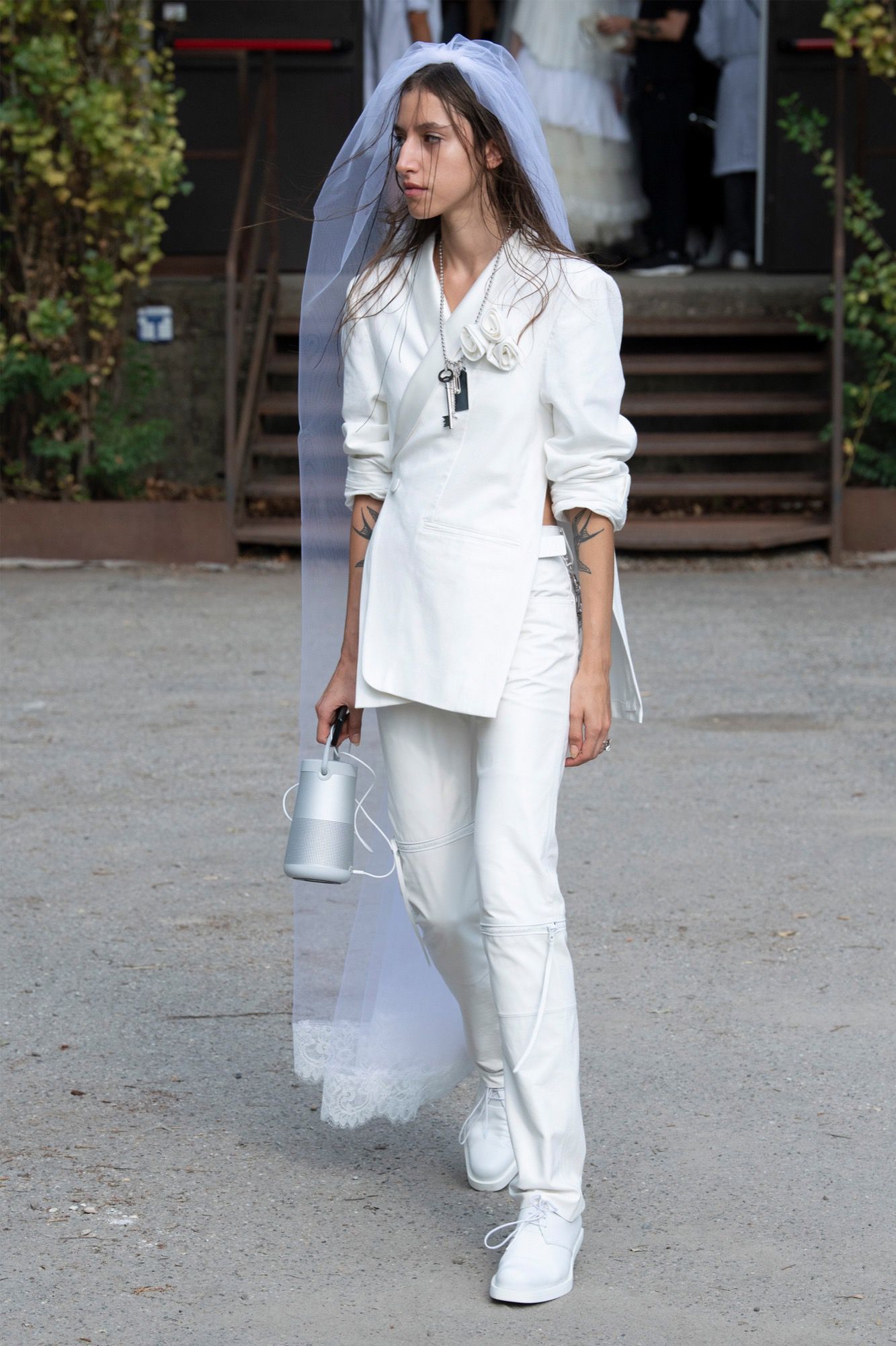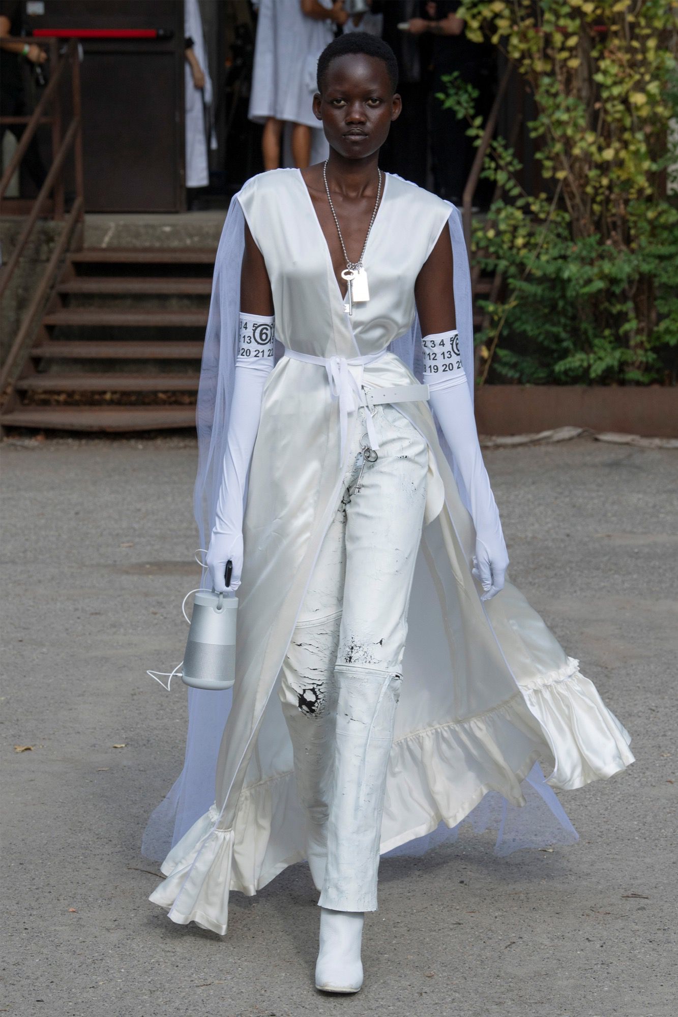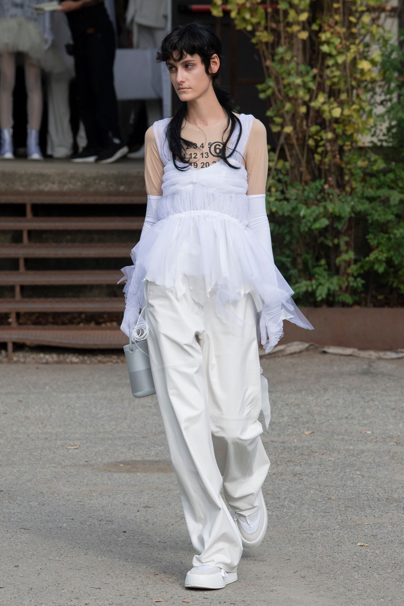 Sembra che l'ispirazione principale per questa collezione sia arrivata da John Lennon e Yoko Ono, in particolare dalla famosa fotografia che li ritrae nel letto insieme. La proposta si nutre infatti del concetto di stare insieme, facendo riferimento all'istituzione del matrimionio, dai capi decorati dalle scritte Just Married, all'inserimento e all'utilizzo di tulle bianco in look anche non da sposa. Nonostante l'ispirazione, la collezione non è romantica, eccessivamente sognante o irreale, resta invece molto concreta, contemporanea e molto interessante. Sicuramente non piacerà a tutti, come è tipico di Margiela, ma è senza dubbio una proposta ispirata e ragionata, quasi una rarità ormai.