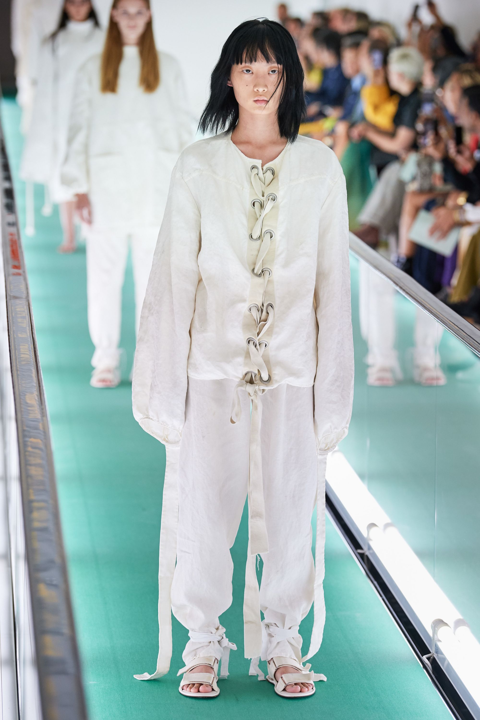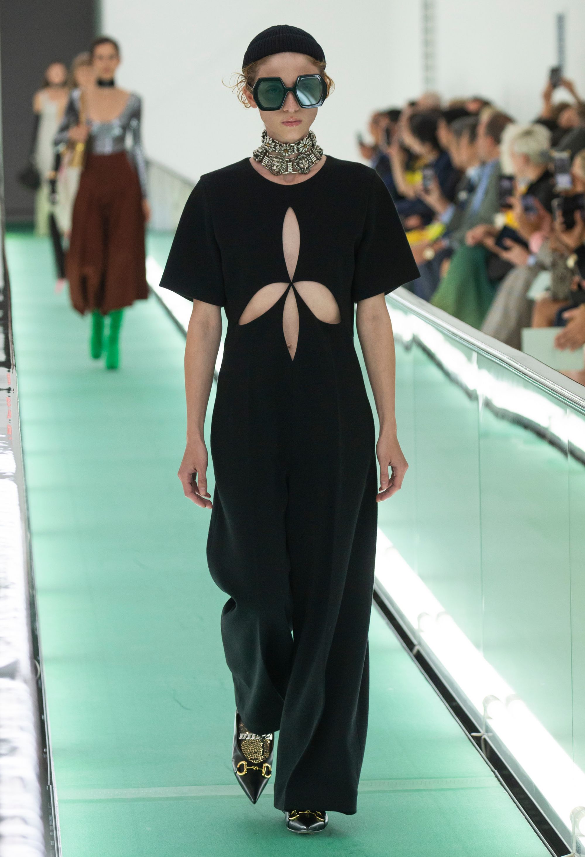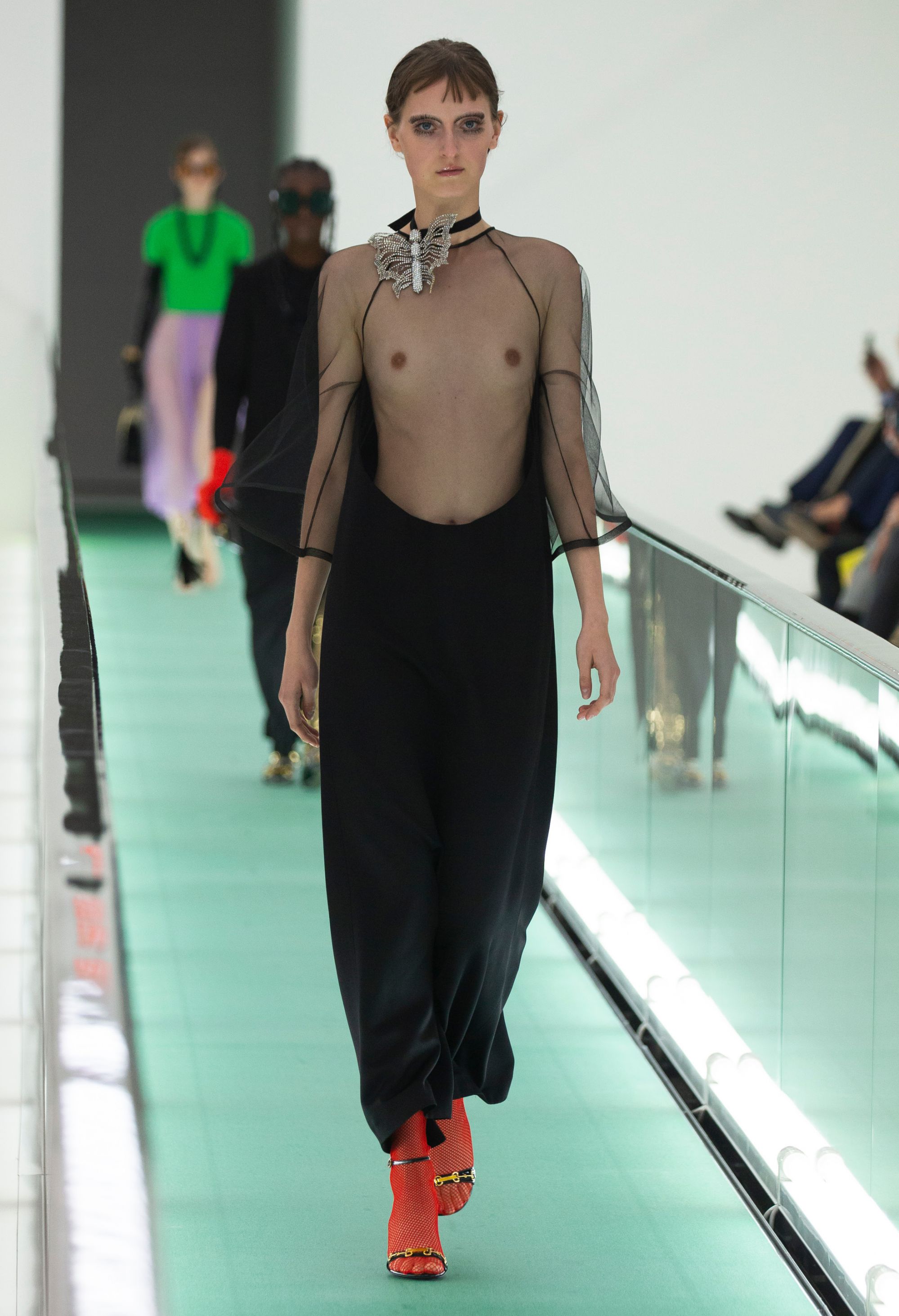 Lo sfilata di Gucci parte dalla location: una stanza incontaminata, divisa da nastri trasportatori verde e colorata da luci rosse, ma quando le porte di metallo si sono chiuse e le luci tremolanti si sono accese, hanno svelato uno spazio clinico completamente bianco, asettico e freddo. Poco dopo, alcuni modelli sono usciti su nastri trasportatori, indossando variazioni di camicie di forza. Fermi, sono stati trasportati dal nastro mantenendo un'espressione gelida e spenta.