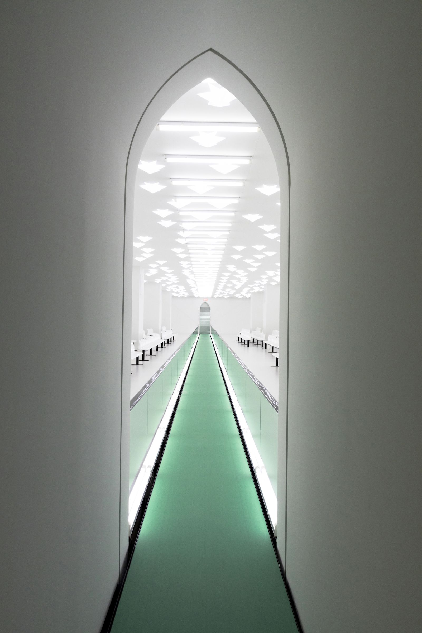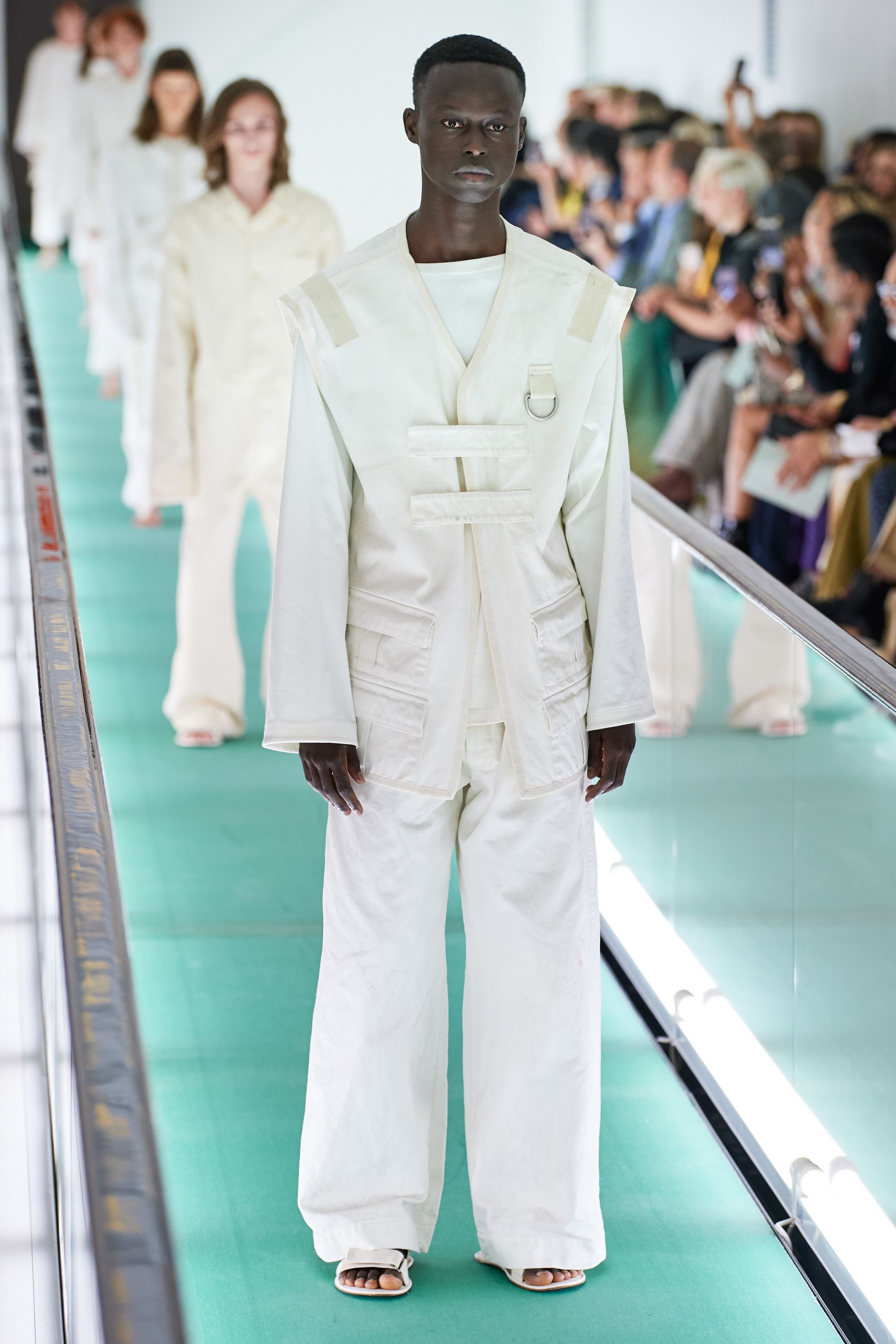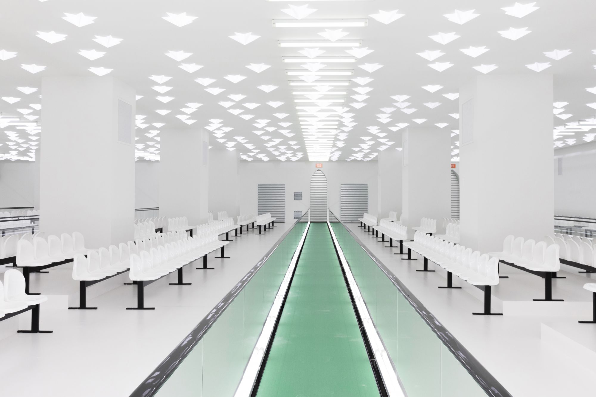 Lo sfilata di Gucci parte dalla location: una stanza incontaminata, divisa da nastri trasportatori verde e colorata da luci rosse, ma quando le porte di metallo si sono chiuse e le luci tremolanti si sono accese, hanno svelato uno spazio clinico completamente bianco, asettico e freddo. Poco dopo, alcuni modelli sono usciti su nastri trasportatori, indossando variazioni di camicie di forza. Fermi, sono stati trasportati dal nastro mantenendo un'espressione gelida e spenta.