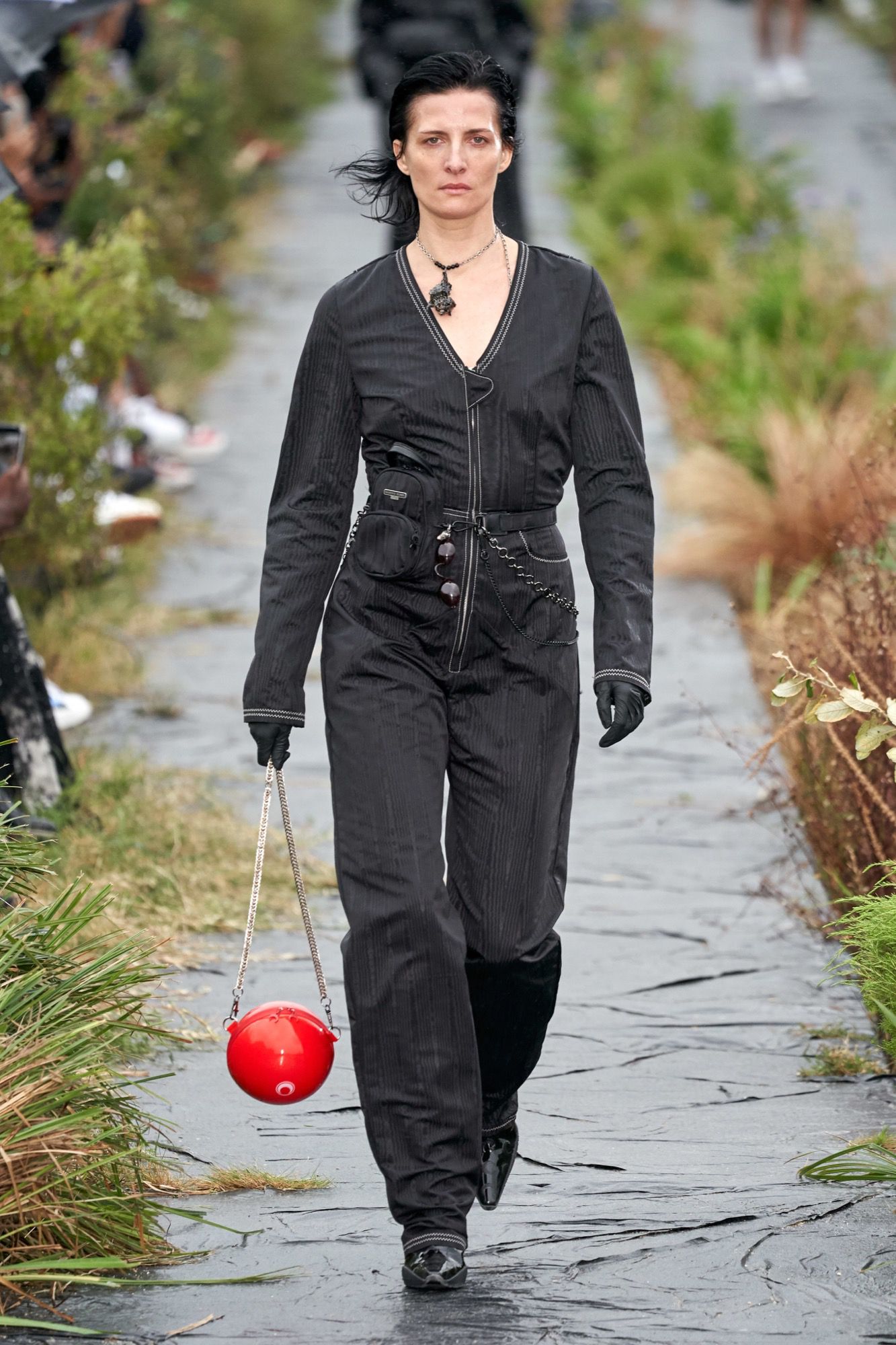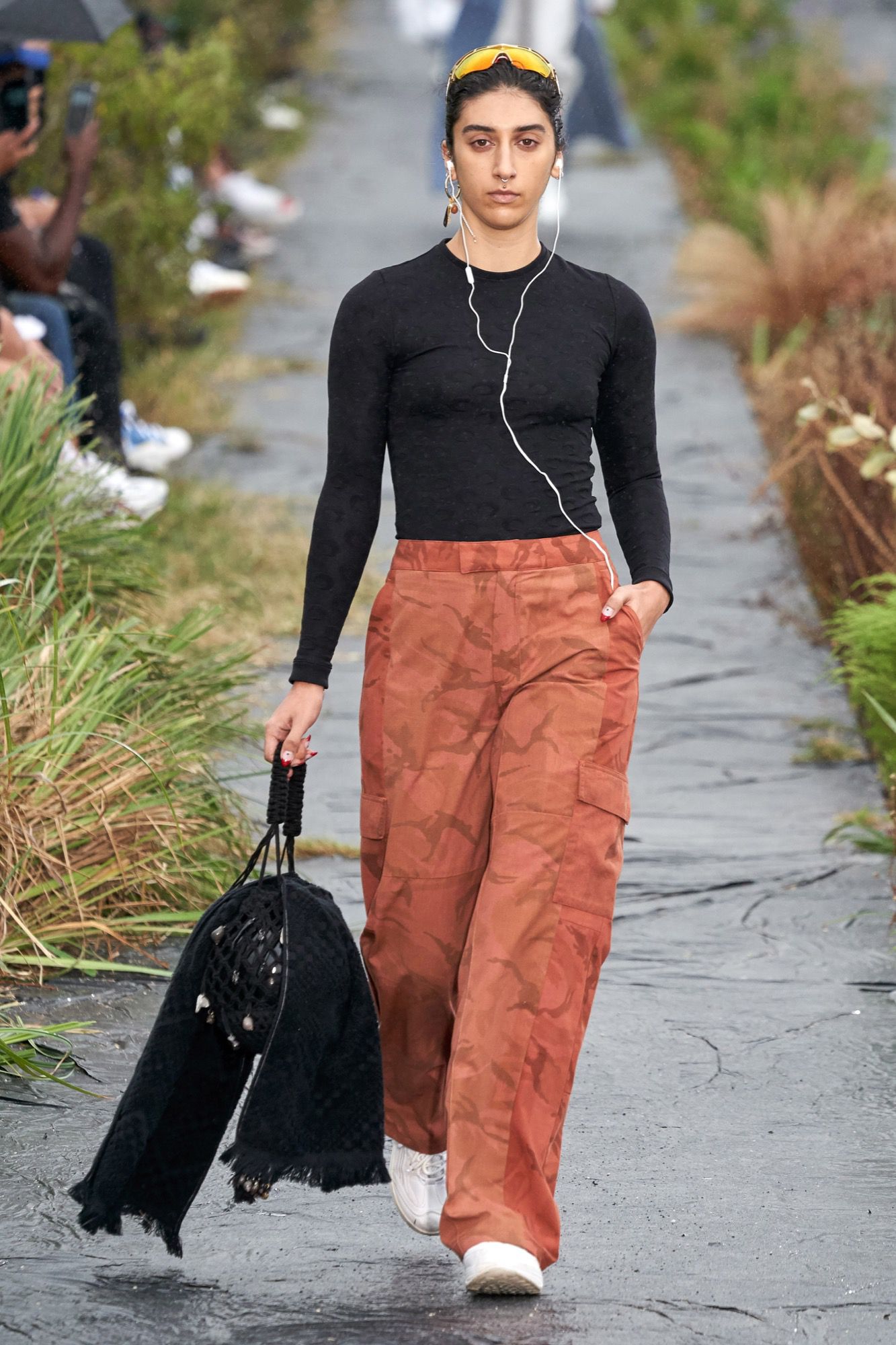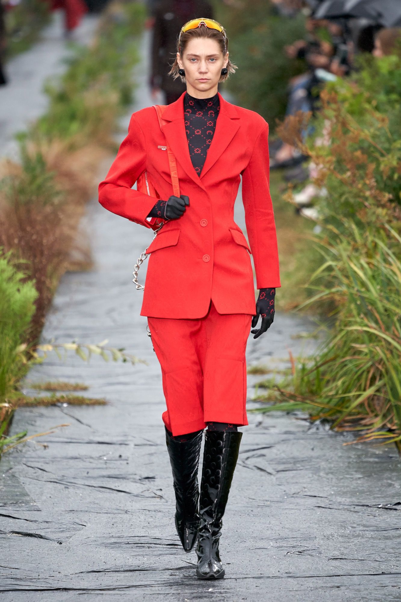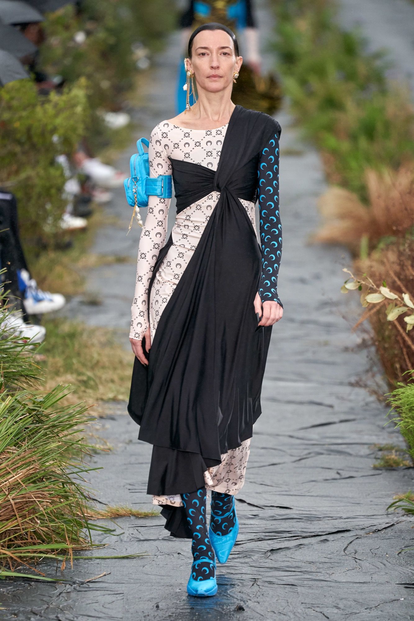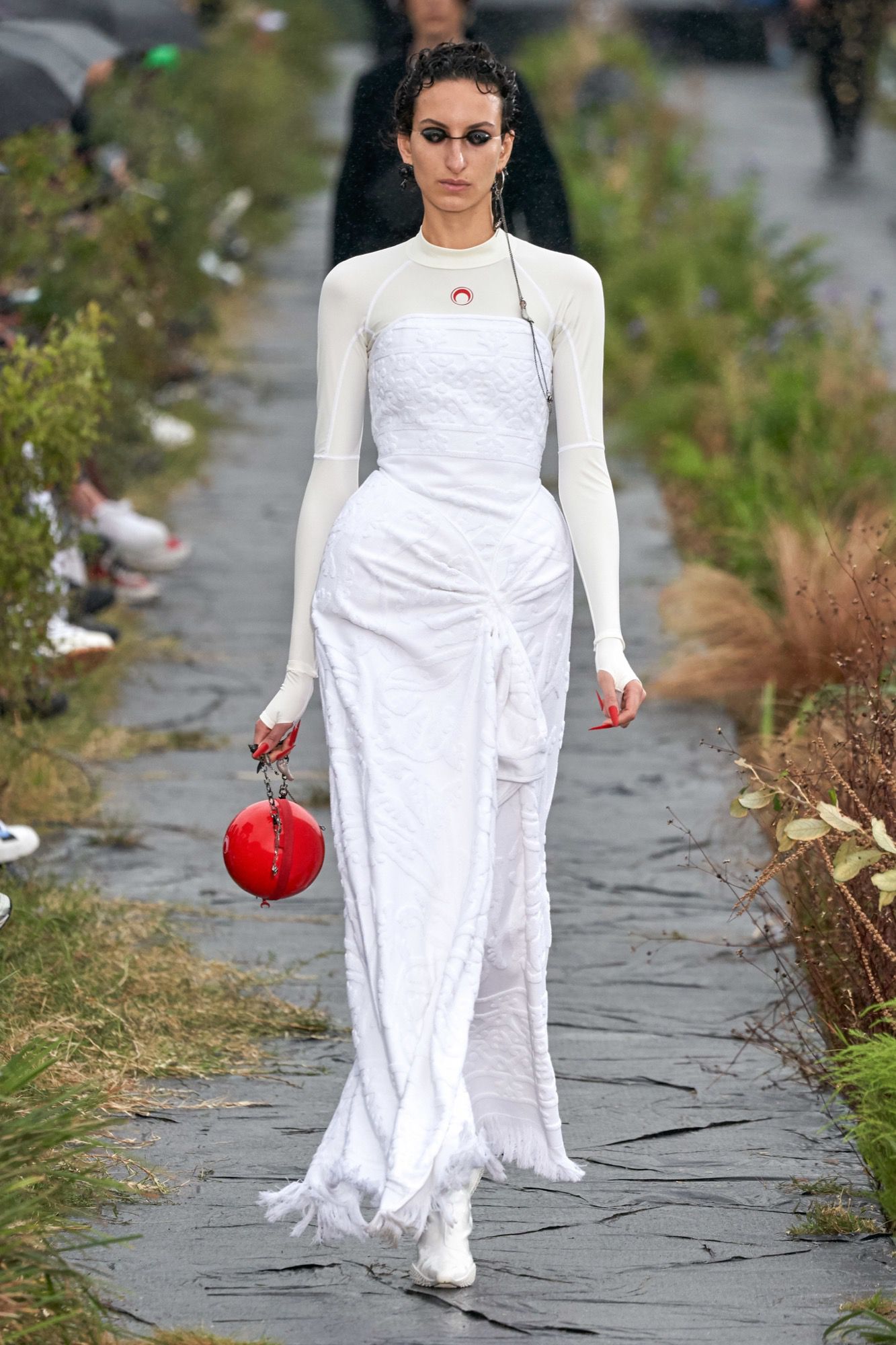 E' possibile introdurre il discorso della sostenibilità in un brand che ha già un'identità e un'estetica ben definite? Marine Serre dice di sì. Per la collezione SS20, intitolata Marée Noire, la giovane designer francese ha portato il pubblico nella periferia di Parigi, su una pista d’atletica trasformata in passerella sotto una pioggia battente. Quello che ha sfilato è un cast eterogeneo sia per razza, età e taglia, di sopravvissuti ad un apocalisse climatico. Una sorta di funerale al pianeta che si riflette nei look total black che hanno aperto lo show, un colore raramente utilizzato da Serre, ma che in questo caso descrive perfettamente quell’ansia e quel senso di colpa che accompagnano le riflessioni sulla sostenibilità, almeno nel mondo della moda. L'attenzione all'ambiente si concretizza nell'utilizzo di materiali e tessuti riciclati, impiegati per il 50% della collezione - numero ancora bassi, ma sicuramente rassicuranti. Essere riuscita a creare un'estetica così ben definita attraverso lunghi trench, top a collo alto e leggings super aderenti, ma soprattutto grazie a quel logo con la mezza luna, poteva rivelarsi un'arma a doppio taglio per Serre, un terreno sicuro su cui giocare per le prossime stagioni. E' stato rincuorante veder scendere in passerella una nuova idea di tailoring, ancora non totalmente matura, ma non per questo non degna di nota.