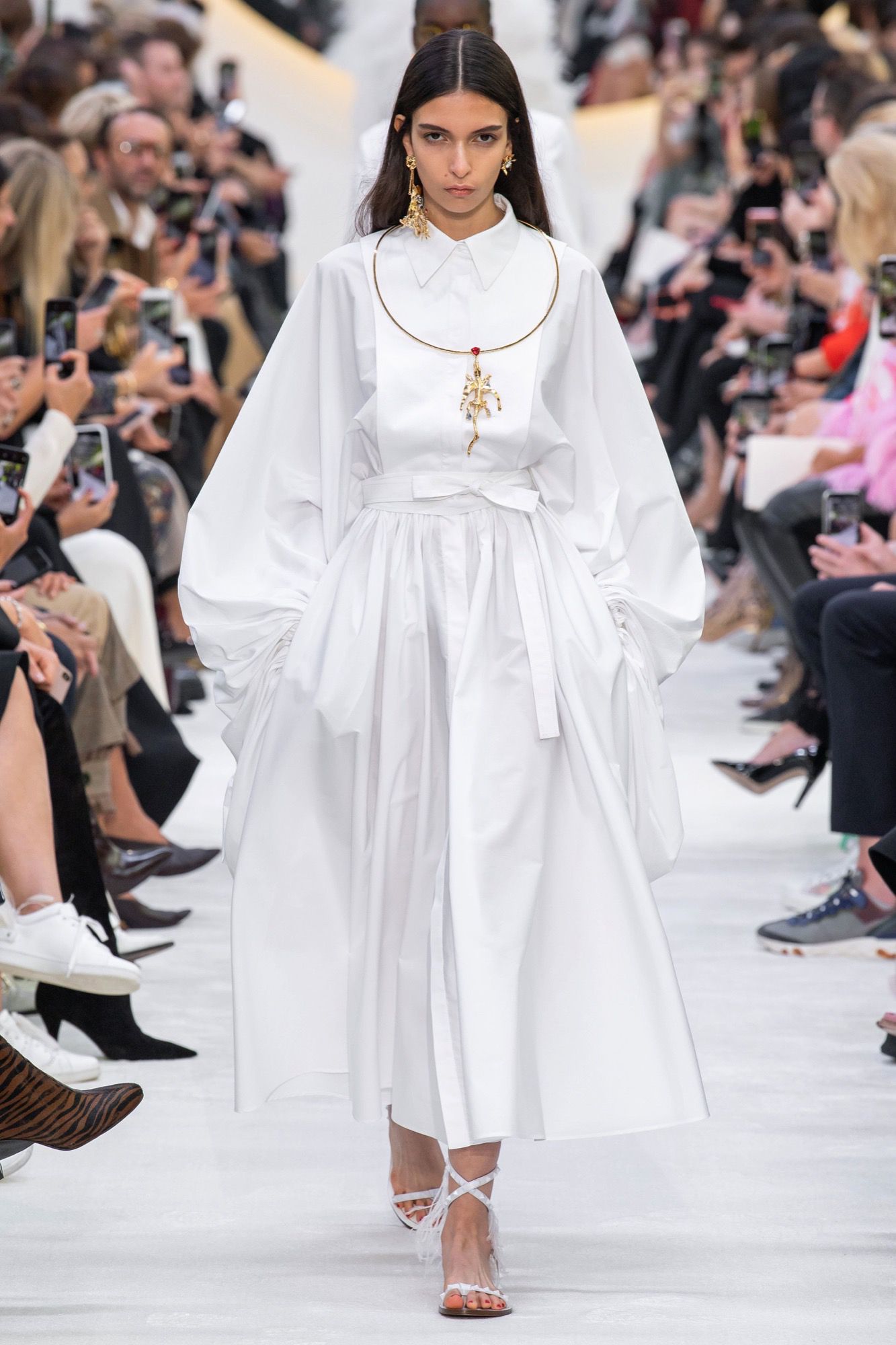 Stagione dopo stagione, Pierpaolo Piccioli sta dando una consistenza e un'identità alla Maison Valentino in grado di oltrepassare i confini della Couture per entrare nella vita reale, mantenendo però quel carattere magico e sognante che è l'essenza stessa della Haute Couture. Si tratta di un equilibrio precario, difficile da raggiungere e ancor più da mantenere, tuttavia Piccioli sembra non avere particolari difficoltà nella sua missione. In questa collezione, gioiosa e leggera, la camicia bianca diventa la tela designata su cui giocare con volumi, sovrapposizioni e tagli presi dal mondo della Couture: lo show si apre con 12 look total white, quasi un omaggio alla collezione immacolata che Valentino Garavani aveva disegnato nel 1968, una proposta che avrebbe poi cambiato per sempre il destino della Maison. La storia di Valentino Piccioli l'ha già cambiata e continua a farlo, questa volta con abiti e gonne fluide, leggere, trasparenti, ruches enormi che sembrano delle nuvole, plissé in colori fluo che riassumono presente e passato, inserti di piume, lurex e pizzi che trasportano la collezione nella proposta ancora più luxury.