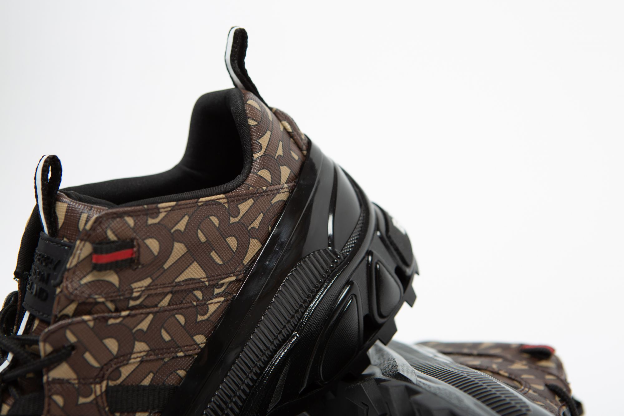 Il look tecnico della scarpa è dovuto al melange di materiali, dalla già citata e-canvas fino a elementi in cuoio e gomma. La parte inferiore della tomaia è caratterizzata da un copriscarpe lucido che riporta alla mente gli stivali antipioggia. Non a caso la collezione in cui le Arthur hanno fatto il loro debutto era intitolata “Tempest”. Una suola rialzata di poliuretano forato completa la silhouette della scarpa, facendola assomigliare a un vero e proprio ibrido fra una sneaker high-top e uno stivale gommato. Sul tallone, inoltre, è presente una rifinitura a rilievo che reca il marchio della maison. Il monogramma Burberry sul puntale completa la scarpa insieme alla placca gommata e a una fettuccia sulla linguetta.