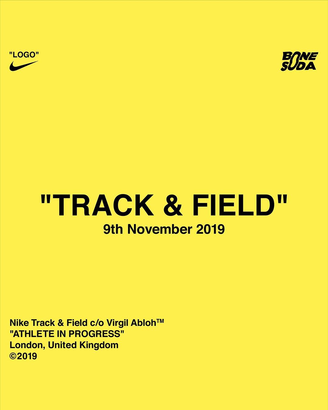 Dopo la collezione ATHLETE IN PROGRESS dello scorso giugno, Virgil Abloh torna a collaborare con Nike, curando il NIKE "TRACK & FIELD" C/O VIRGIL ABLOH™ ©2019, ultimo capitolo della lunga partnership con il brand americano. L’evento è organizzato da Bone Soda, studio creativo ed etichetta discografica con sede a Londra che spazia in diversi ambiti, dalla musica al design, organizzando eventi di vario genere (a settembre ha persino curato un torneo di FIFA20 in collaborazione con Playstation).
