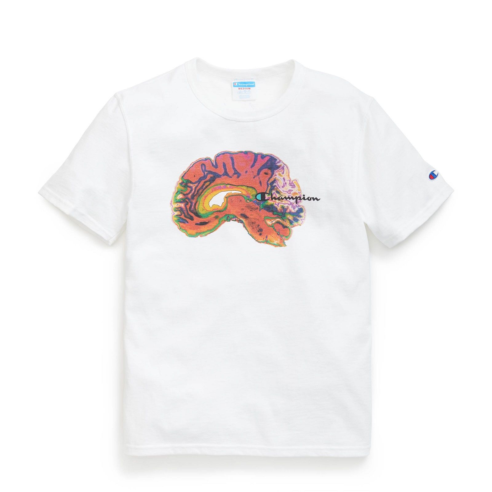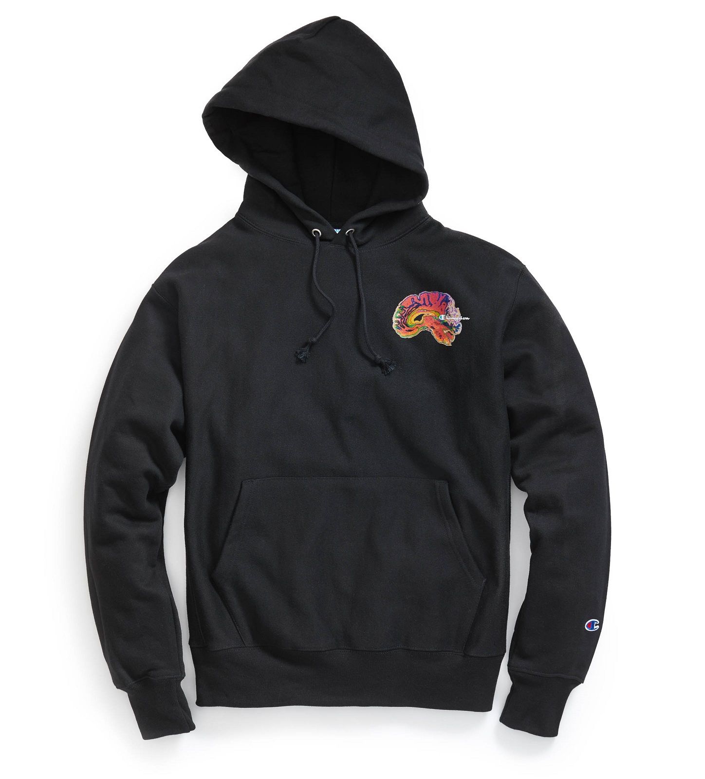 La grafica creata da Sabbat è stata ispirata al programma “Emerging Artists” di Art Start e ai creativi che ne fanno parte. Si compone di due elementi: quella frontale rappresenta la tomografia colorata di un cervello insieme al logo Champion, mentre quella sulla schiena porta la firma di Sabbat insieme a una sua citazione che riflette il pensiero del creativo newyorchese sulle dinamiche fra fantasia individuale e lavoro di squadra: