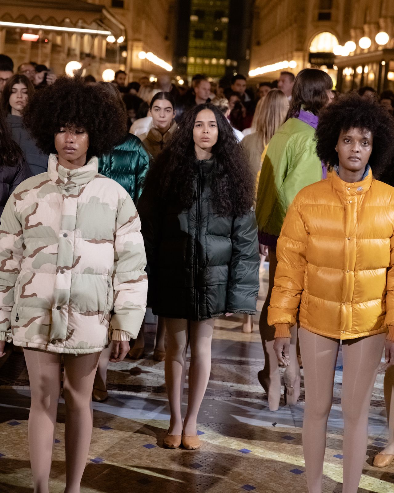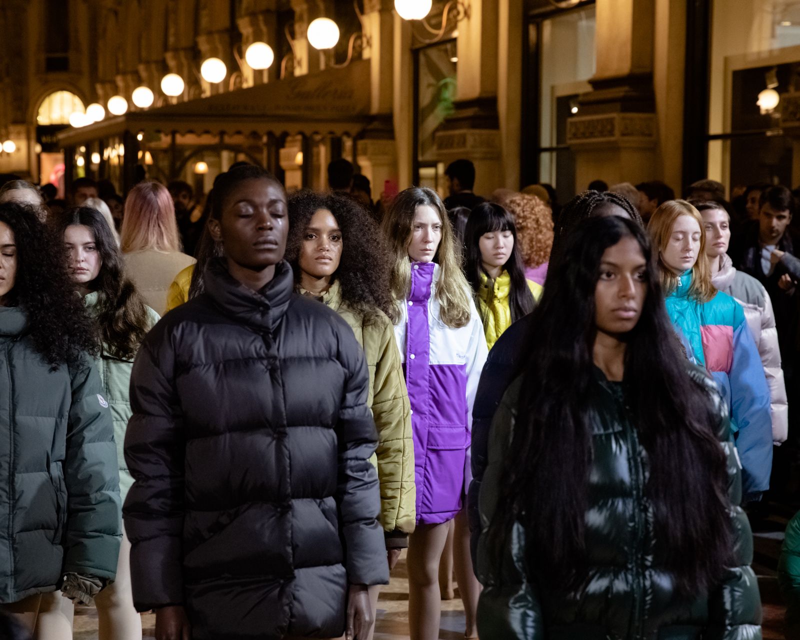 L’intensità poetica e il colpo d’occhio della performance è stato notevole, le luci e la raffinatezza della galleria illuminavano i piumini simbolo del brand, rinforzando la visione artistica di Moncler.