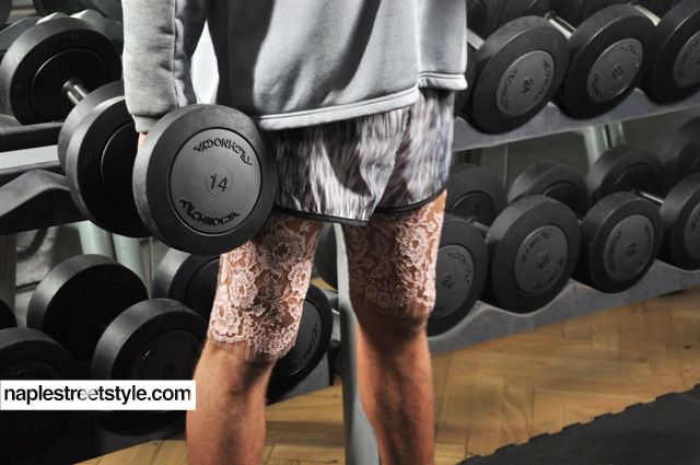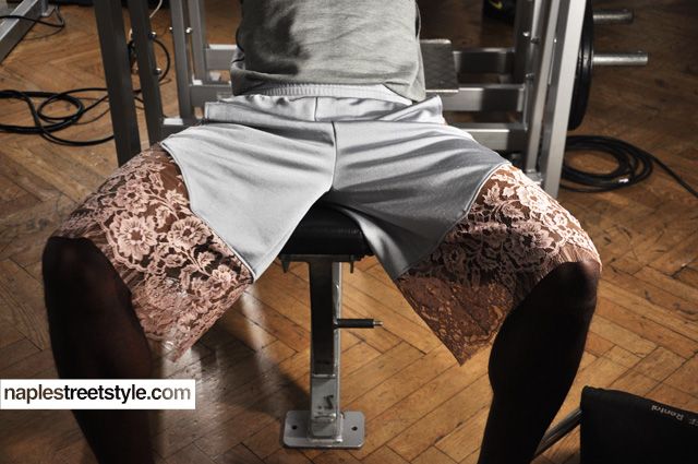 We do space at lace and loved pink, this time more subdued than in the past, which refer to further strong contradictions that govern the whole show: Olympic and vigorous athletes in delicate lace shorts, strong muscles and sheer eye-catching, street gangsta and classical music.