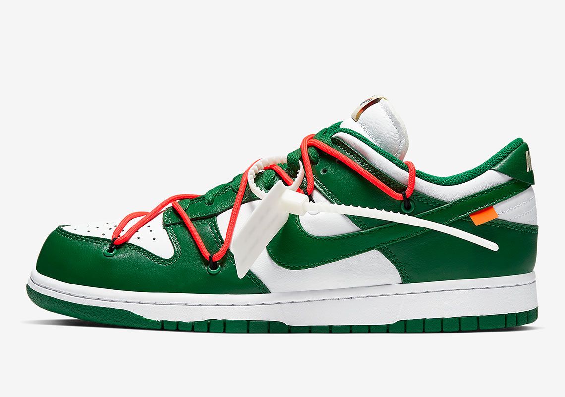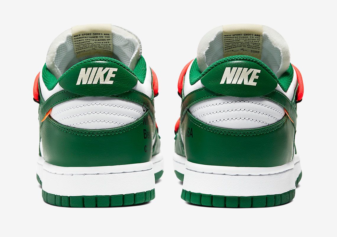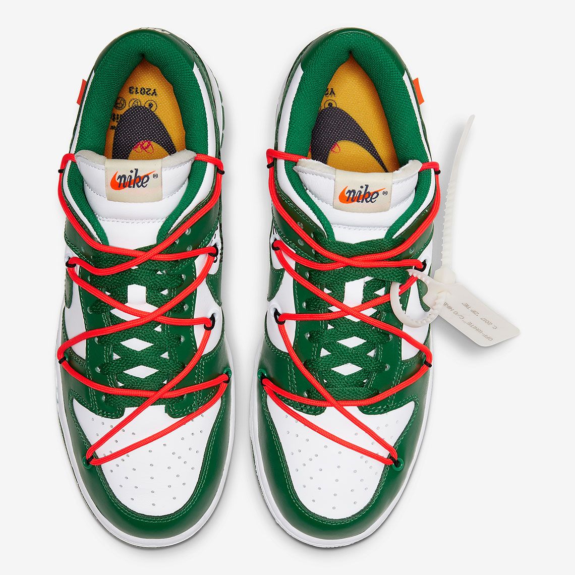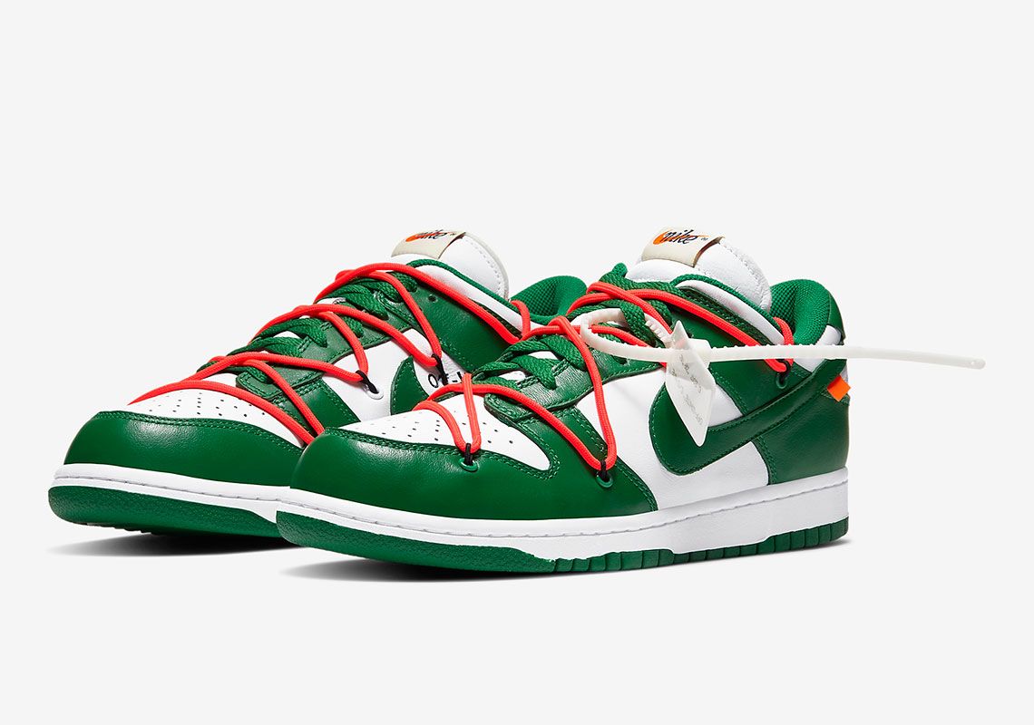 L’ Off-White™ x Nike Dunk Low Pack si presenta in tre coloway: “Pine Green”, “University Gold” e “University Red”. Tutte e tre le scarpe presentano una tomaia in pelle, con una linguetta di gommapiuma esposta e un sistema di allaccio aggiuntivo e ispirato alle scarpe da trekking, che è ormai diventato una delle “firme” delle collabo Off-White™. Ulteriori dettagli sono il branding stampato sul lato interno delle sneaker, le etichette in stile retrò sulla linguetta, le stringhe con la scritta “Shoelaces”, il tag bianco in plastica e la piccola etichetta arancione cucita sotto lo swoosh.