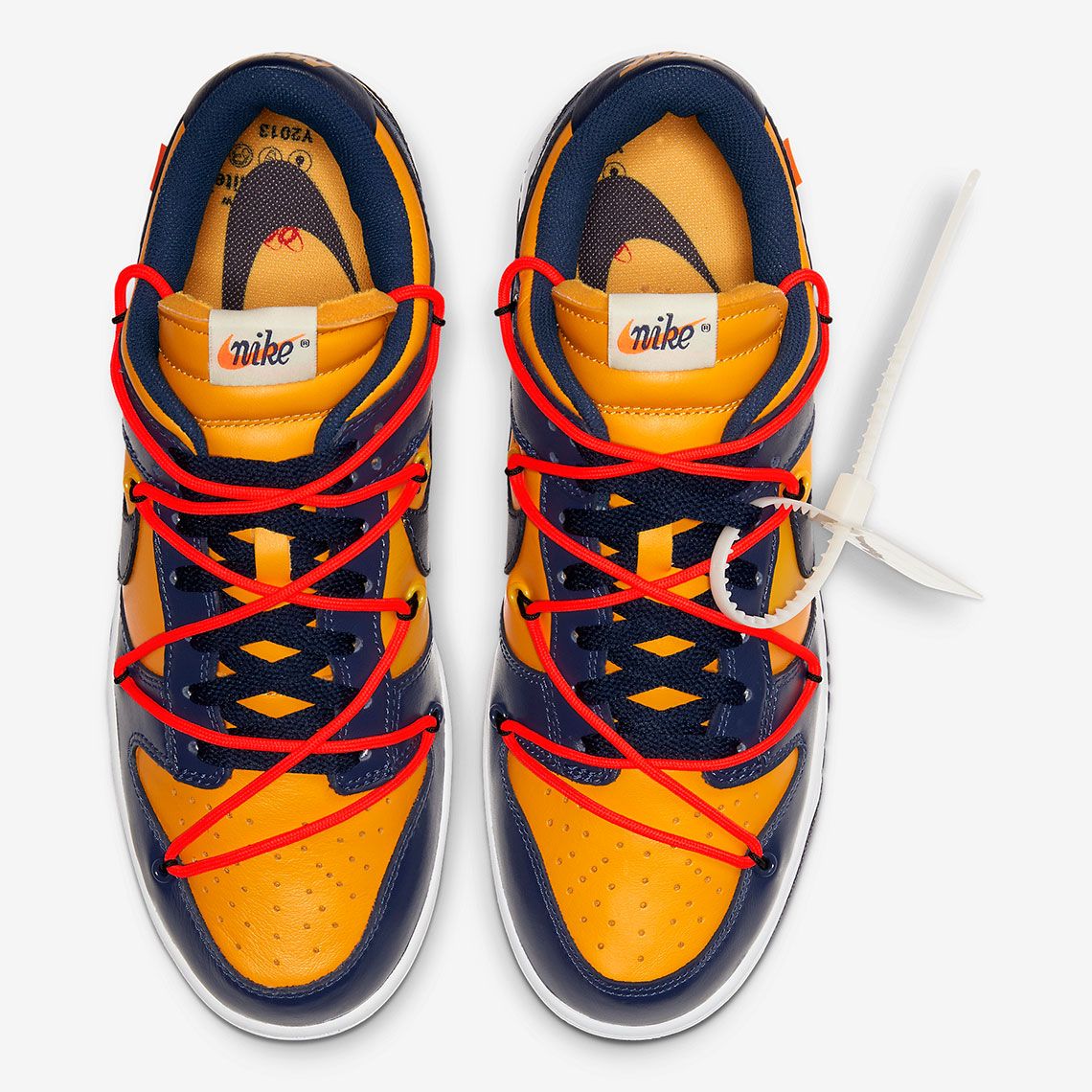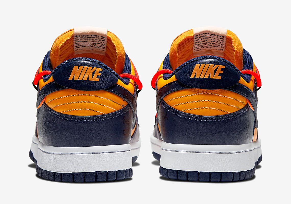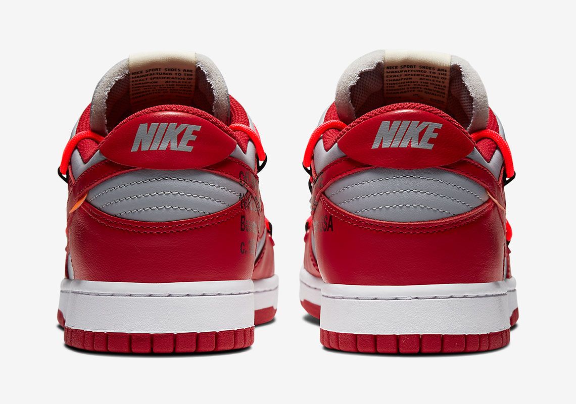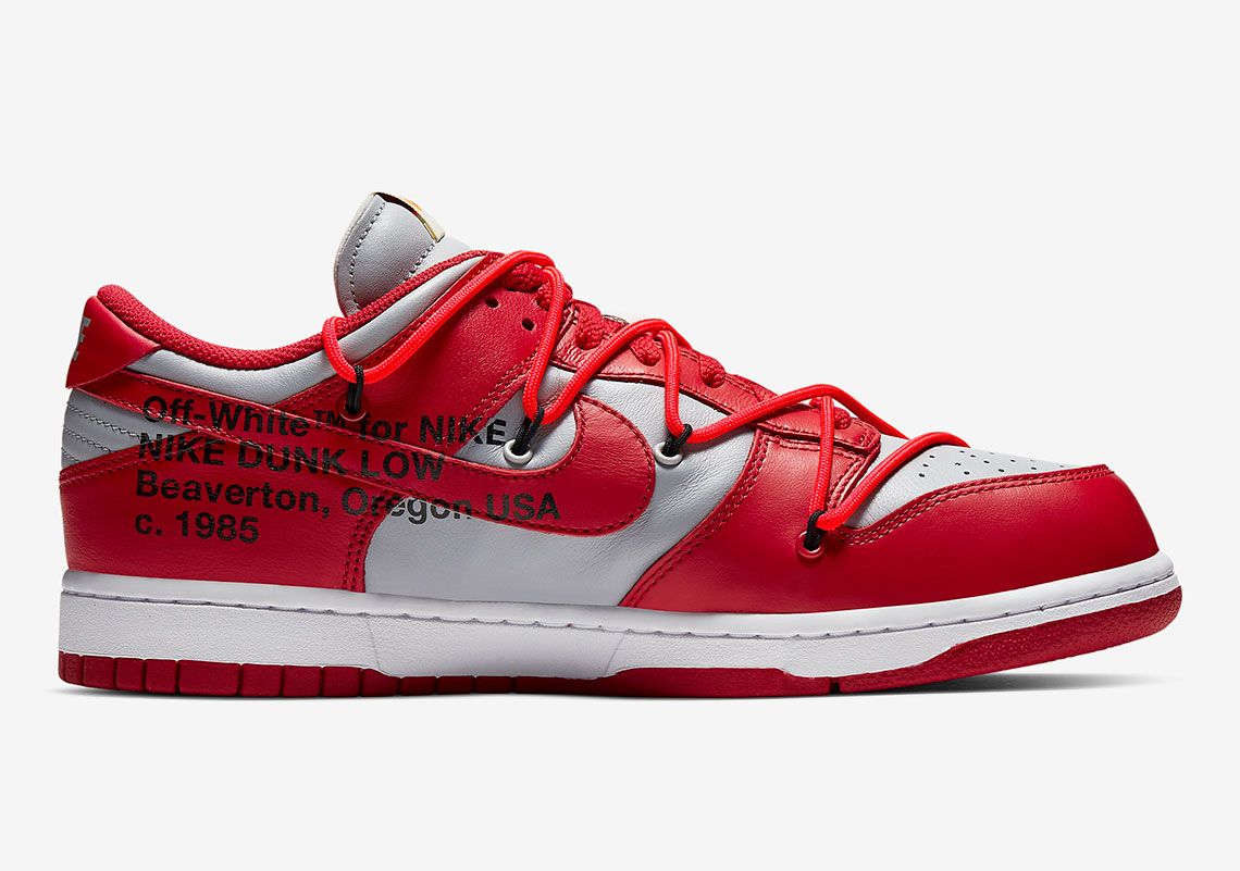 L’ Off-White™ x Nike Dunk Low Pack si presenta in tre coloway: “Pine Green”, “University Gold” e “University Red”. Tutte e tre le scarpe presentano una tomaia in pelle, con una linguetta di gommapiuma esposta e un sistema di allaccio aggiuntivo e ispirato alle scarpe da trekking, che è ormai diventato una delle “firme” delle collabo Off-White™. Ulteriori dettagli sono il branding stampato sul lato interno delle sneaker, le etichette in stile retrò sulla linguetta, le stringhe con la scritta “Shoelaces”, il tag bianco in plastica e la piccola etichetta arancione cucita sotto lo swoosh.