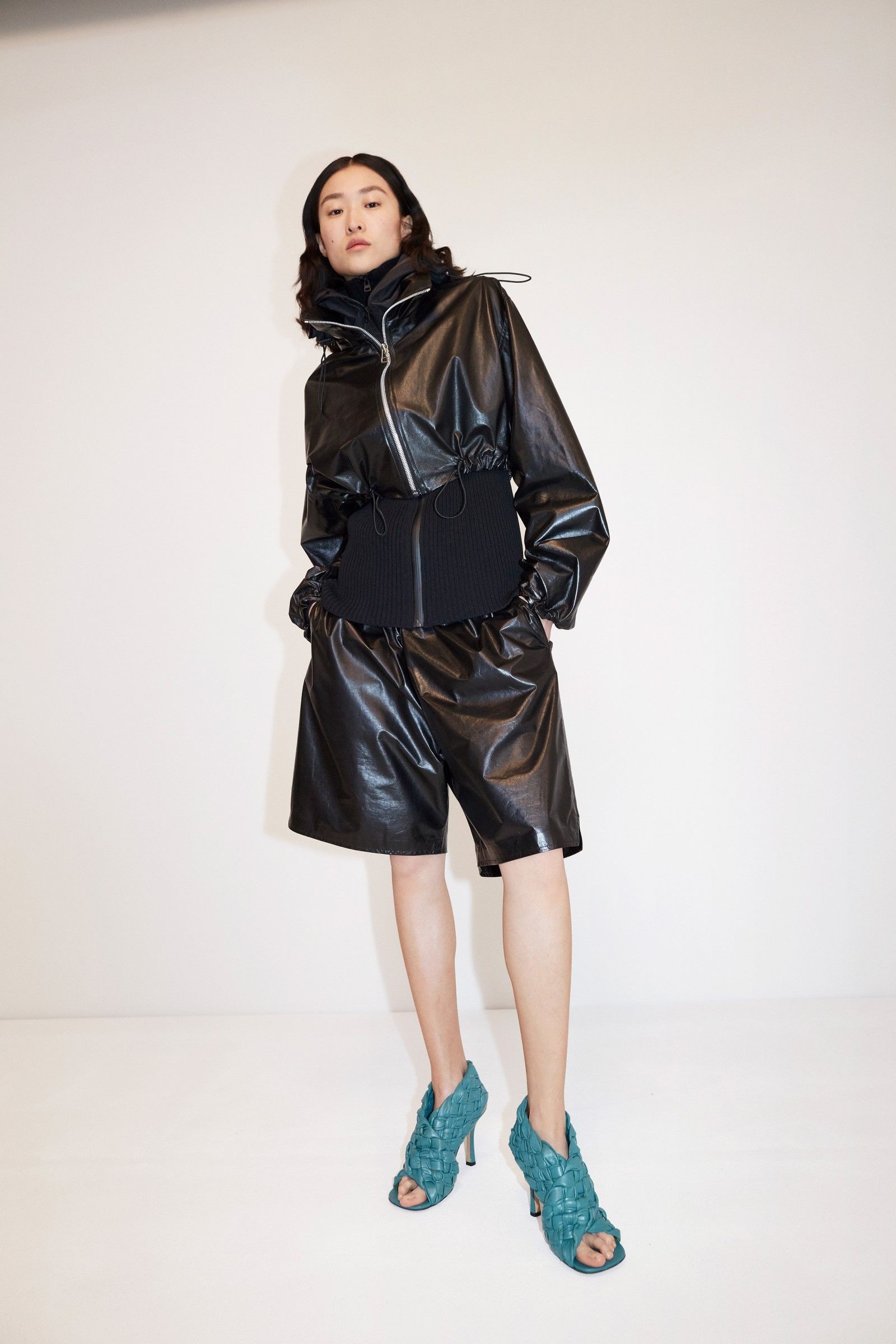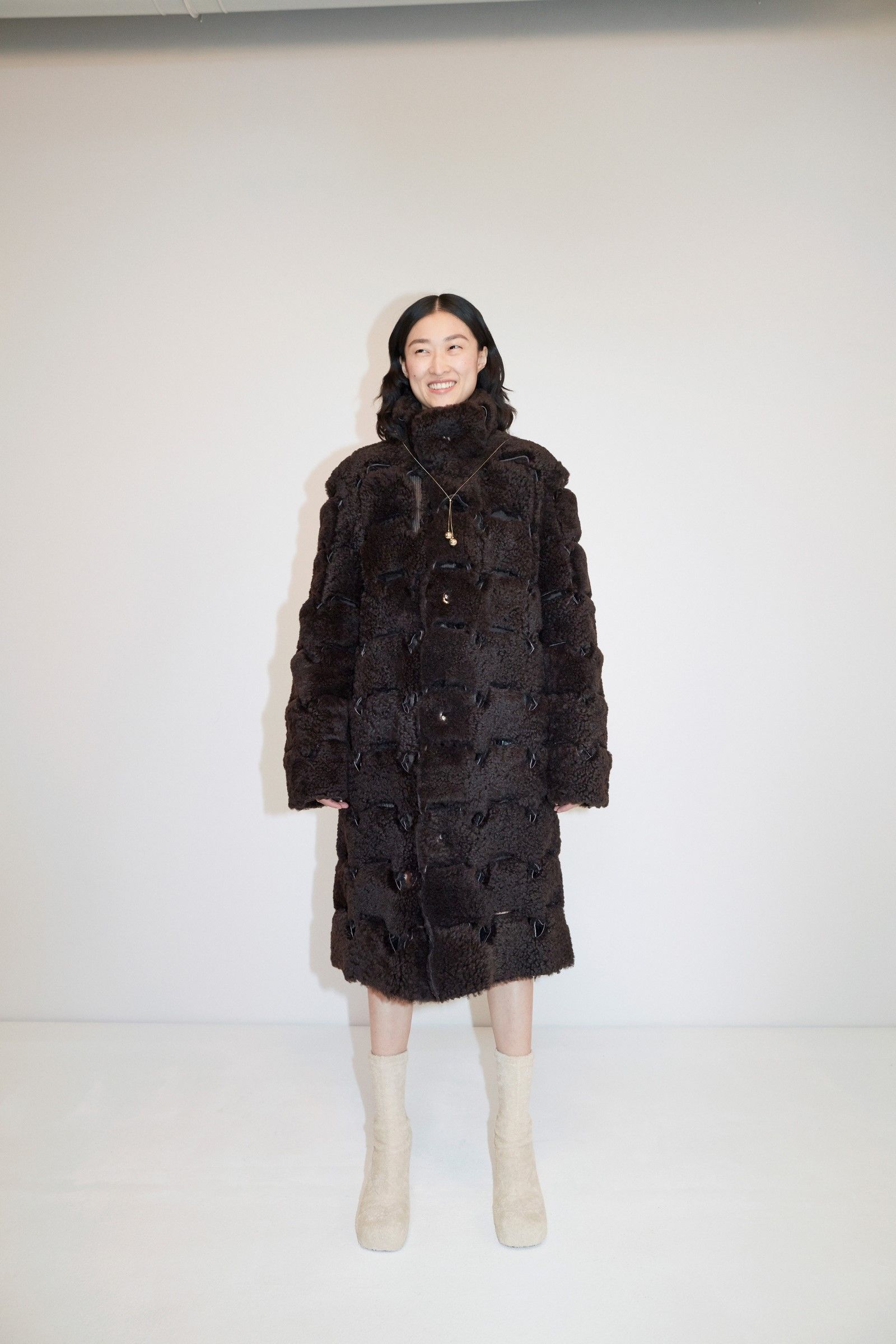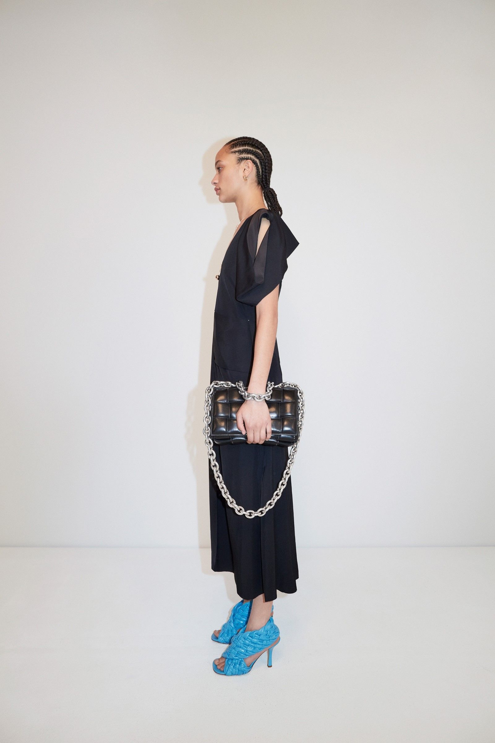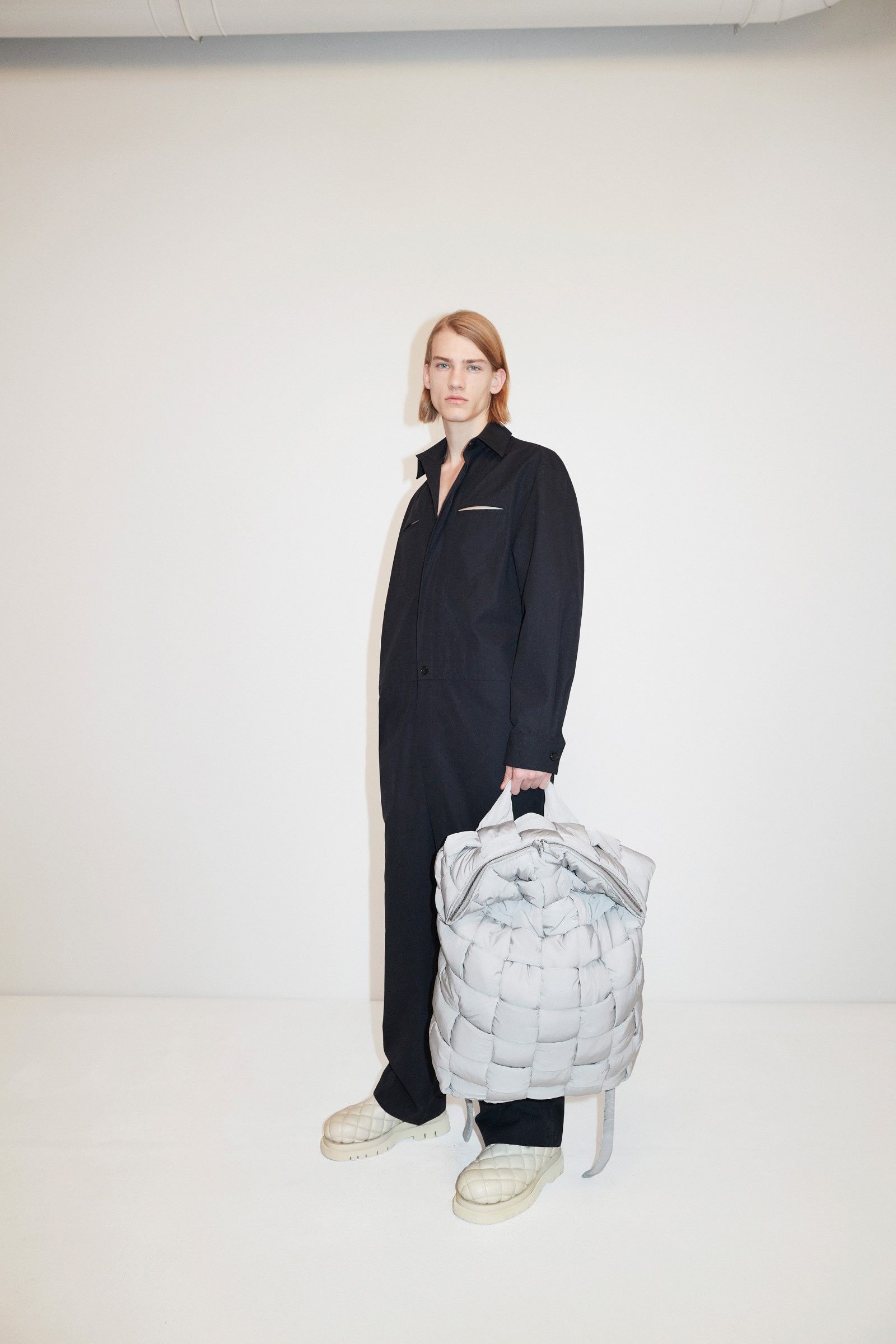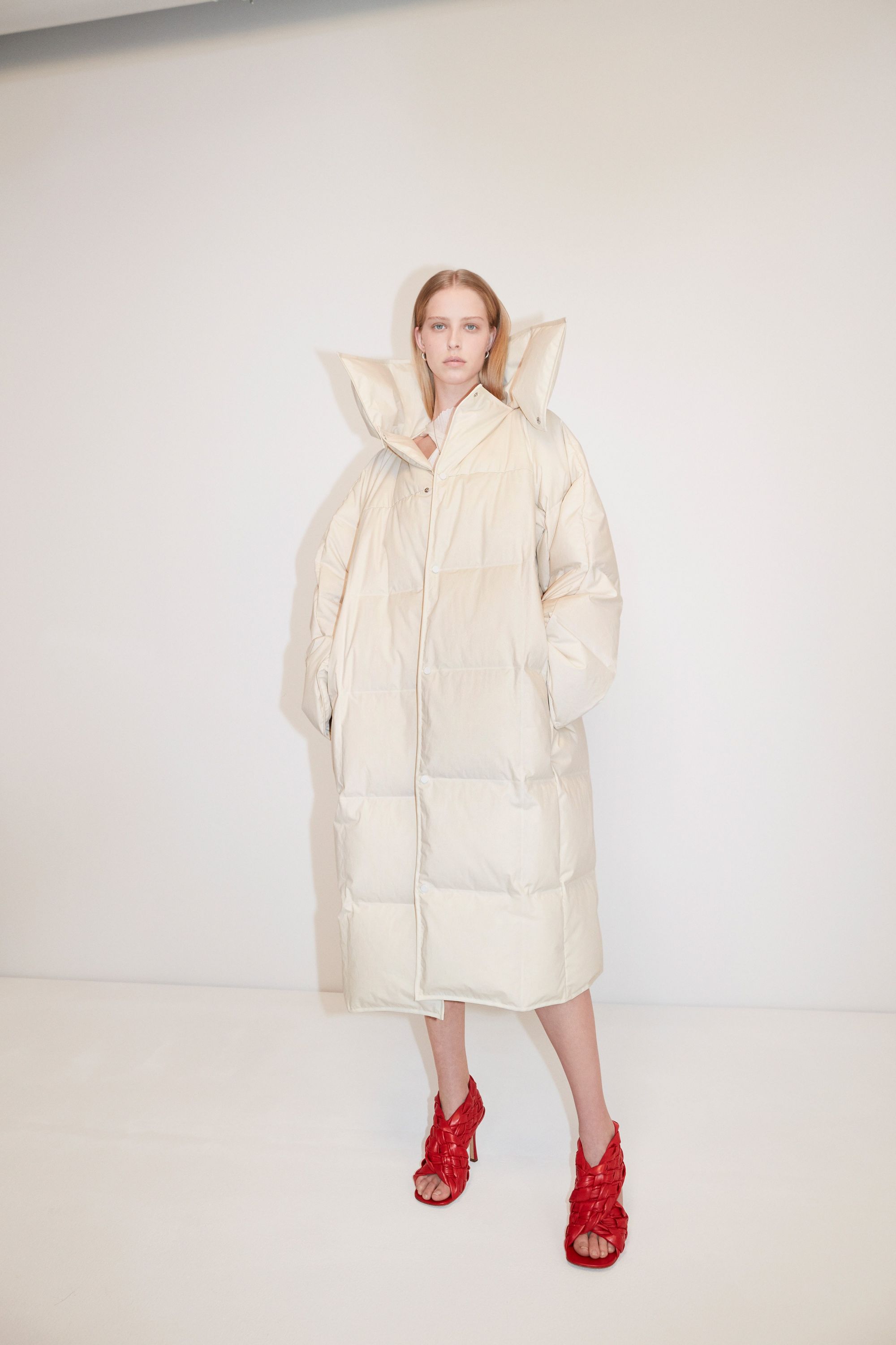 Il nero è ancora il colore dominante dei look, che viene alleggerito però da sfumature intense di turchese, rosso, rosa e giallo. Le linee semplici degli abiti sono accostate a scarpe e accessori dei volumi gonfi, tondeggianti. Il motivo intrecciato, pietra angolare dell’identità di Bottega Veneta, viene applicato non solo al cuoio ma anche a pellicce e piumini che, dietro un’apparenza morbida e priva di fronzoli, nascondono una struttura minuziosa e intricata. Oltre che alla fattura stessa degli abiti, la stravaganza è relegata ai tagli ampi e alla texture dei materiali, specialmente il cuoio, al layering e a dettagli come tasche e bottoni, dalla forma inusuale e massimalista. Sembrerebbe che il principio guida seguito da Lee sia stato quello di evitare, per quanto possibile, cuciture e altre “interruzioni” sulla superficie dei capi.