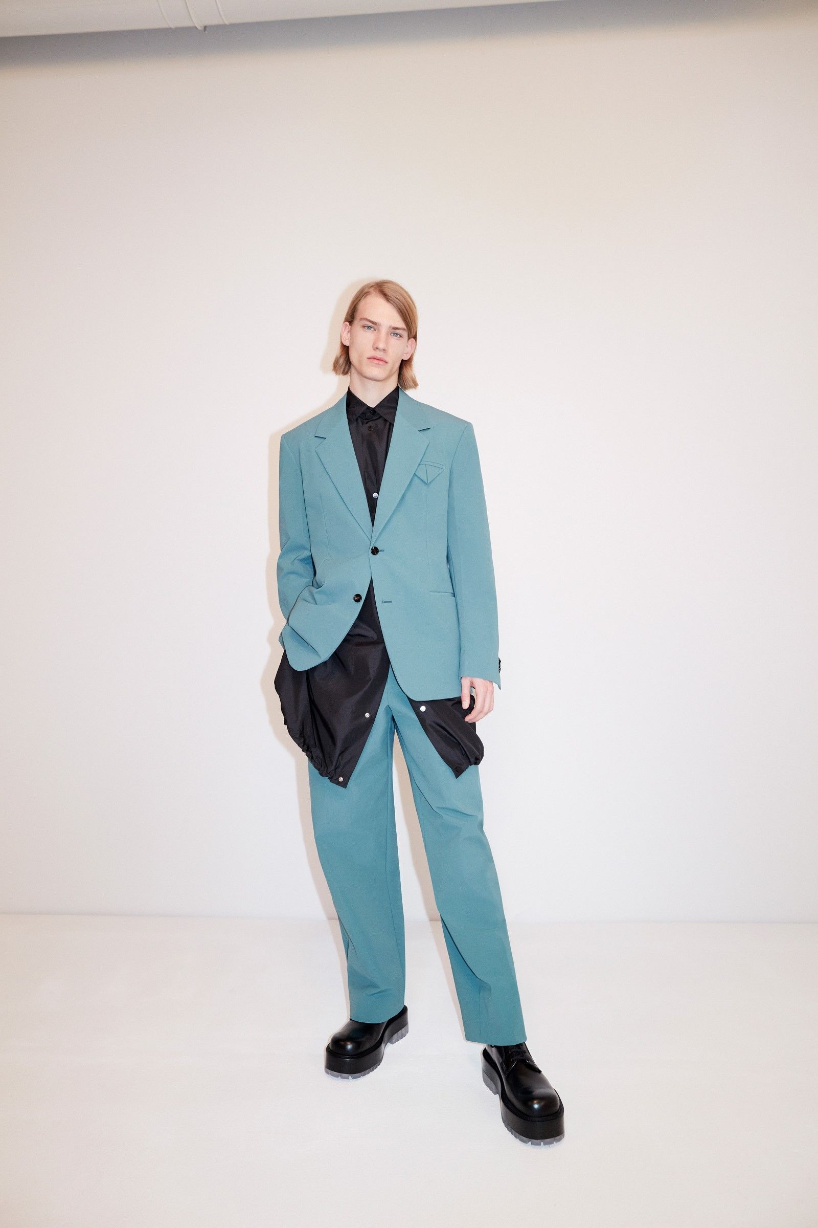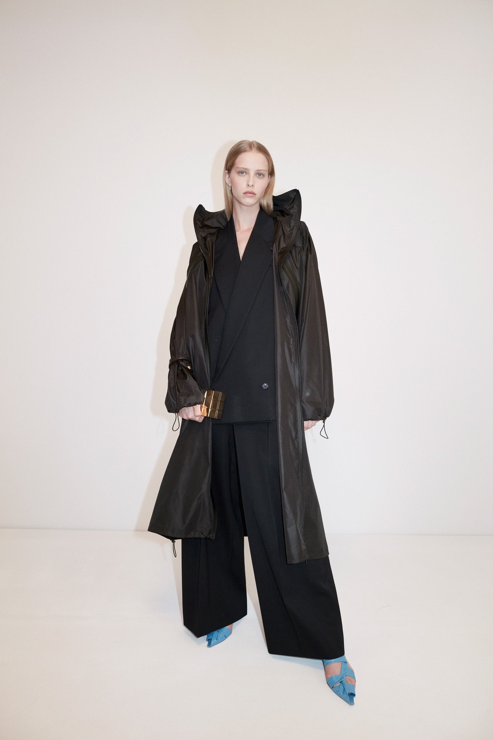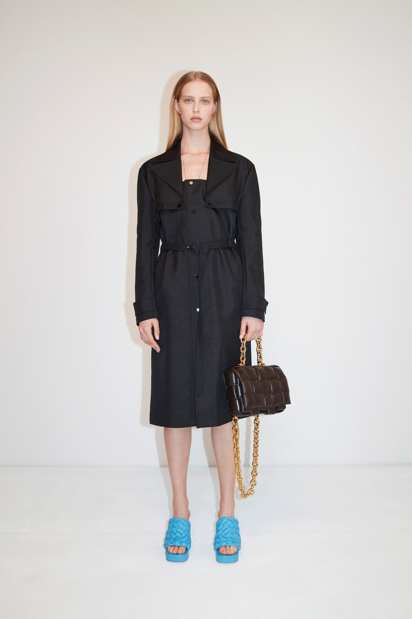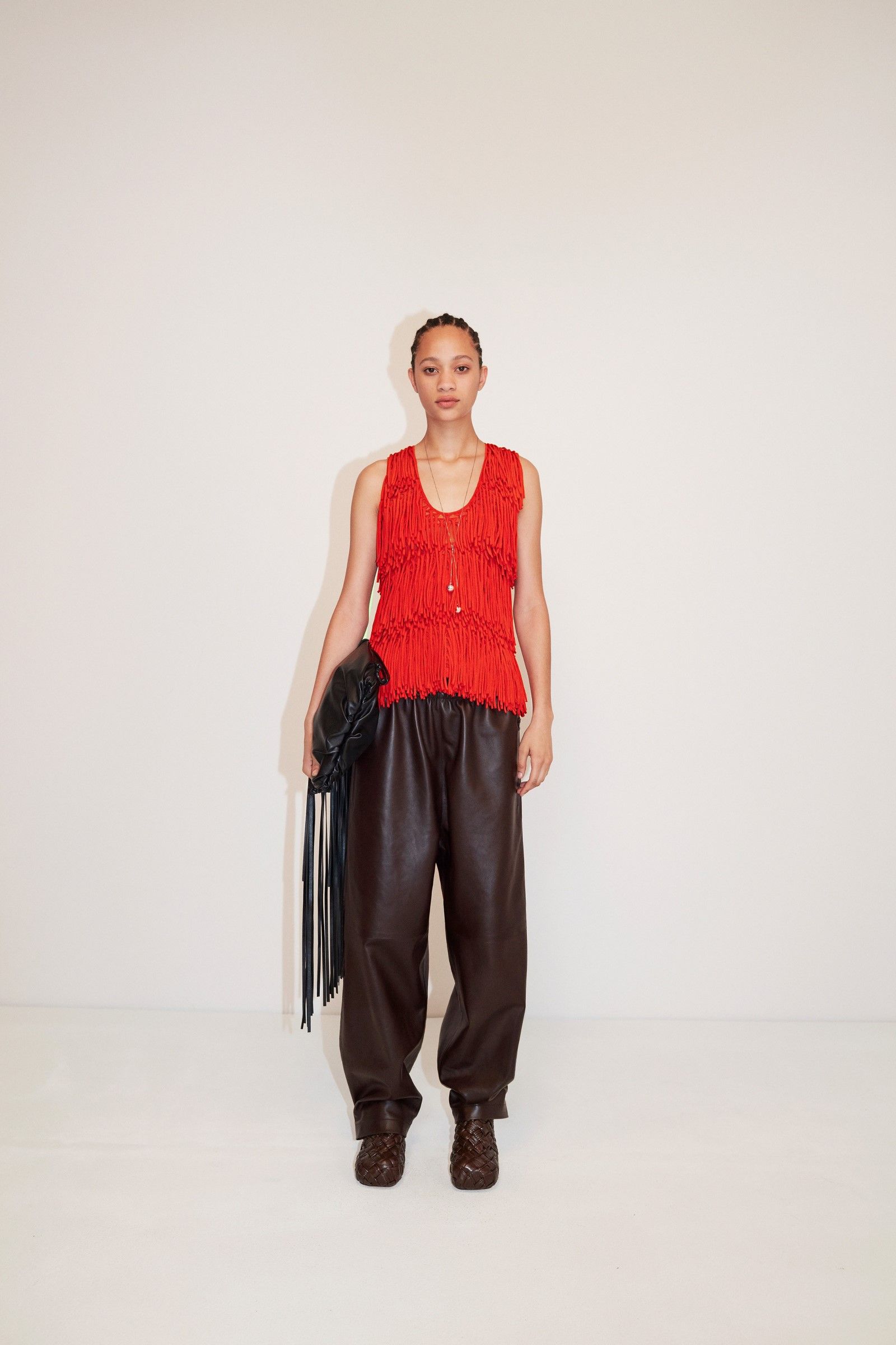Il nero è ancora il colore dominante dei look, che viene alleggerito però da sfumature intense di turchese, rosso, rosa e giallo. Le linee semplici degli abiti sono accostate a scarpe e accessori dei volumi gonfi, tondeggianti. Il motivo intrecciato, pietra angolare dell’identità di Bottega Veneta, viene applicato non solo al cuoio ma anche a pellicce e piumini che, dietro un’apparenza morbida e priva di fronzoli, nascondono una struttura minuziosa e intricata. Oltre che alla fattura stessa degli abiti, la stravaganza è relegata ai tagli ampi e alla texture dei materiali, specialmente il cuoio, al layering e a dettagli come tasche e bottoni, dalla forma inusuale e massimalista. Sembrerebbe che il principio guida seguito da Lee sia stato quello di evitare, per quanto possibile, cuciture e altre “interruzioni” sulla superficie dei capi.