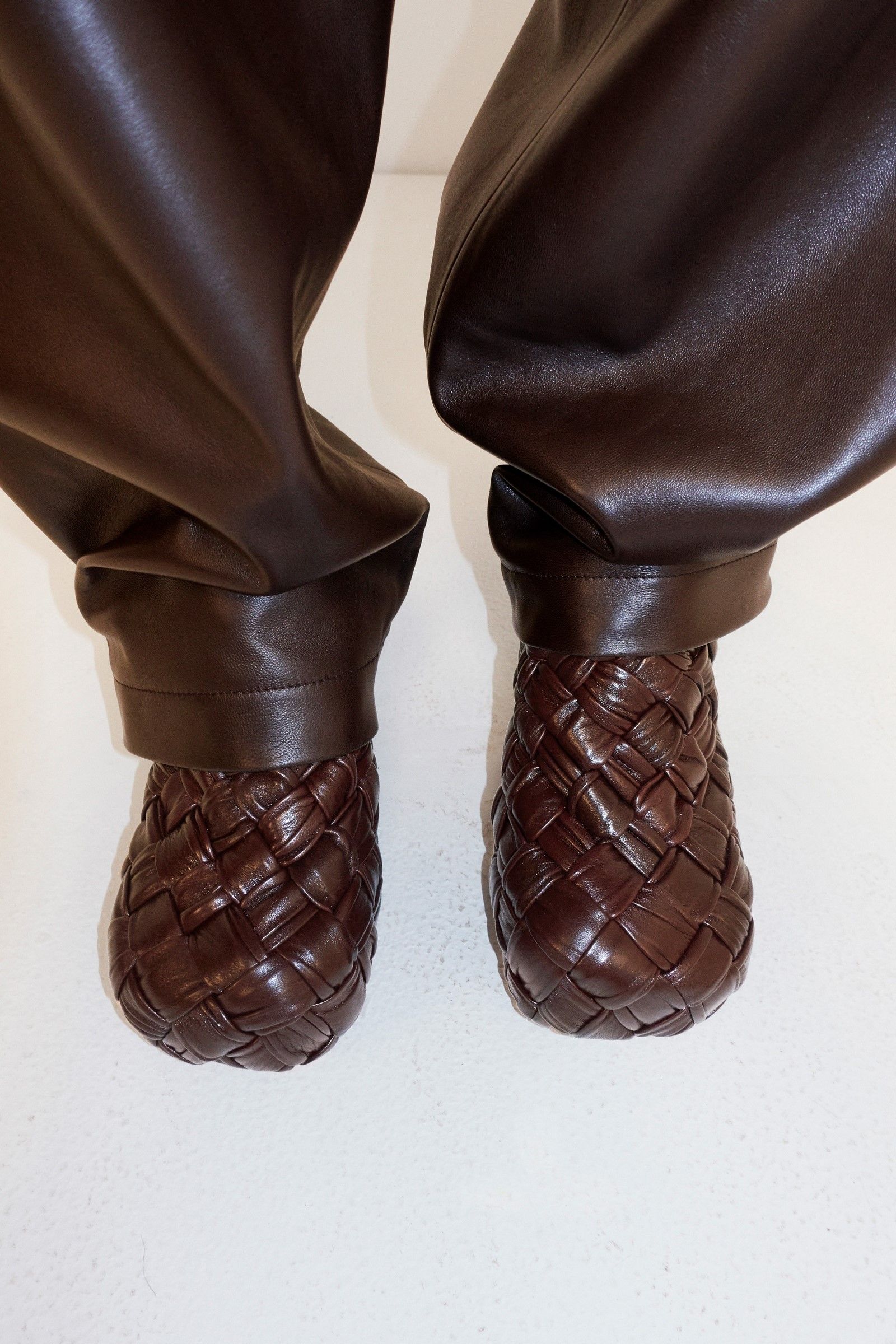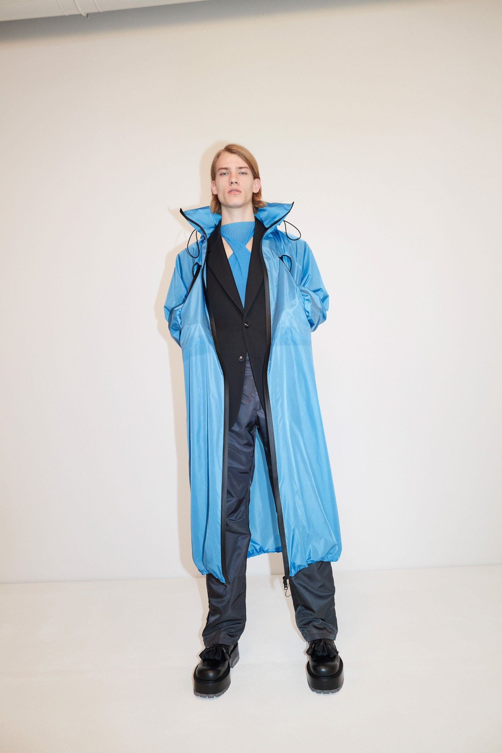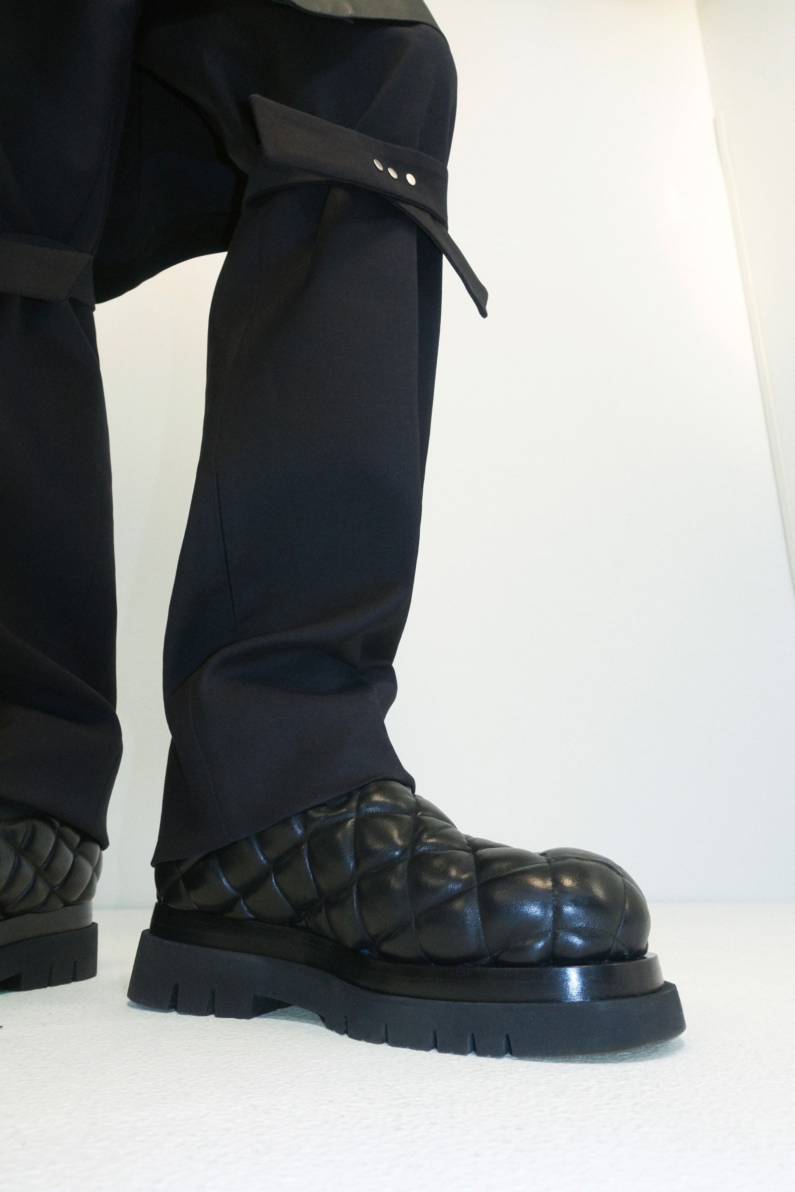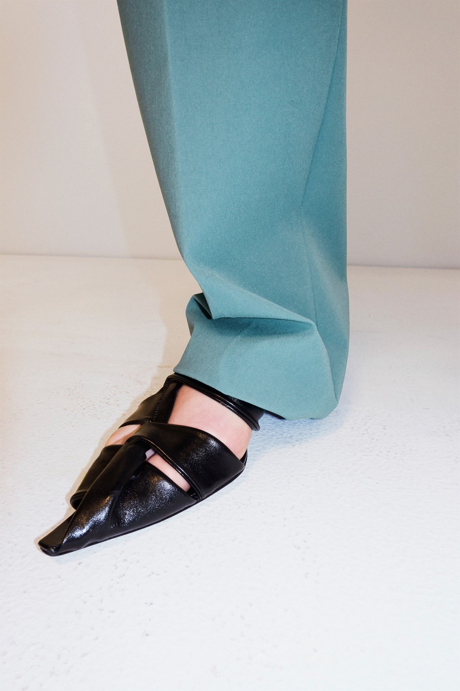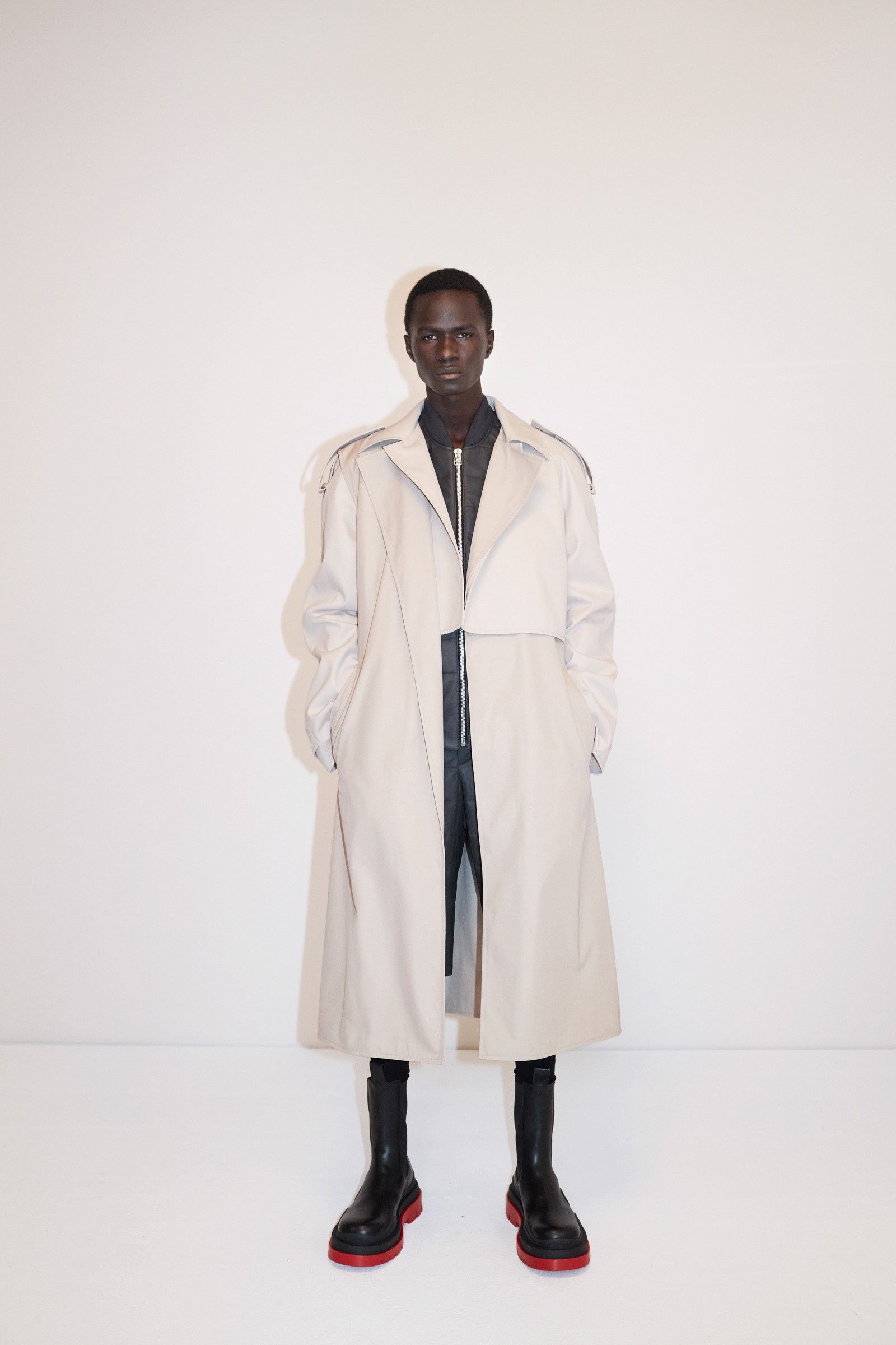 Il nero è ancora il colore dominante dei look, che viene alleggerito però da sfumature intense di turchese, rosso, rosa e giallo. Le linee semplici degli abiti sono accostate a scarpe e accessori dei volumi gonfi, tondeggianti. Il motivo intrecciato, pietra angolare dell’identità di Bottega Veneta, viene applicato non solo al cuoio ma anche a pellicce e piumini che, dietro un’apparenza morbida e priva di fronzoli, nascondono una struttura minuziosa e intricata. Oltre che alla fattura stessa degli abiti, la stravaganza è relegata ai tagli ampi e alla texture dei materiali, specialmente il cuoio, al layering e a dettagli come tasche e bottoni, dalla forma inusuale e massimalista. Sembrerebbe che il principio guida seguito da Lee sia stato quello di evitare, per quanto possibile, cuciture e altre “interruzioni” sulla superficie dei capi.