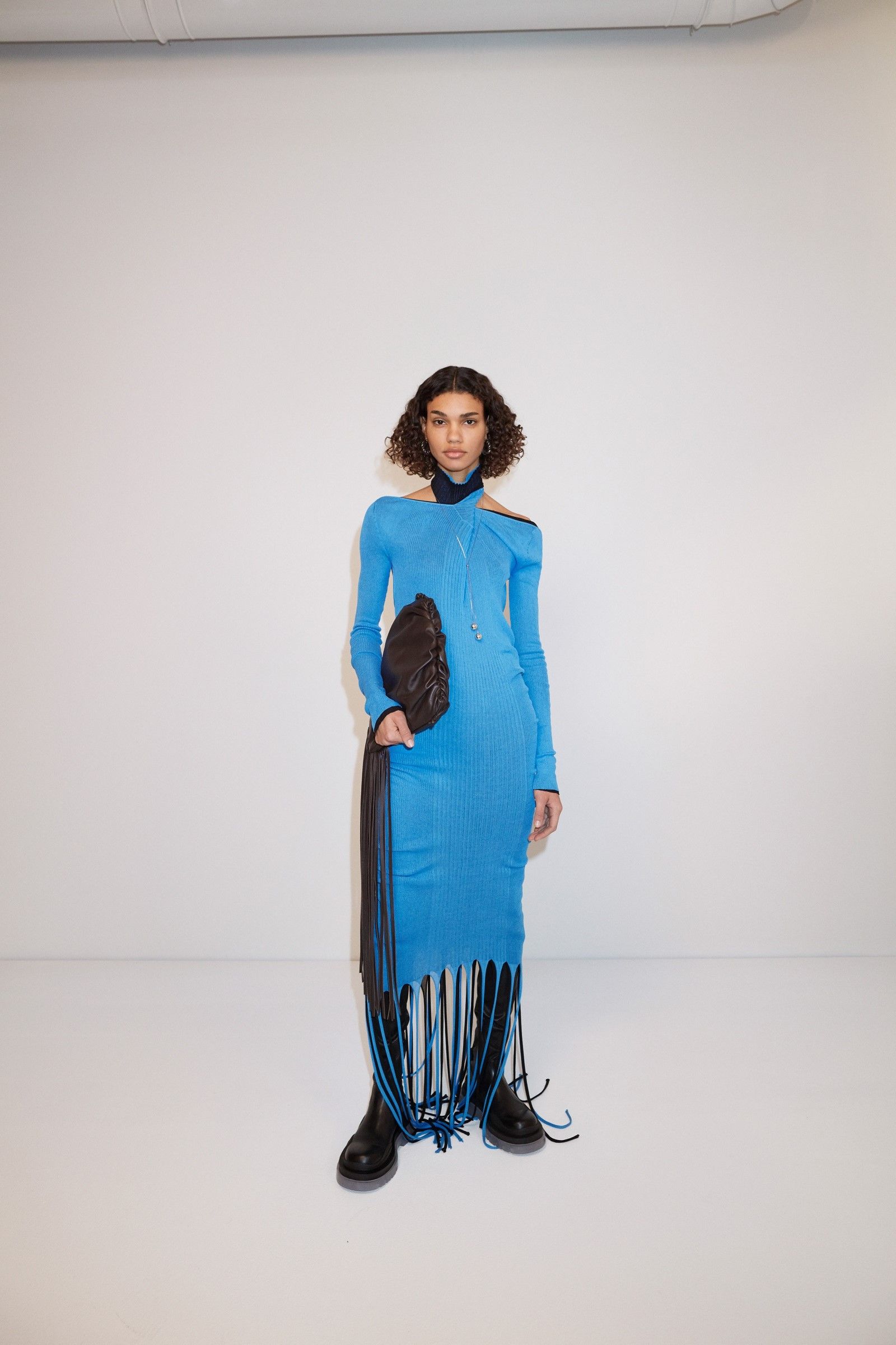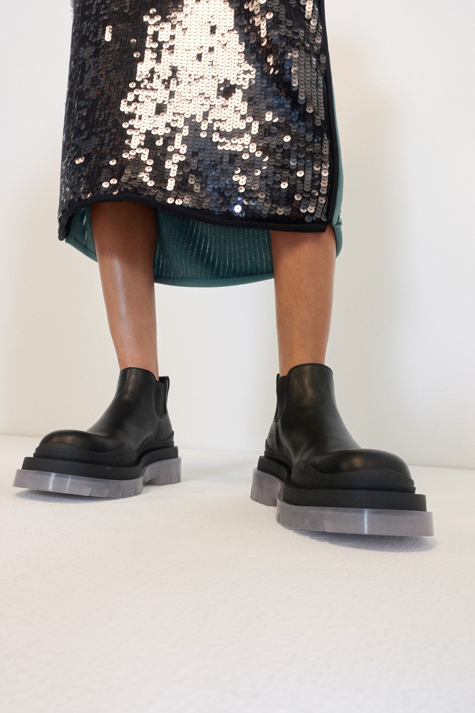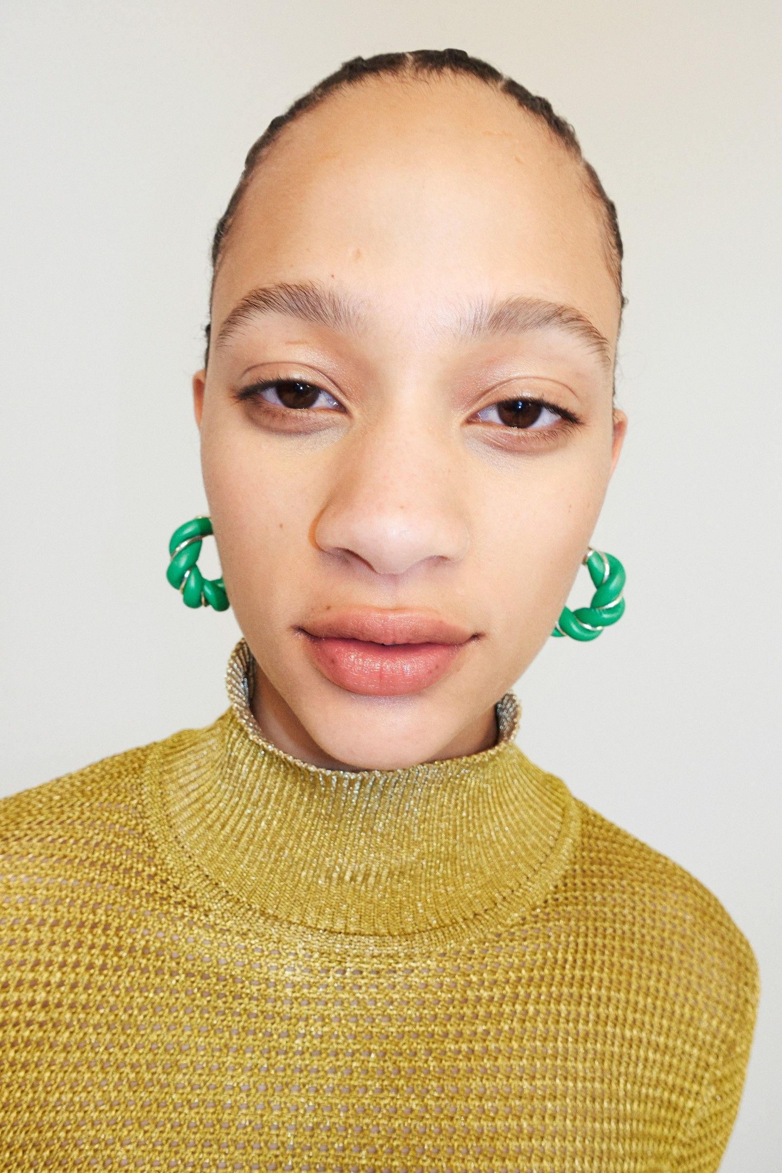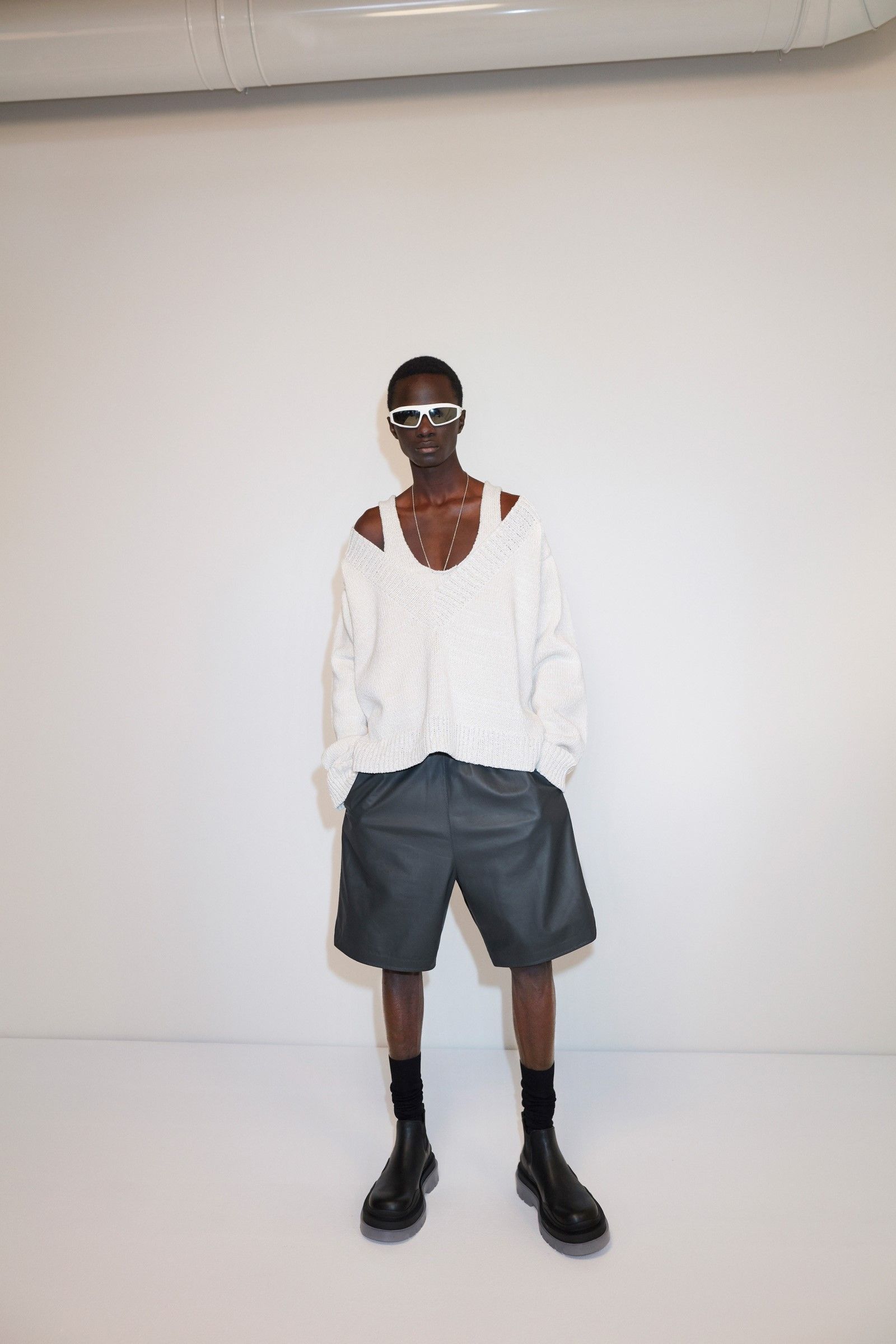 Il nero è ancora il colore dominante dei look, che viene alleggerito però da sfumature intense di turchese, rosso, rosa e giallo. Le linee semplici degli abiti sono accostate a scarpe e accessori dei volumi gonfi, tondeggianti. Il motivo intrecciato, pietra angolare dell’identità di Bottega Veneta, viene applicato non solo al cuoio ma anche a pellicce e piumini che, dietro un’apparenza morbida e priva di fronzoli, nascondono una struttura minuziosa e intricata. Oltre che alla fattura stessa degli abiti, la stravaganza è relegata ai tagli ampi e alla texture dei materiali, specialmente il cuoio, al layering e a dettagli come tasche e bottoni, dalla forma inusuale e massimalista. Sembrerebbe che il principio guida seguito da Lee sia stato quello di evitare, per quanto possibile, cuciture e altre “interruzioni” sulla superficie dei capi.