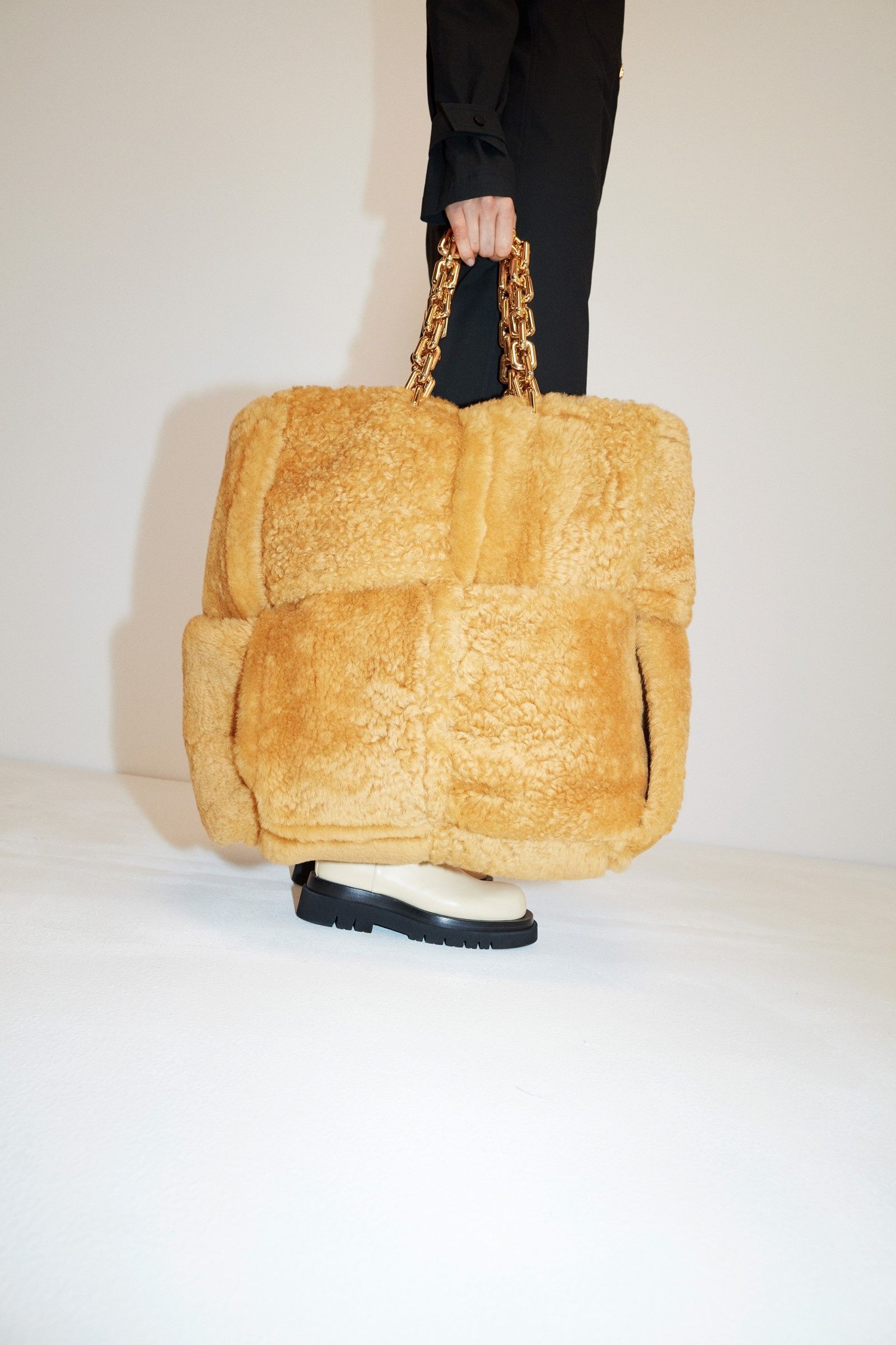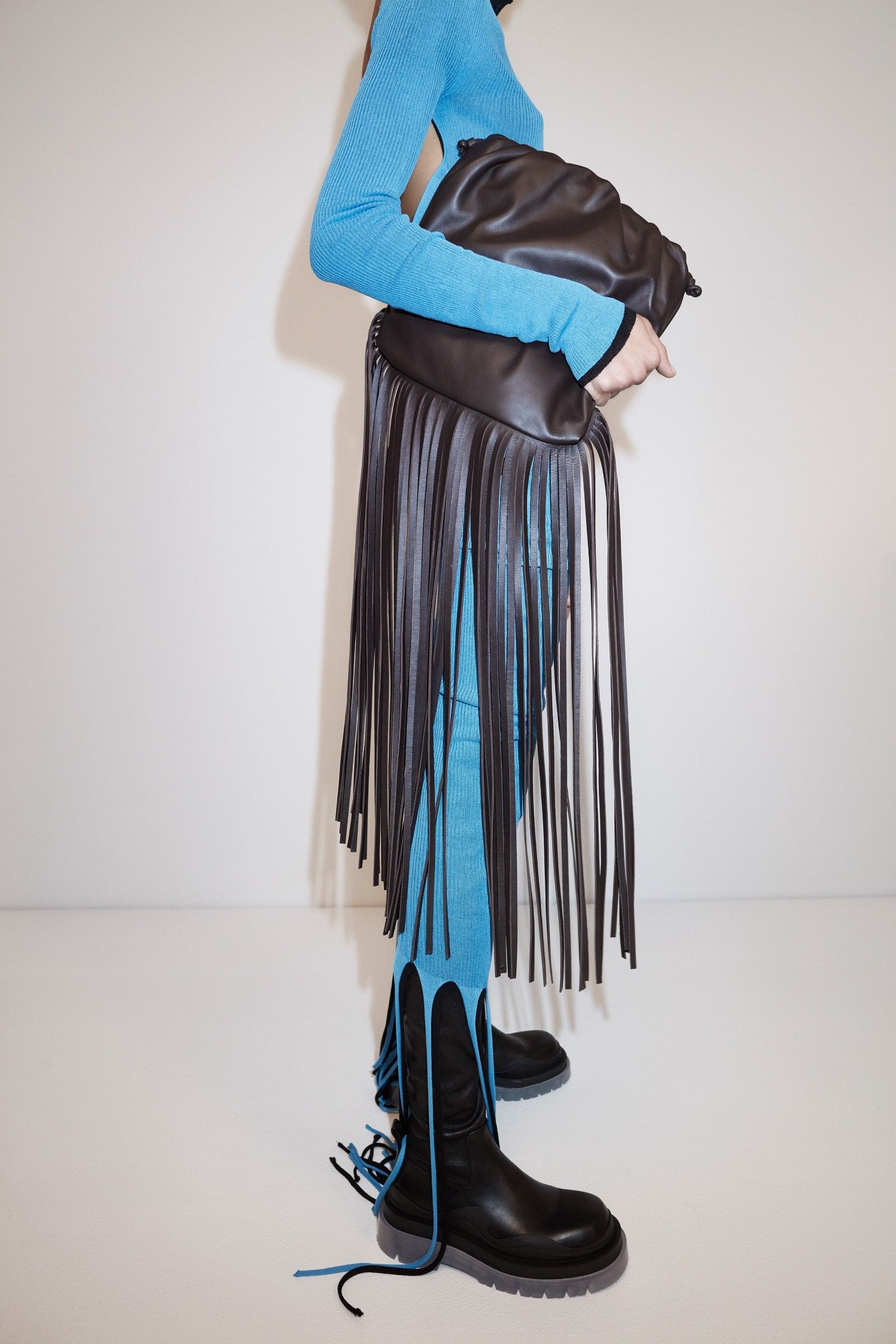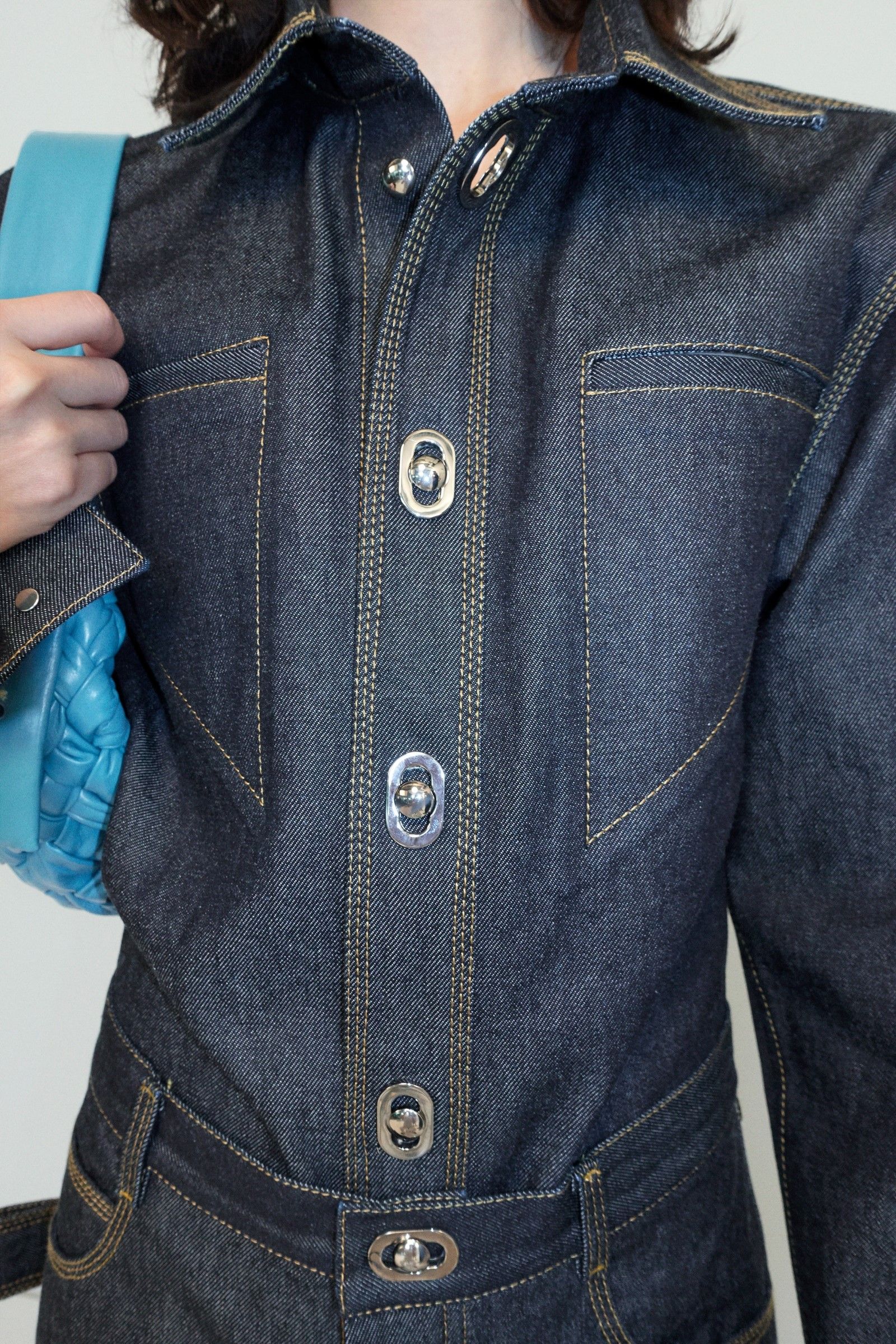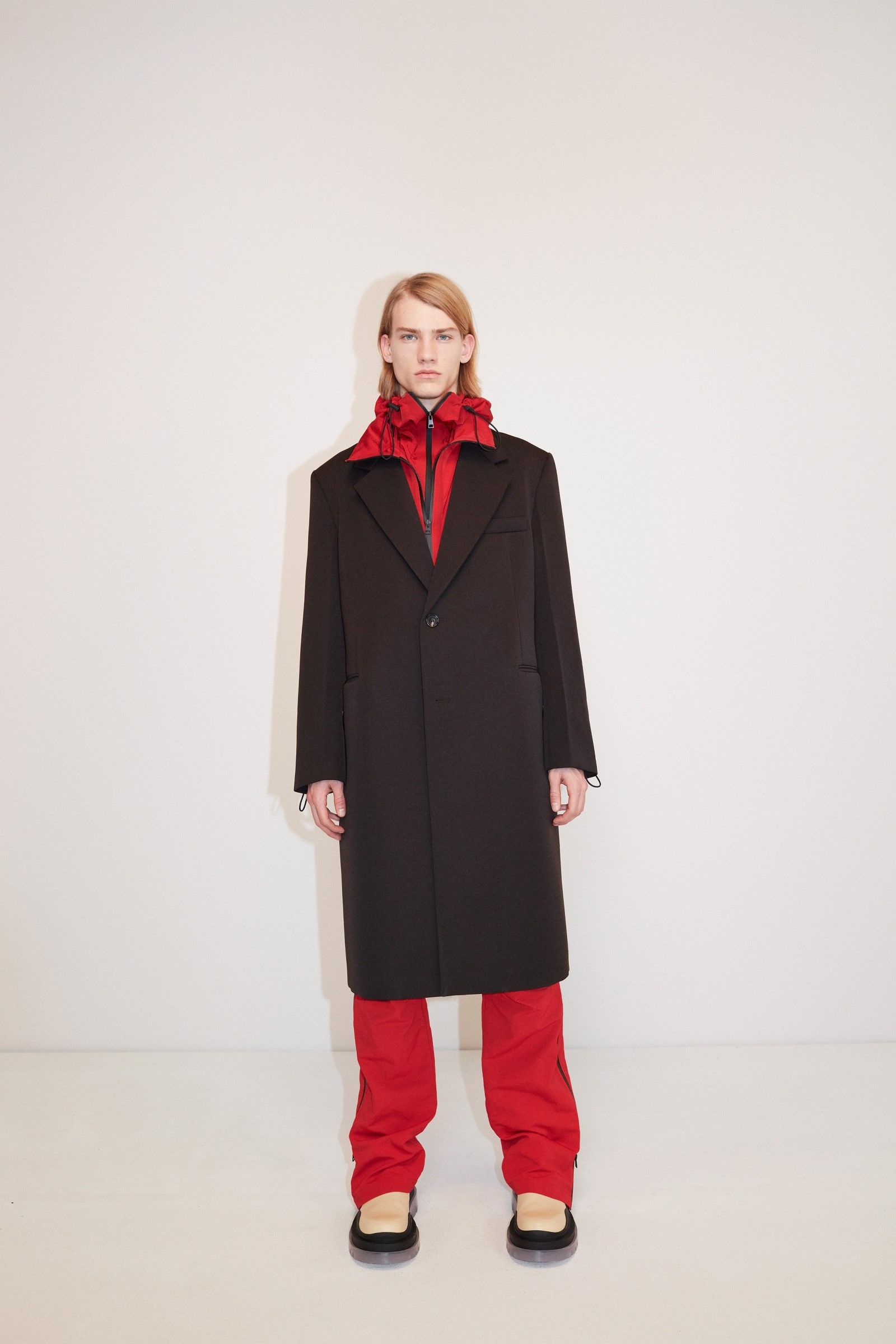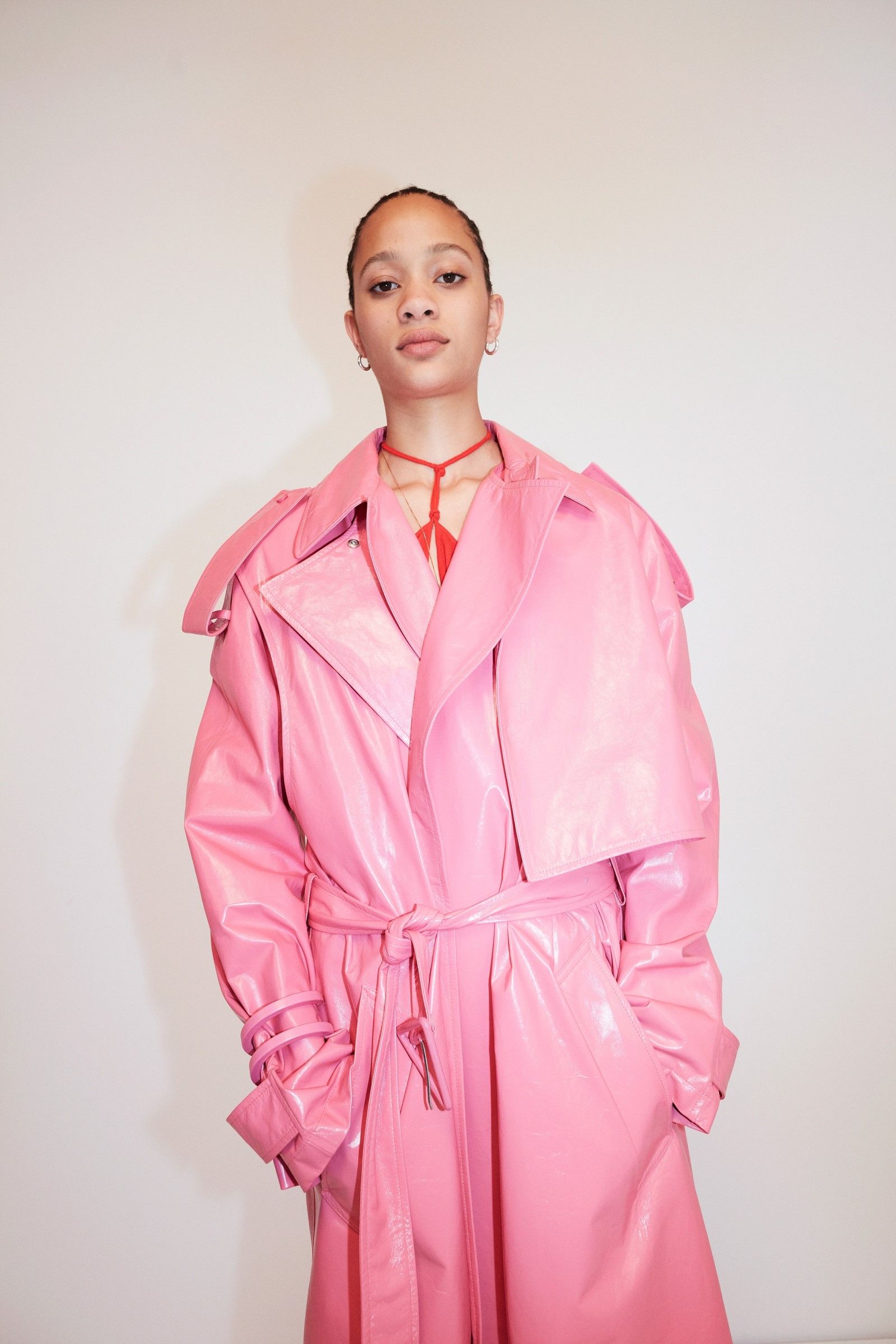 Il nero è ancora il colore dominante dei look, che viene alleggerito però da sfumature intense di turchese, rosso, rosa e giallo. Le linee semplici degli abiti sono accostate a scarpe e accessori dei volumi gonfi, tondeggianti. Il motivo intrecciato, pietra angolare dell’identità di Bottega Veneta, viene applicato non solo al cuoio ma anche a pellicce e piumini che, dietro un’apparenza morbida e priva di fronzoli, nascondono una struttura minuziosa e intricata. Oltre che alla fattura stessa degli abiti, la stravaganza è relegata ai tagli ampi e alla texture dei materiali, specialmente il cuoio, al layering e a dettagli come tasche e bottoni, dalla forma inusuale e massimalista. Sembrerebbe che il principio guida seguito da Lee sia stato quello di evitare, per quanto possibile, cuciture e altre “interruzioni” sulla superficie dei capi.