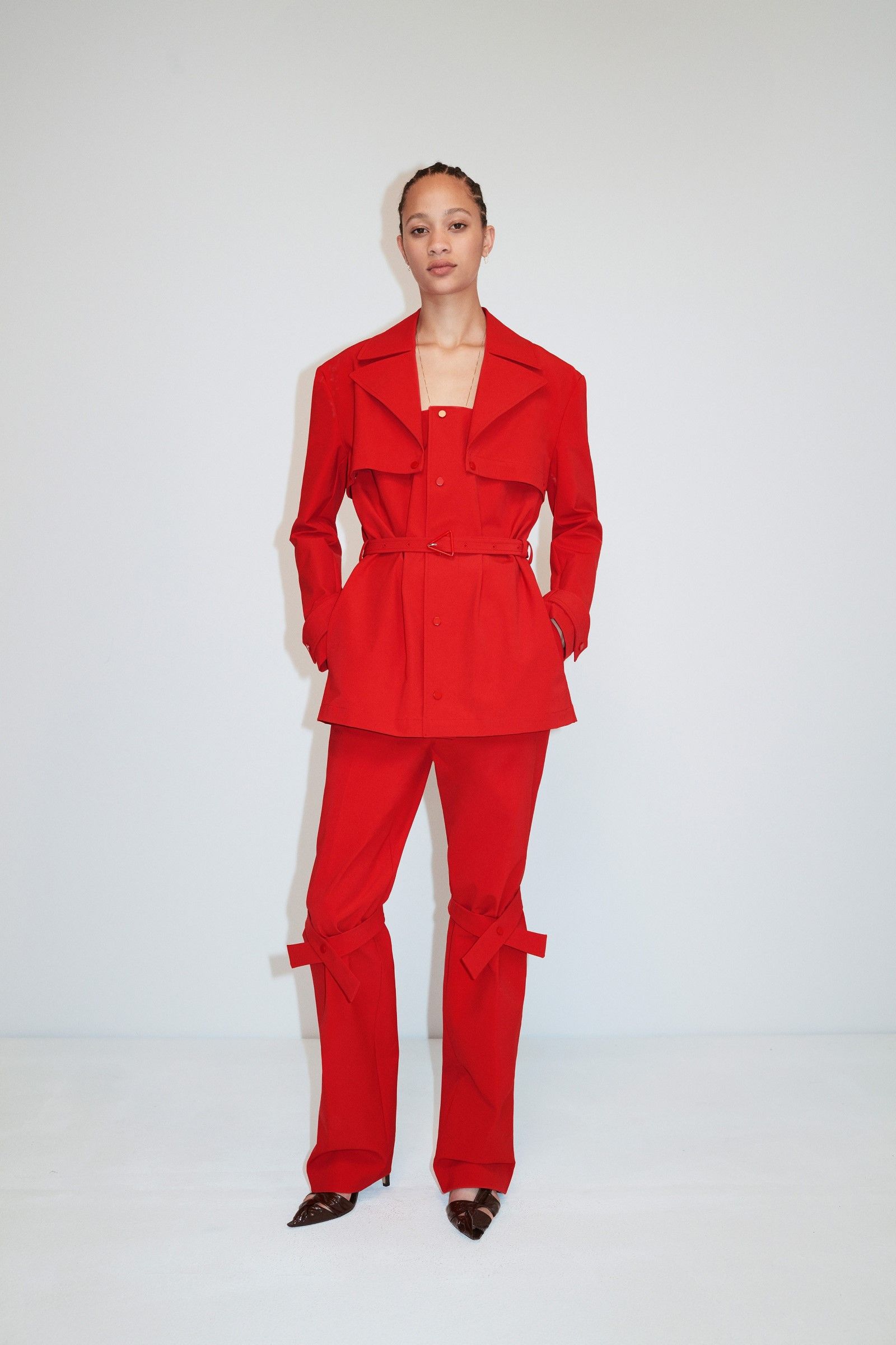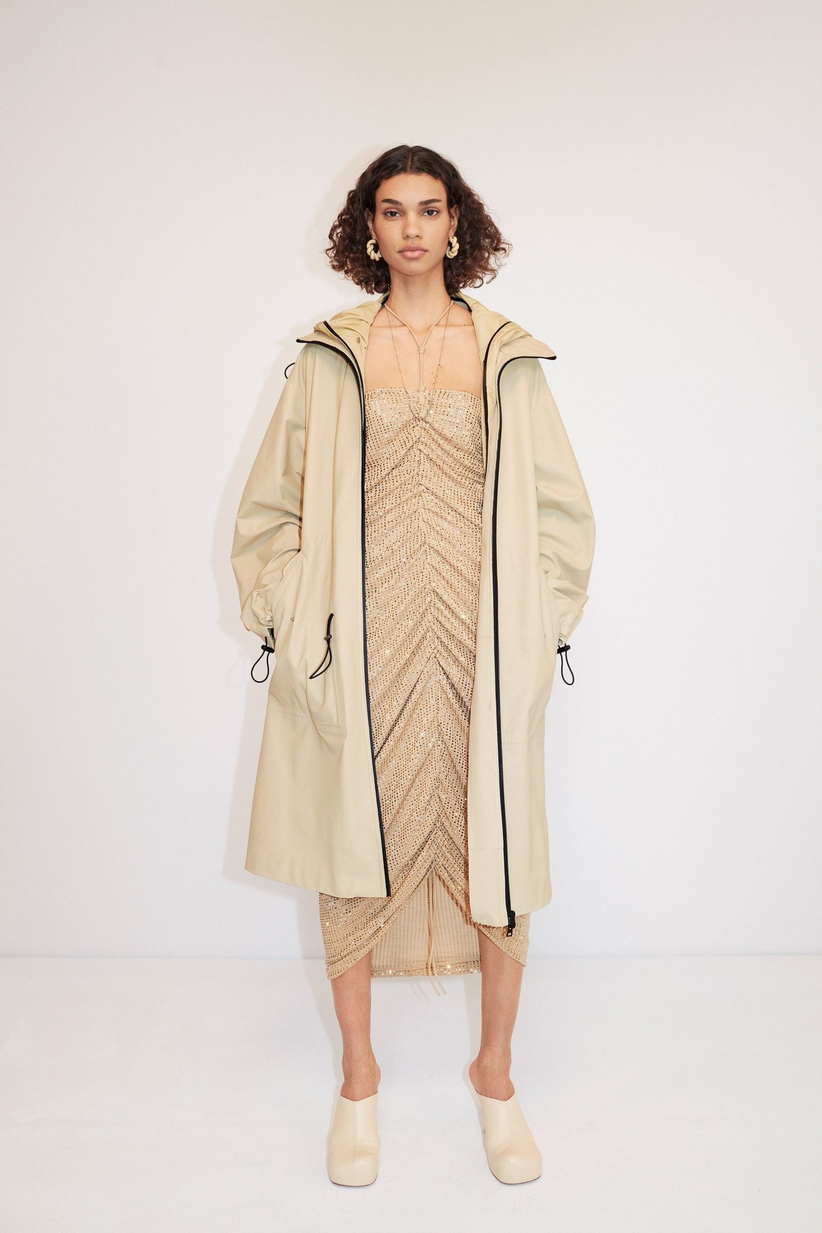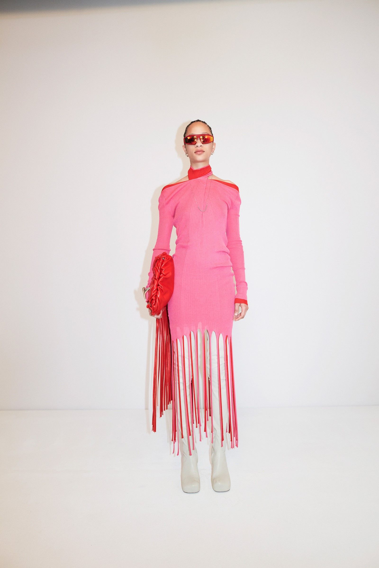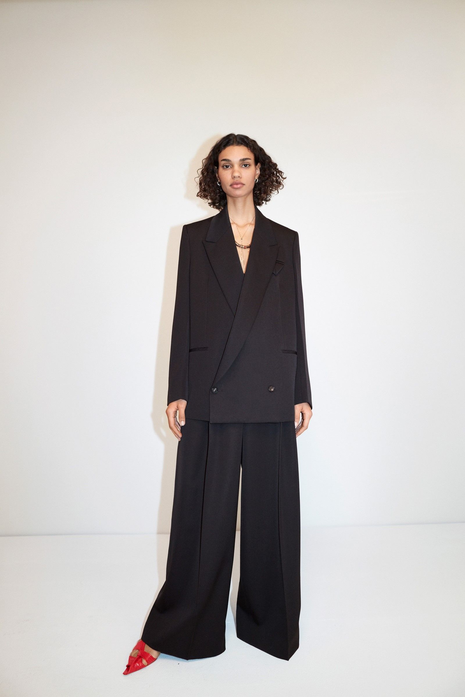 Il nero è ancora il colore dominante dei look, che viene alleggerito però da sfumature intense di turchese, rosso, rosa e giallo. Le linee semplici degli abiti sono accostate a scarpe e accessori dei volumi gonfi, tondeggianti. Il motivo intrecciato, pietra angolare dell’identità di Bottega Veneta, viene applicato non solo al cuoio ma anche a pellicce e piumini che, dietro un’apparenza morbida e priva di fronzoli, nascondono una struttura minuziosa e intricata. Oltre che alla fattura stessa degli abiti, la stravaganza è relegata ai tagli ampi e alla texture dei materiali, specialmente il cuoio, al layering e a dettagli come tasche e bottoni, dalla forma inusuale e massimalista. Sembrerebbe che il principio guida seguito da Lee sia stato quello di evitare, per quanto possibile, cuciture e altre “interruzioni” sulla superficie dei capi.
