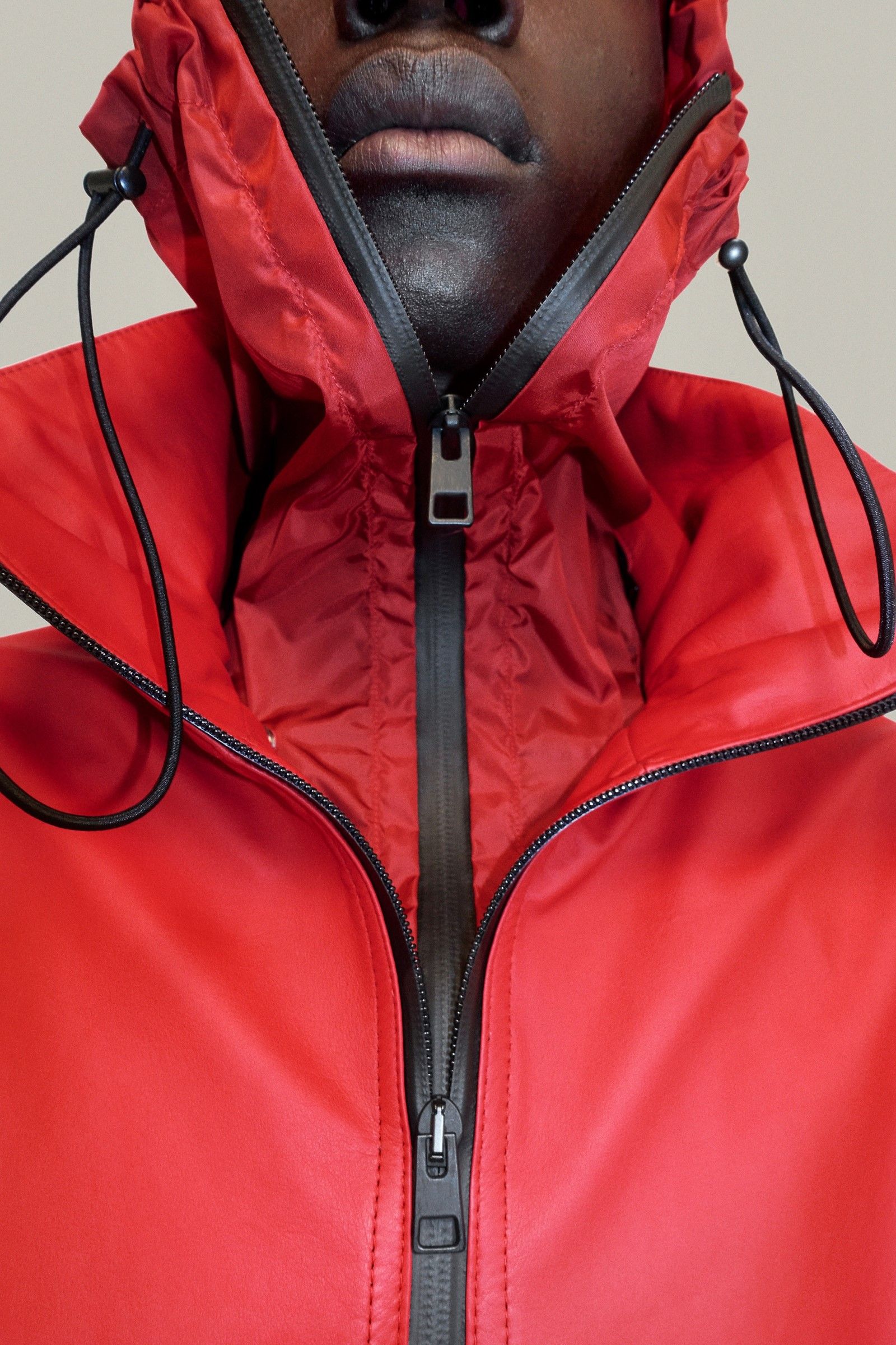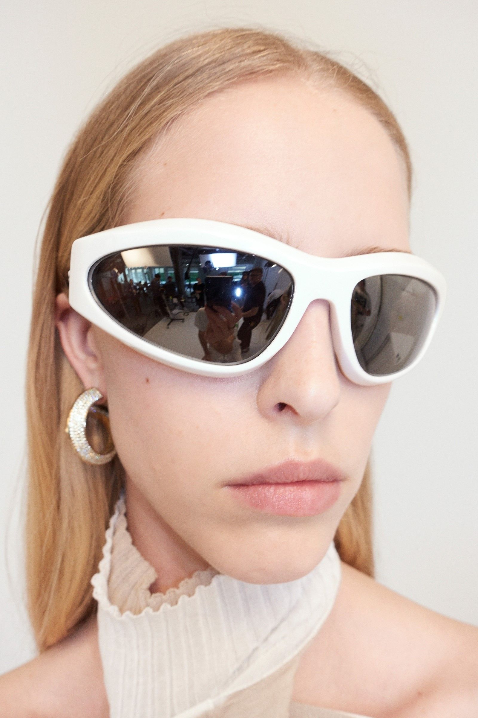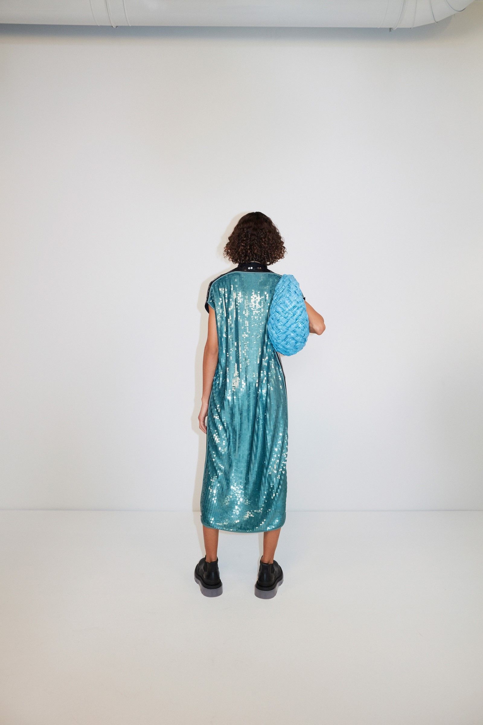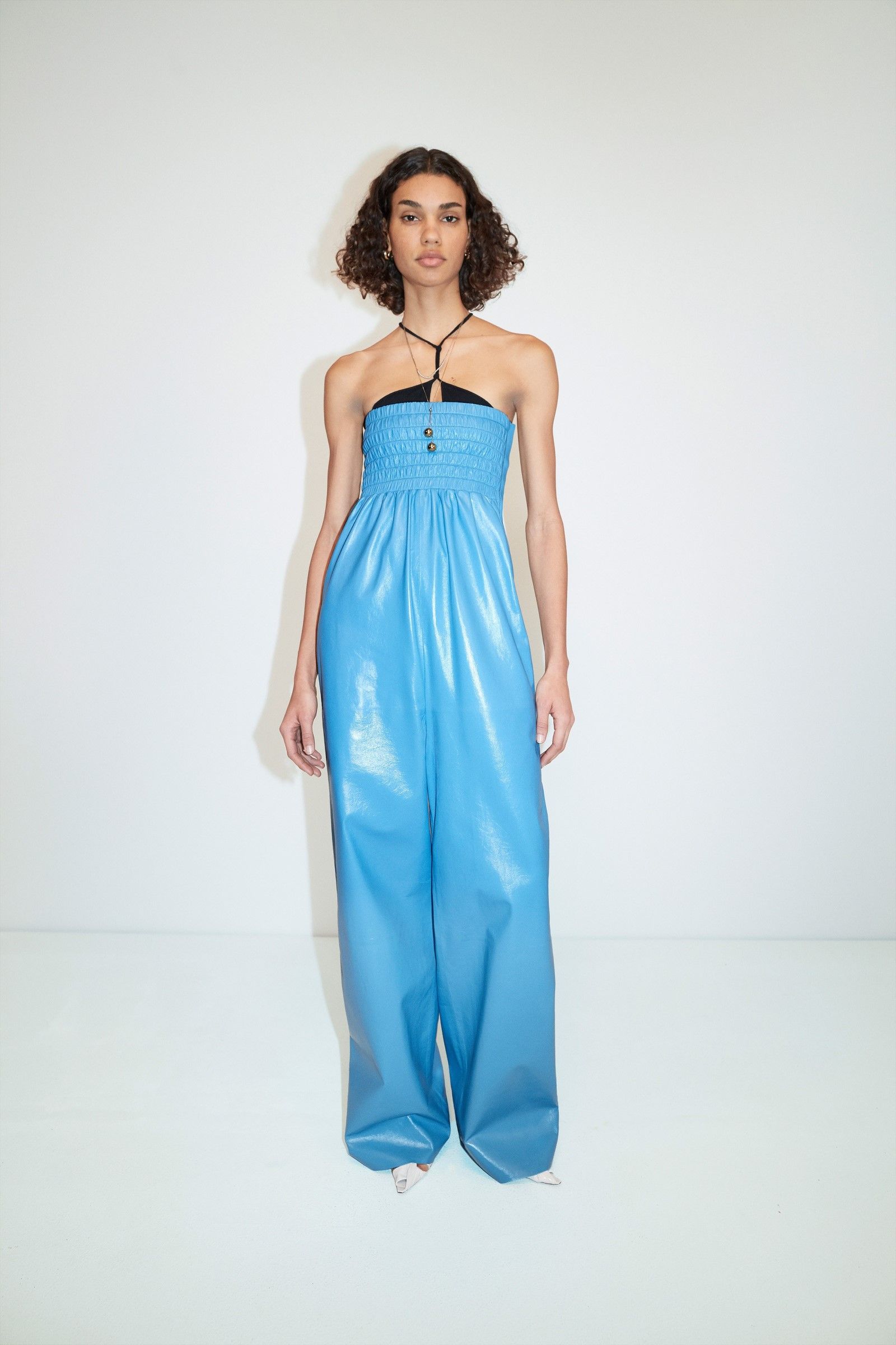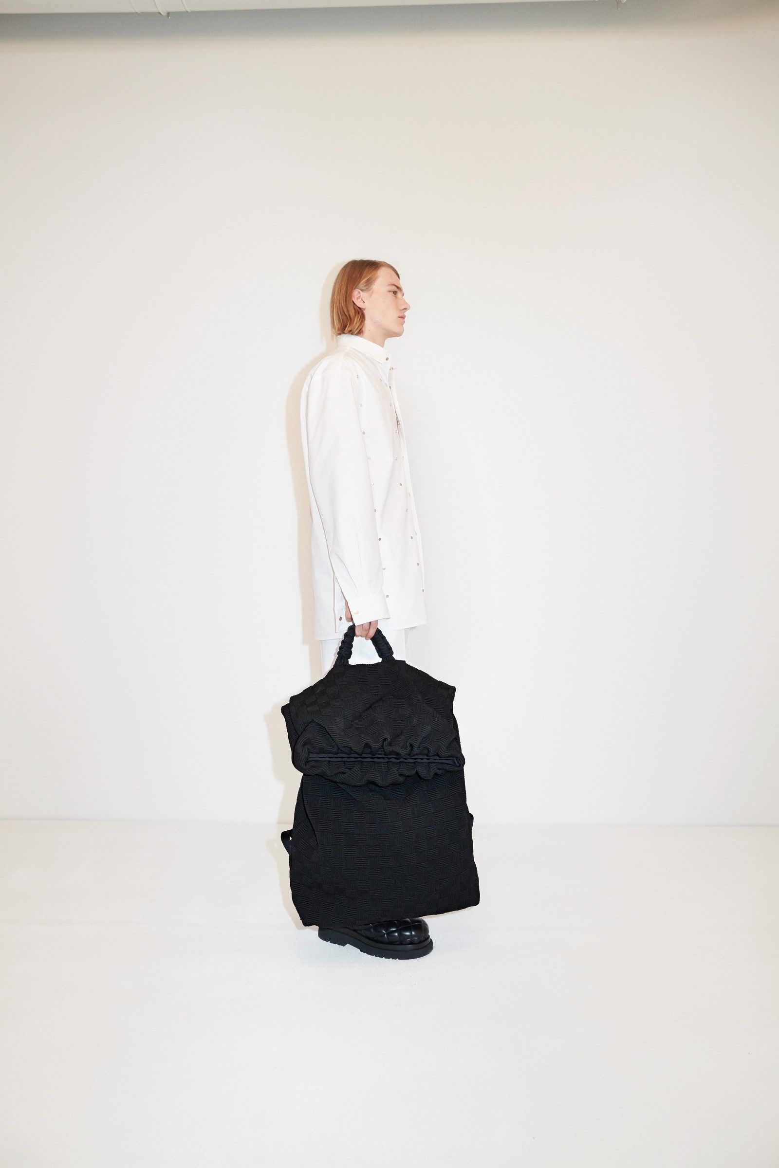 Il nero è ancora il colore dominante dei look, che viene alleggerito però da sfumature intense di turchese, rosso, rosa e giallo. Le linee semplici degli abiti sono accostate a scarpe e accessori dei volumi gonfi, tondeggianti. Il motivo intrecciato, pietra angolare dell’identità di Bottega Veneta, viene applicato non solo al cuoio ma anche a pellicce e piumini che, dietro un’apparenza morbida e priva di fronzoli, nascondono una struttura minuziosa e intricata. Oltre che alla fattura stessa degli abiti, la stravaganza è relegata ai tagli ampi e alla texture dei materiali, specialmente il cuoio, al layering e a dettagli come tasche e bottoni, dalla forma inusuale e massimalista. Sembrerebbe che il principio guida seguito da Lee sia stato quello di evitare, per quanto possibile, cuciture e altre “interruzioni” sulla superficie dei capi.