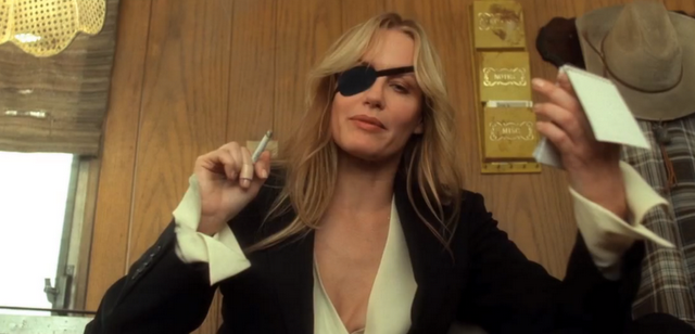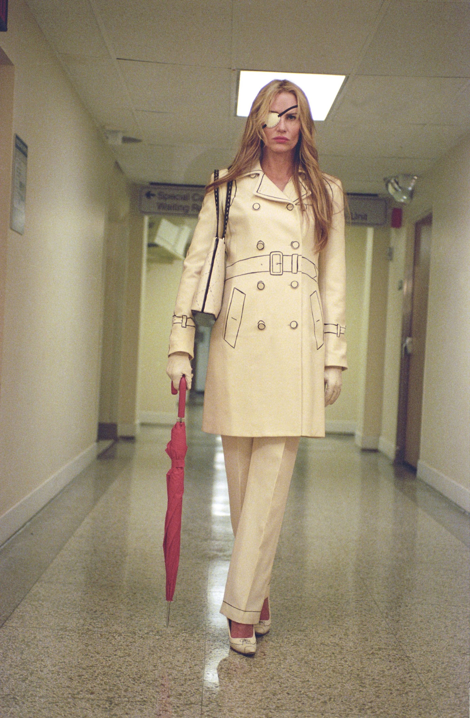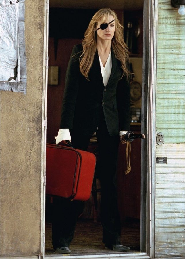 Il completo nero è abbastanza presente all’interno del film ma il suo highlight lo si trova nel guardaroba minimal di Elle Driver. Tutti i look di Elle Driver sembrano essere fuoriusciti da un archivio di Hedi Slimane. I più notevoli sono due: il tailleur bianco nella scena dell’ospedale con dettagli sartoriali disegnati sul tessuto in nero in una maniera che ricorda i custom di Joshua Vides e il completo nero con camicia in seta oversize che anticipa i look sartoriali e aggressivi di brand come Balenciaga e il Saint Laurent e il Céline di Slimane. A differenza di O-Ren Ishii, che col suo abito vuole rientrare nella tradizione da cui è esclusa per nascita, e di Vernita Green, che ha smesso gli abiti neri da killer e ora indossa i leggins e la felpa di una tranquilla madre suburbana, Elle Driver comunica uno status con i suoi tailleur - uno status di donna che, passi l’espressione, “porta i pantaloni” ma non rinuncia a dimostrare la propria superiorità anche nei minimi dettagli della propria estetica.