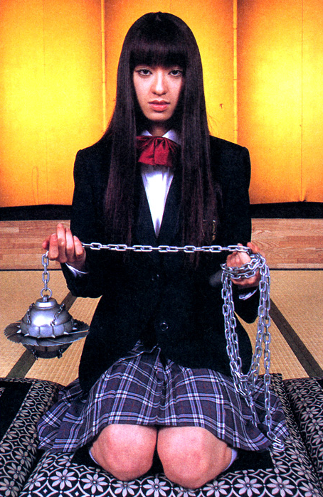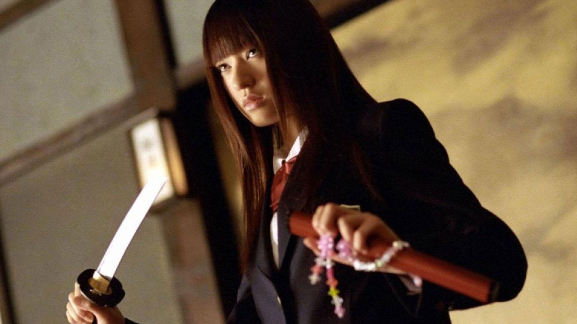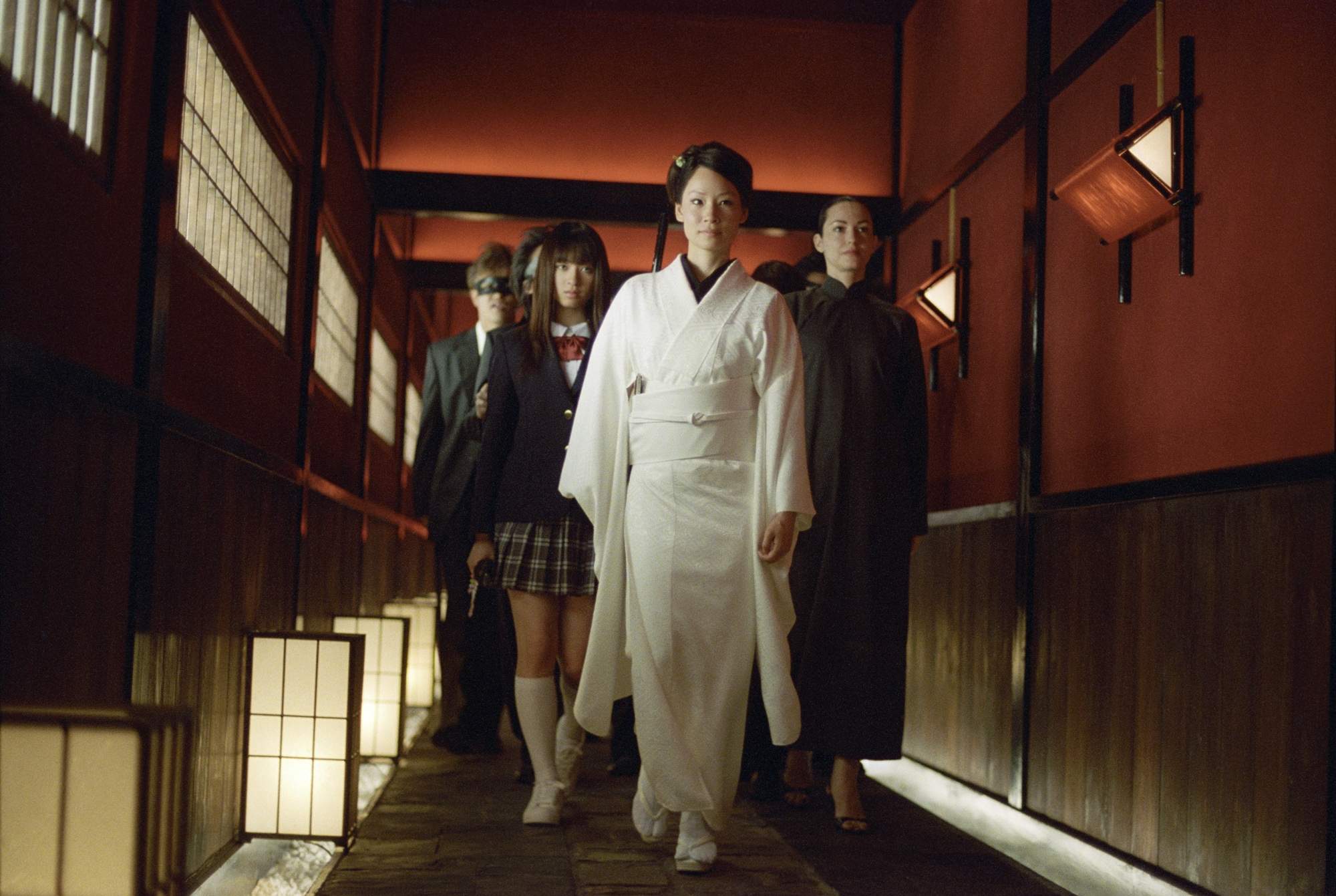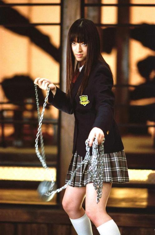 Il secondo outfit più notevole del film appartiene a un personaggio secondario che è comunque rimasto indelebile nella memoria dei fan. La killer Gogo Yubari, interpretata da Chiaki Kuriyama, si scontra all’ultimo sangue con la Sposa nella tipica uniforme delle liceali giapponesi: giacca, camicia bianca, un fiocco rosso al colletto, una gonna a quadri e un paio di Nike Blazer Low in suede. Questo look ha il merito di mettere insieme per la prima volta in un film d’azione la silhouette di una sneaker a quella di un abito dalla linea più sartoriale. Oltre che ai film Battle Royale e Master of the Flying Guillotine, il personaggio si ispira alla sottocultura anni ’60 delle sukeban, le ragazze giapponesi che formavano baby gang criminali e modificavano le proprie uniformi scolastiche ispirandosi ai fuorilegge dei film. Quello delle sukeban è uno stile che è nato sulla strada, che mescola uniformi e accessori punk in una maniera non diversa da quella di stilisti moderni come Demna Gvasalia ed è riecheggiato nella cultura giapponese nel kogyaru style e, in una lettura ancora più eclettica, dall’harajuku style.
