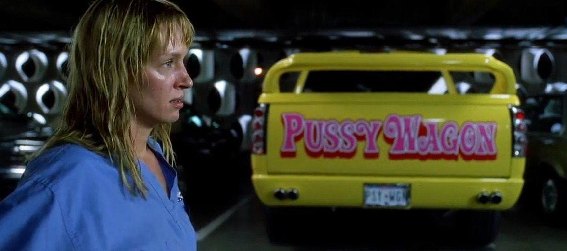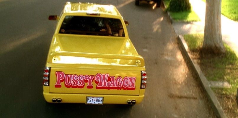Menzione d’onore va poi al “Pussy Wagon”, il pick-up del becero infermiere Buck che la Sposa ruba in una delle migliori sequenze del film. Pur apparendo per pochi minuti sullo schermo, il pick-up giallo decorato con fiamme in aerografia, con il font anni ‘60 delle sue grafiche, suggerisce qualche riflessione. L’automobile è così memorabile da avere un nome proprio, è un oggetto iconico che è parte integrante dell’identità del film. Il motivo di questa iconicità è la sua voluta e autoironica volgarità, un cattivo gusto che, attraverso il filtro della consapevolezza, si capovolge e diventa all’istante di culto. Il motivo delle fiamme aerografate sulla carrozzeria, un classico caso di camp automobilistico, che è sopravvissuto nella cultura delle sneaker con le Vans Flame Old Skool e nella moda, a partire dai custom di Harley Davidson, passando per gli skater che orbitavano intorno a Thrasher fino alle mitologiche camice di Guy Fieri, si è infiltrato nelle collezioni di Prada e Dior Homme per per l’Autunno 2018 e in quelle di Vetements due anni prima. In definitiva il Pussy Wagon è un esempio pratico come font ed elementi grafici riescano a diventare memorabili in se stessi come ad esempio è capitato con i font creati da Shawn Stussy, che hanno determinato il successo e l’iconicità delle sue collezioni originali, e sono state recuperate per show di alto profilo come la Pre-Fall 2020 di Dior.