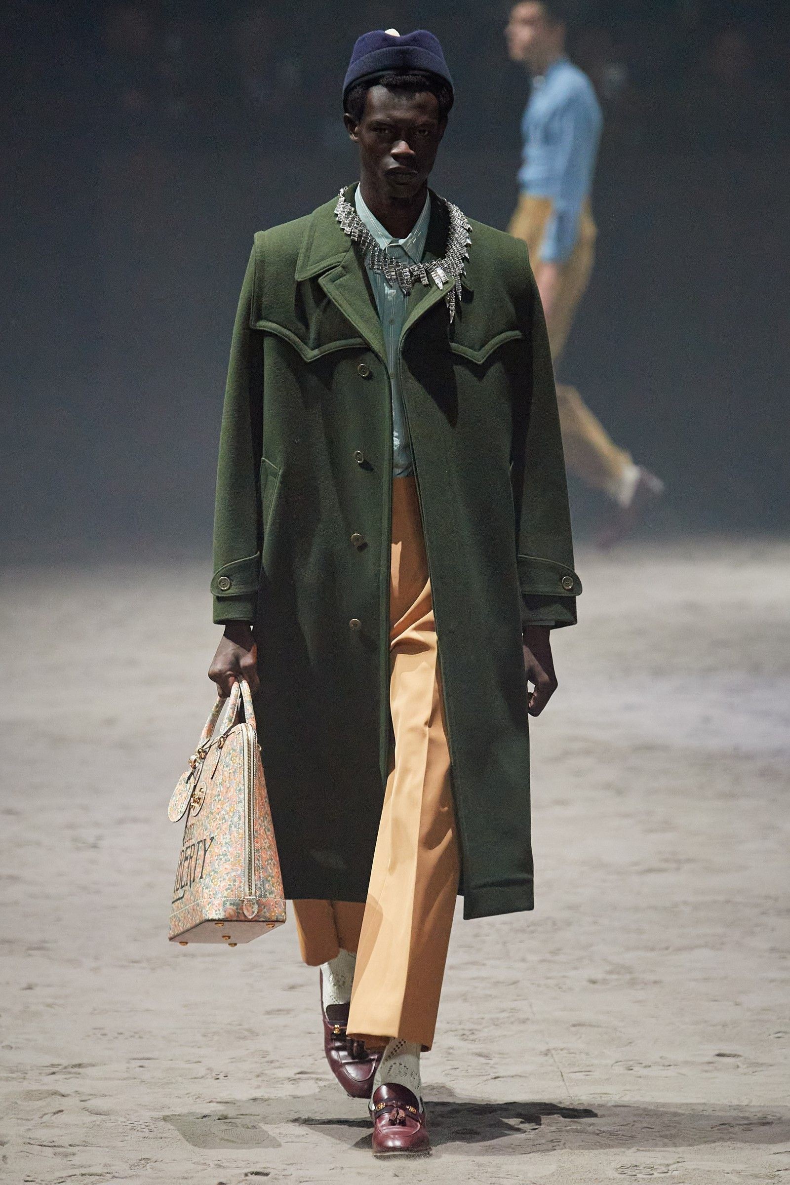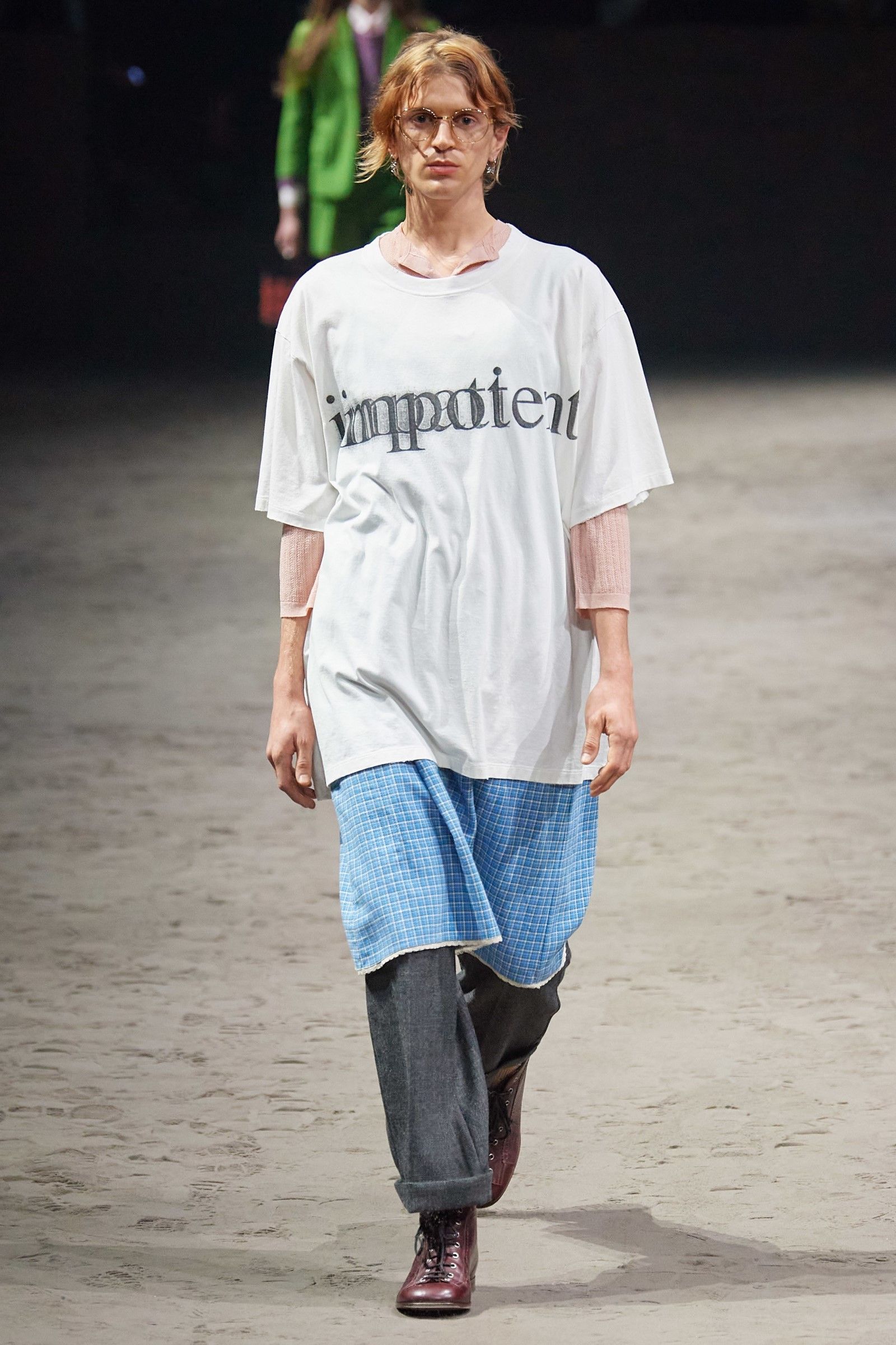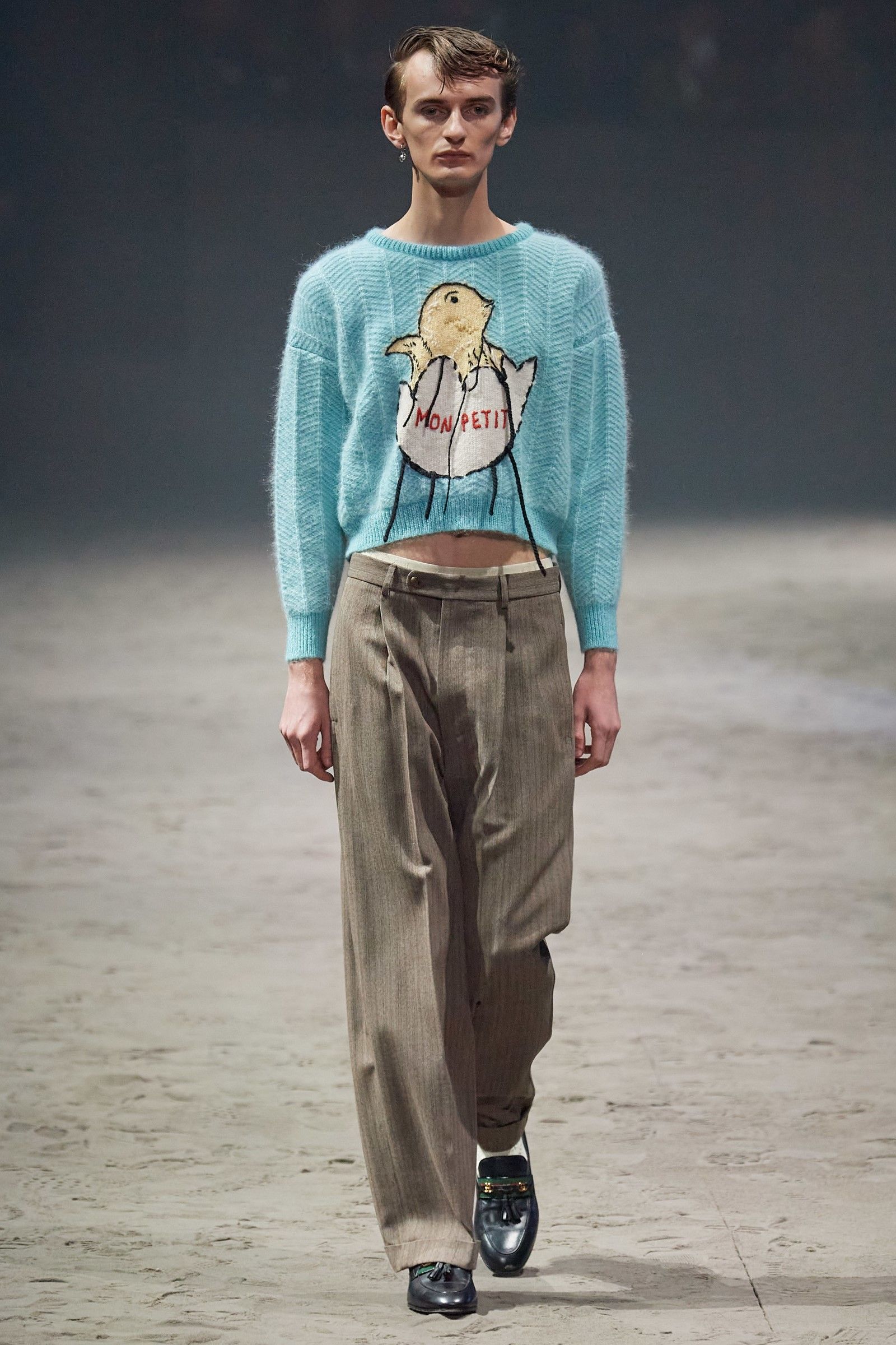 Alessandro Michele, invece, che celebrava il suo quinto anniversario in Gucci, ha colto l'occasione per sfidare del tutto la definizione moderna della mascolinità. La sua collezione ha decostruito i principi tradizionali dell'abbigliamento maschile e li ha assemblati senza soluzione di continuità con aspetti femminili, dando vita a una collezione dall’aspetto gender-neutral. Invece di scegliere uno degli estremi nello spettro dei generi, si è posizionato a metà. Ogni look era tanto adatto alla donna quanto all'uomo, sia che si tratti di un mini abito, che di un crop-top o di un abito classico. In omaggio al proprio anniversario, il designer ha anche rivisitato alcuni dei suoi pezzi più popolari. Gli iconici mule Princetown di Gucci hanno fatto un ritorno così come alcuni altri pezzi storici.