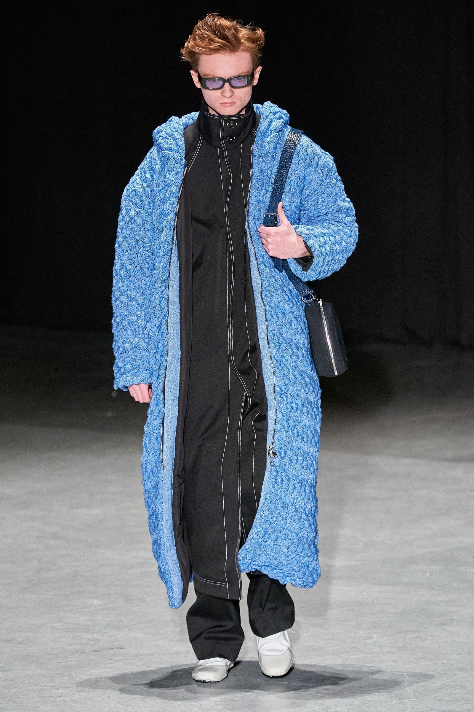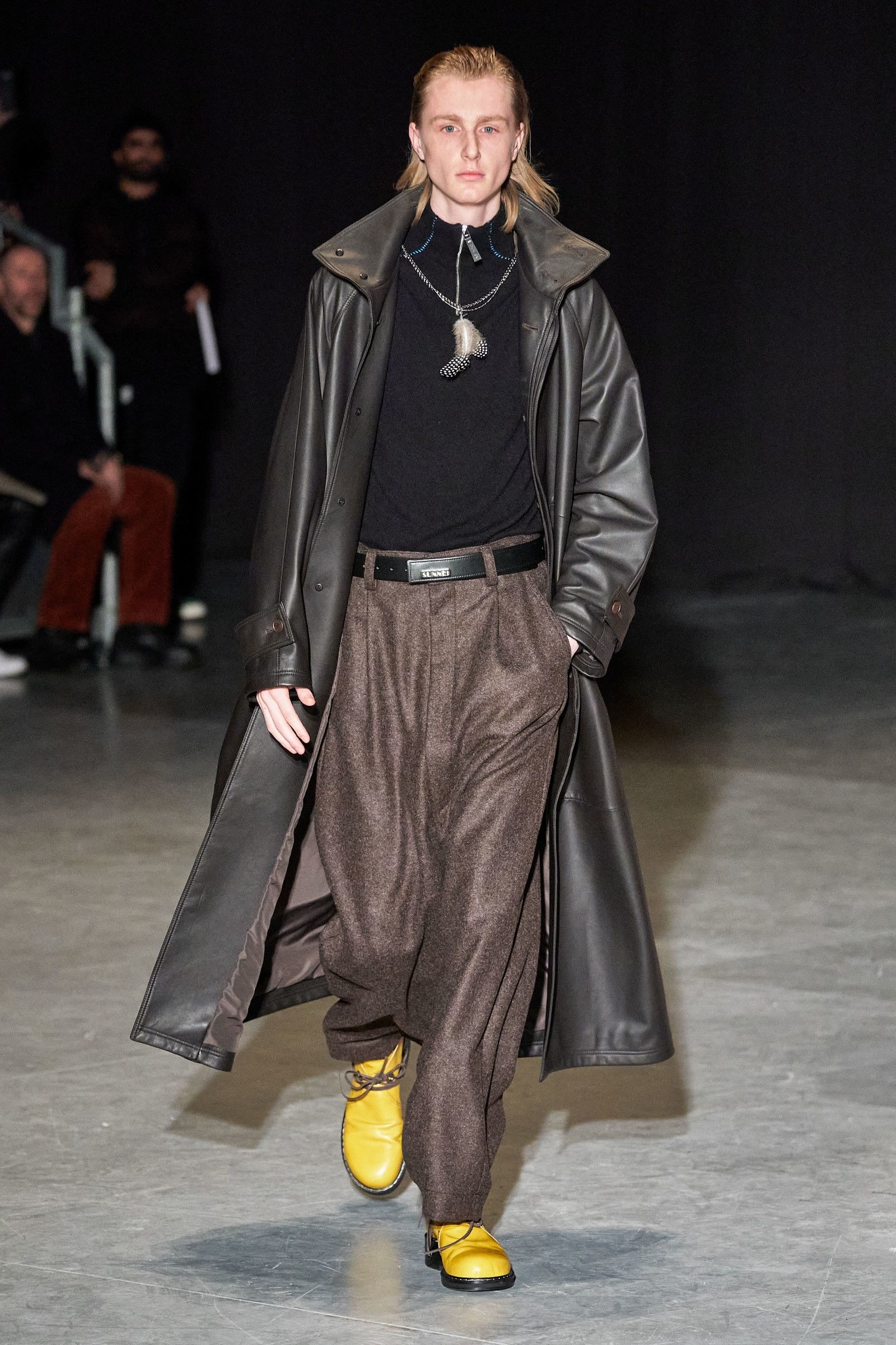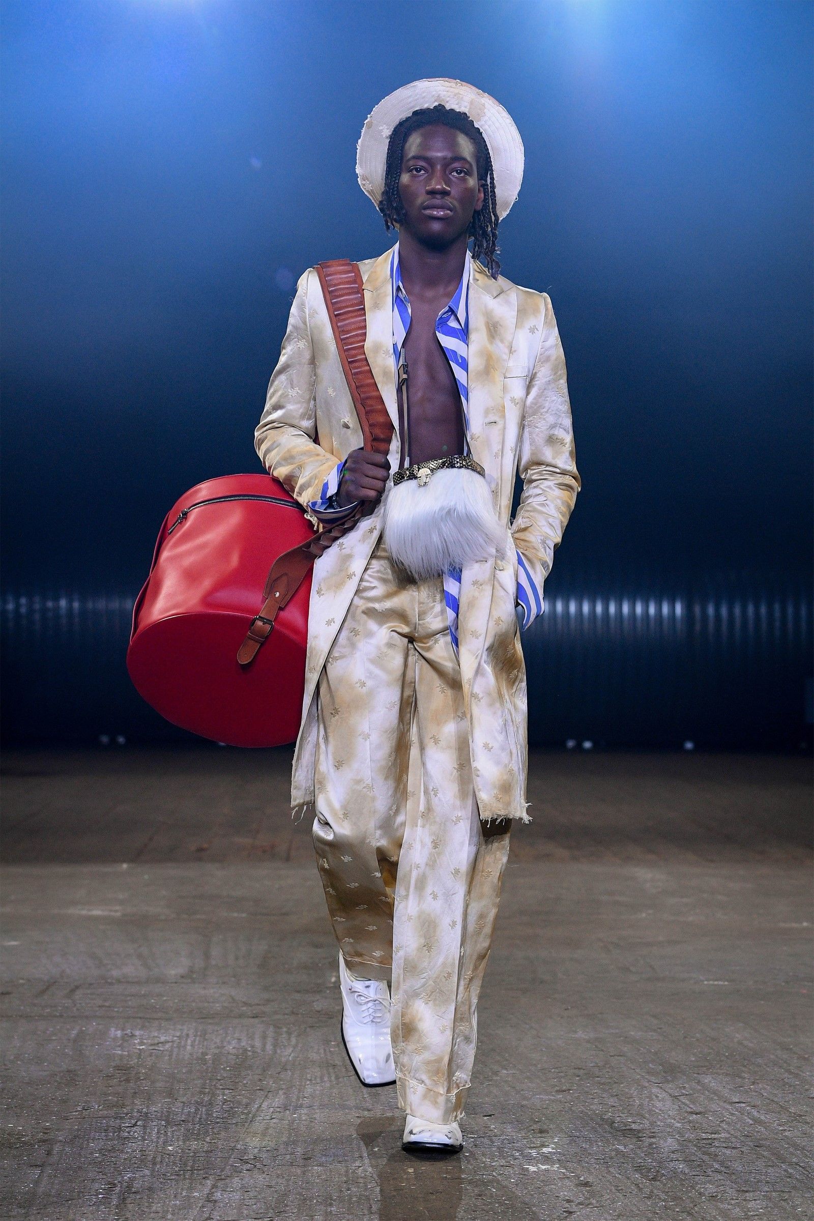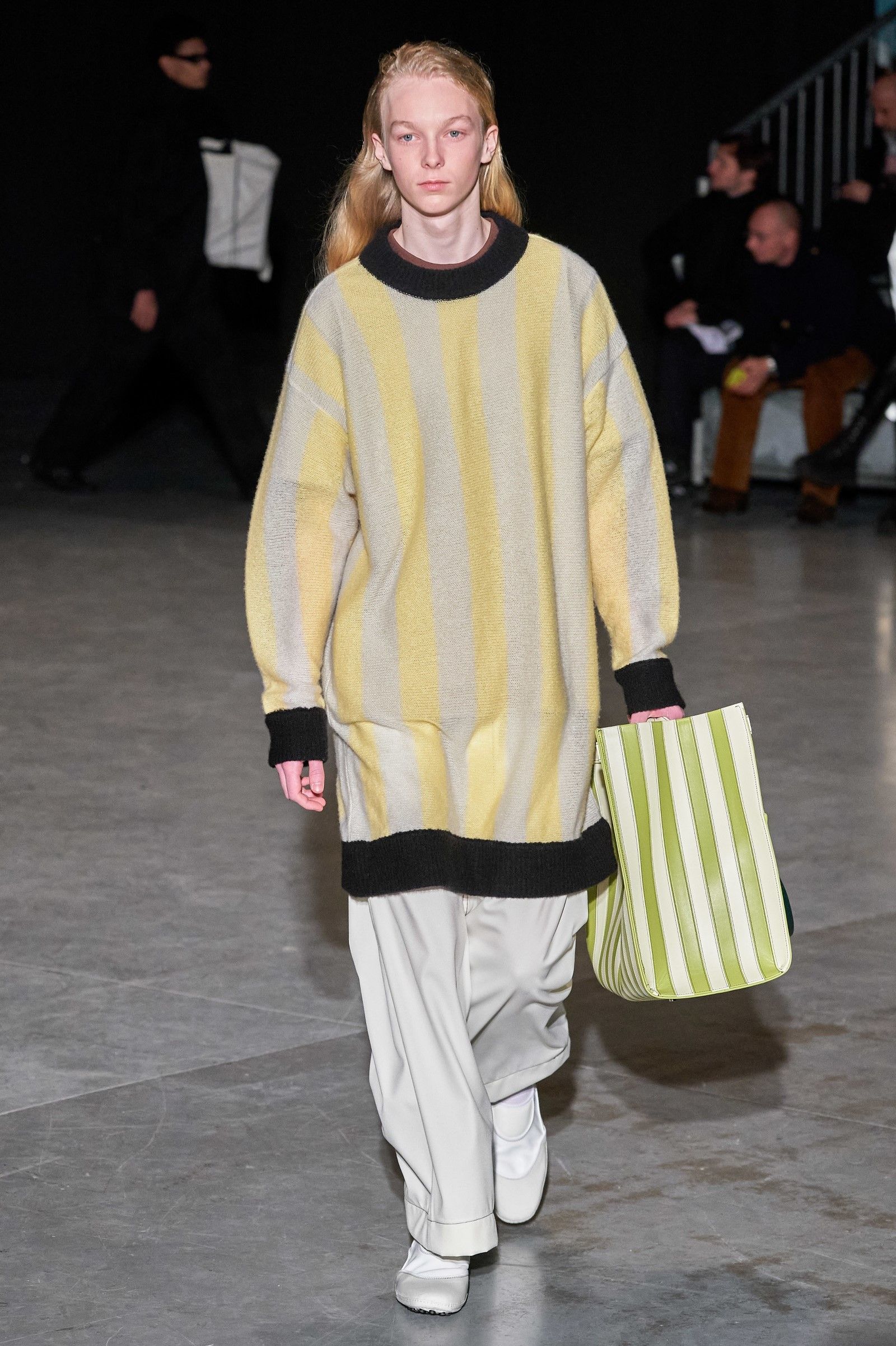 Lo show di Marni, d'altra parte, è stato un deliberato tentativo di rinunciare ai principi della sartoria maschile classica. Francesco Risso ha creato una collezione da scarti di tessuto sovradimensionati, troppo larghi o troppo lunghi. Ogni look è stato realizzato con un approccio avant-garde alla sostenibilità. Più un pezzo vestiva male, meglio appariva. Gli orli del cappotto differivano per altezze e texture, mentre taglia e vestibilità variavano dal piccolo al XL in una varietà di colori vivaci.
