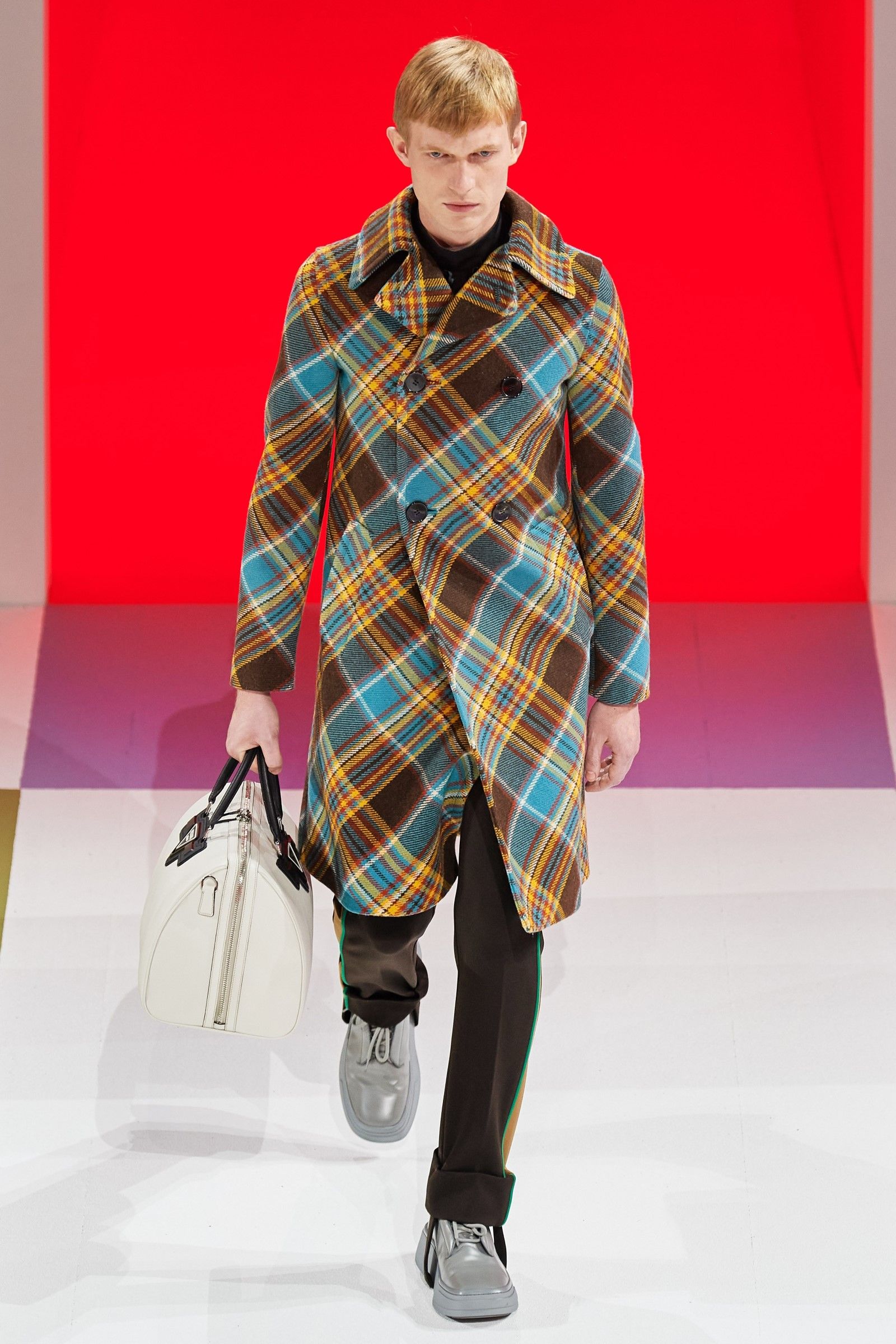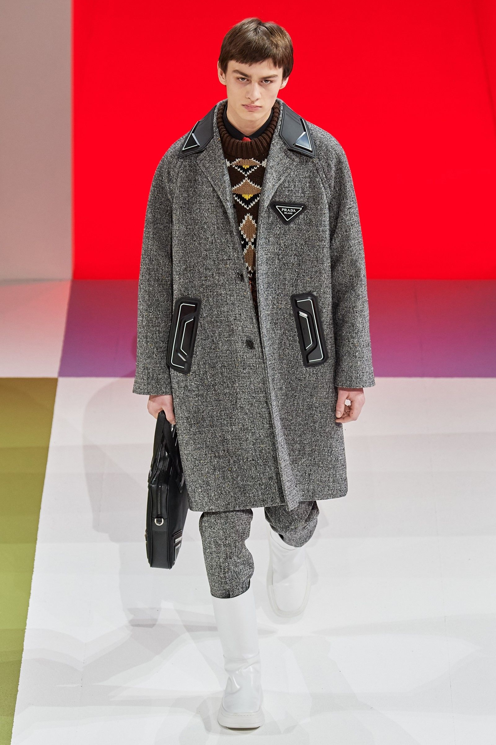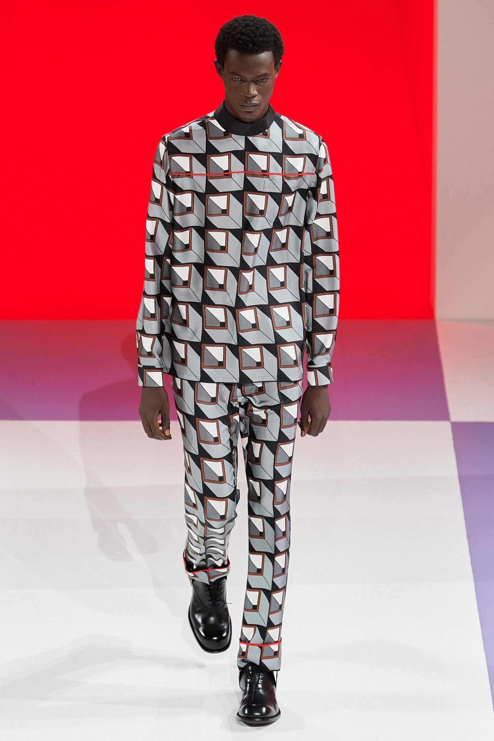Anche Miuccia Prada ha fatto riferimento al passato creando una collezione che fungesse da ponte tra due opposti: il passato e il futuro, il vecchio e il nuovo, lo sportivo e il formale. Durante questa stagione ha immaginato un mondo in cui un presente orientato allo streetwear si incontra a metà strada con la sartoria classica delle origini. La collezione ha visto una serie di uomini in completo che sfoggiano classici tre pezzi e due pezzi con sottili tocchi di modernità. Si va dall’aderente all’abbondante, dai colori vivaci al bianco e nero, e naturalmente dal mood più atletico con alcuni look proposti nel nylon dal sapore streetwear fino a una sartorialità più pulita con abiti classici sempre in nylon.