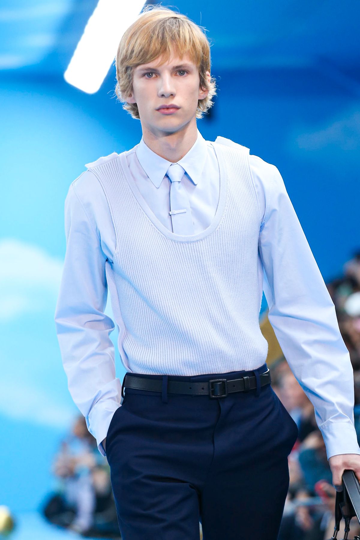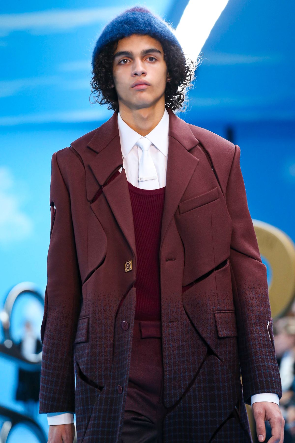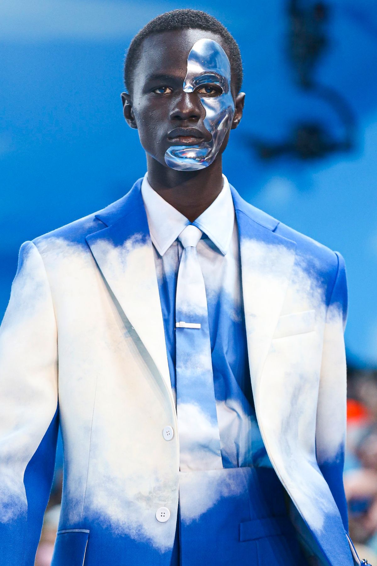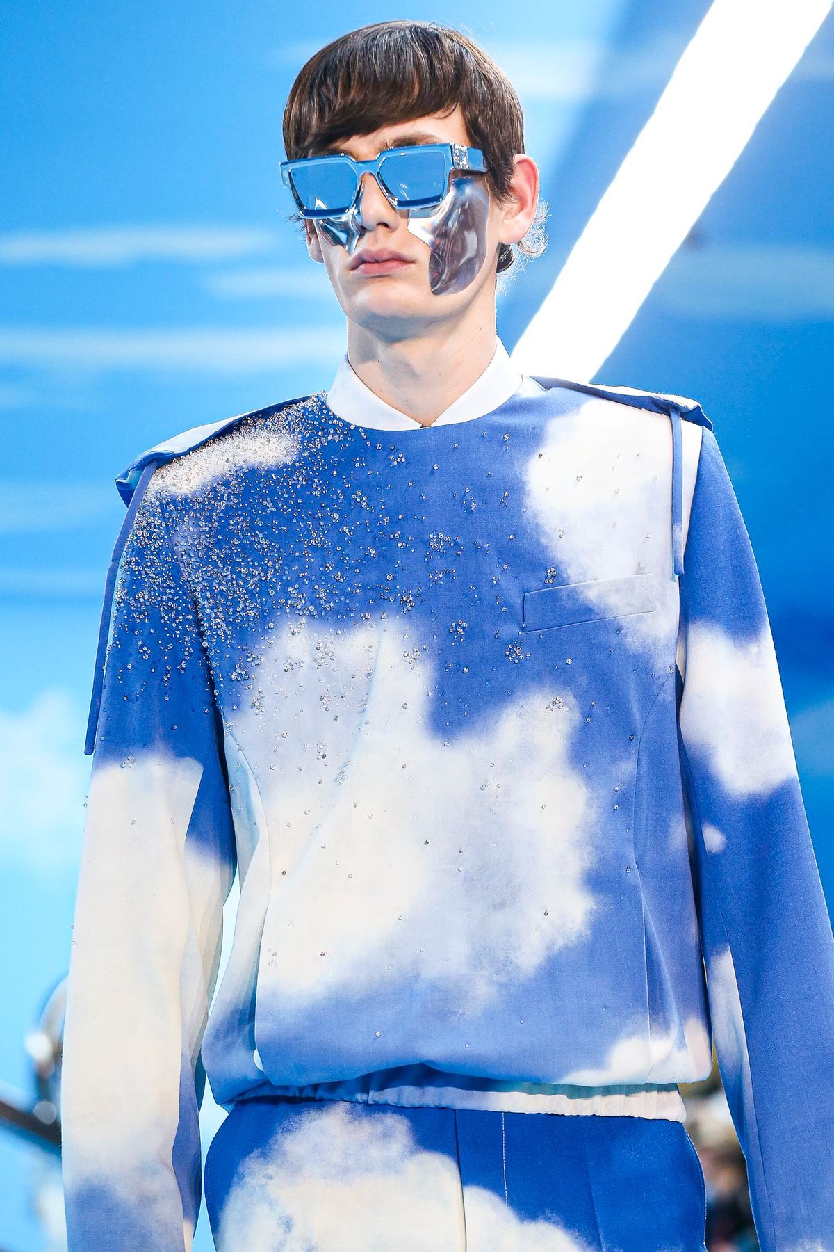 Un certo tipo di straniamento è stato impiegato anche nei look della collezione, in cui i capi classici del guardaroba maschile sono stati decostruiti o sottilmente modificati tramite layering inaspettati, gradienti di colori, incrostazioni di cristalli e costruzioni sartoriali insolite. Un tema visivo importante è stato il cielo azzurro punteggiato da nuvole, fondale caro a molta pittura surrealista e specialmente a Renè Magritte, che è stato riproposto in un’intera sezione di look, decorati con una stampa all-over simile a quello del setting dello show.