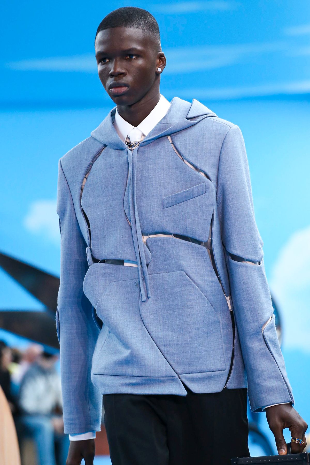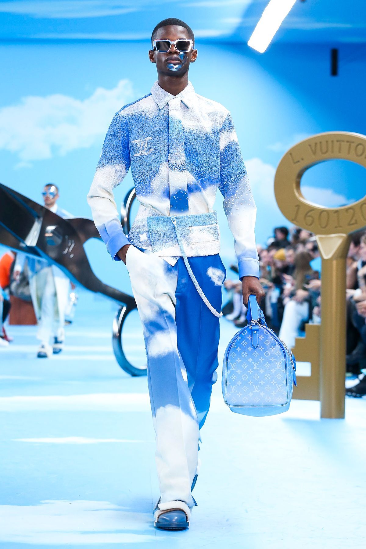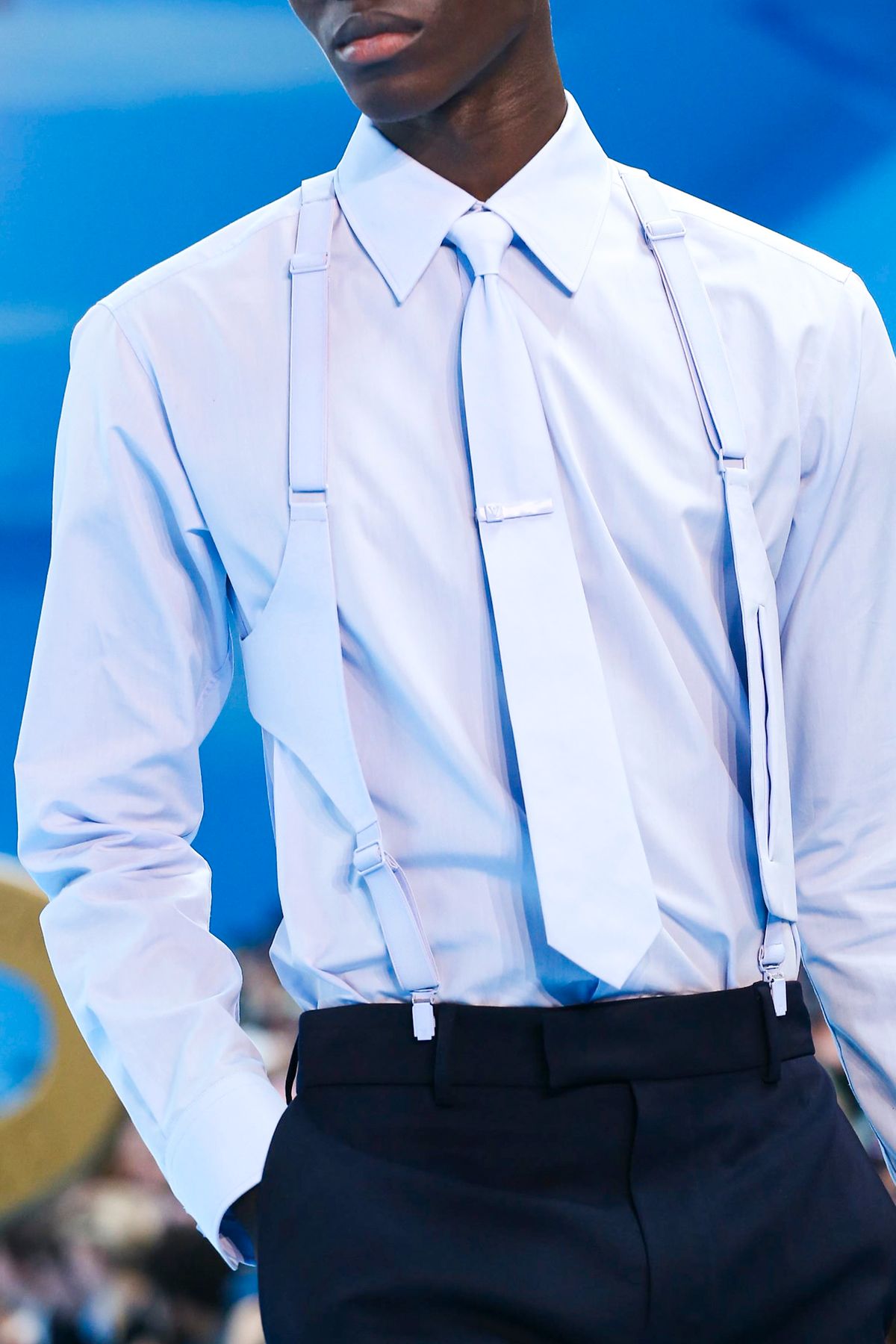 Un certo tipo di straniamento è stato impiegato anche nei look della collezione, in cui i capi classici del guardaroba maschile sono stati decostruiti o sottilmente modificati tramite layering inaspettati, gradienti di colori, incrostazioni di cristalli e costruzioni sartoriali insolite. Un tema visivo importante è stato il cielo azzurro punteggiato da nuvole, fondale caro a molta pittura surrealista e specialmente a Renè Magritte, che è stato riproposto in un’intera sezione di look, decorati con una stampa all-over simile a quello del setting dello show.