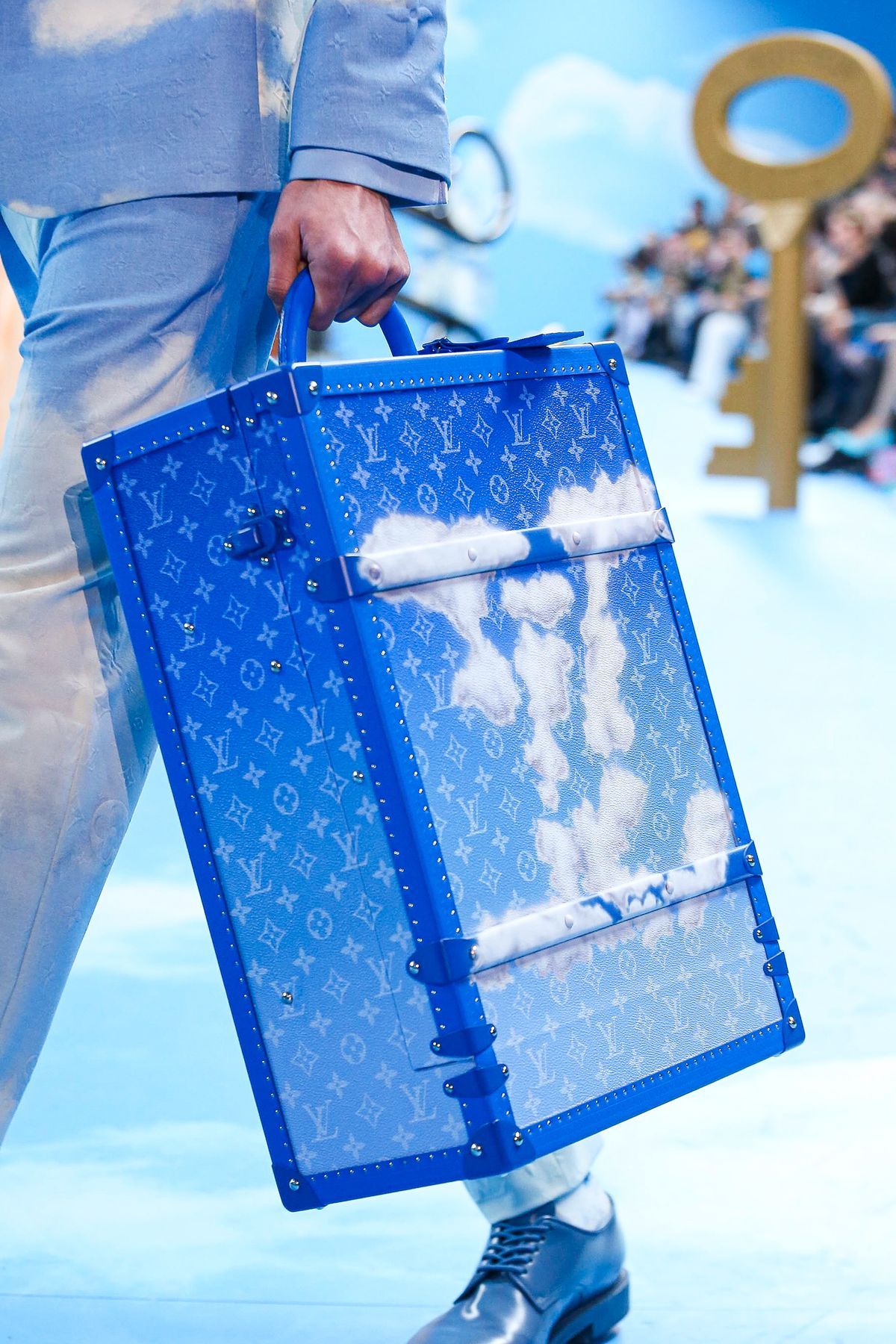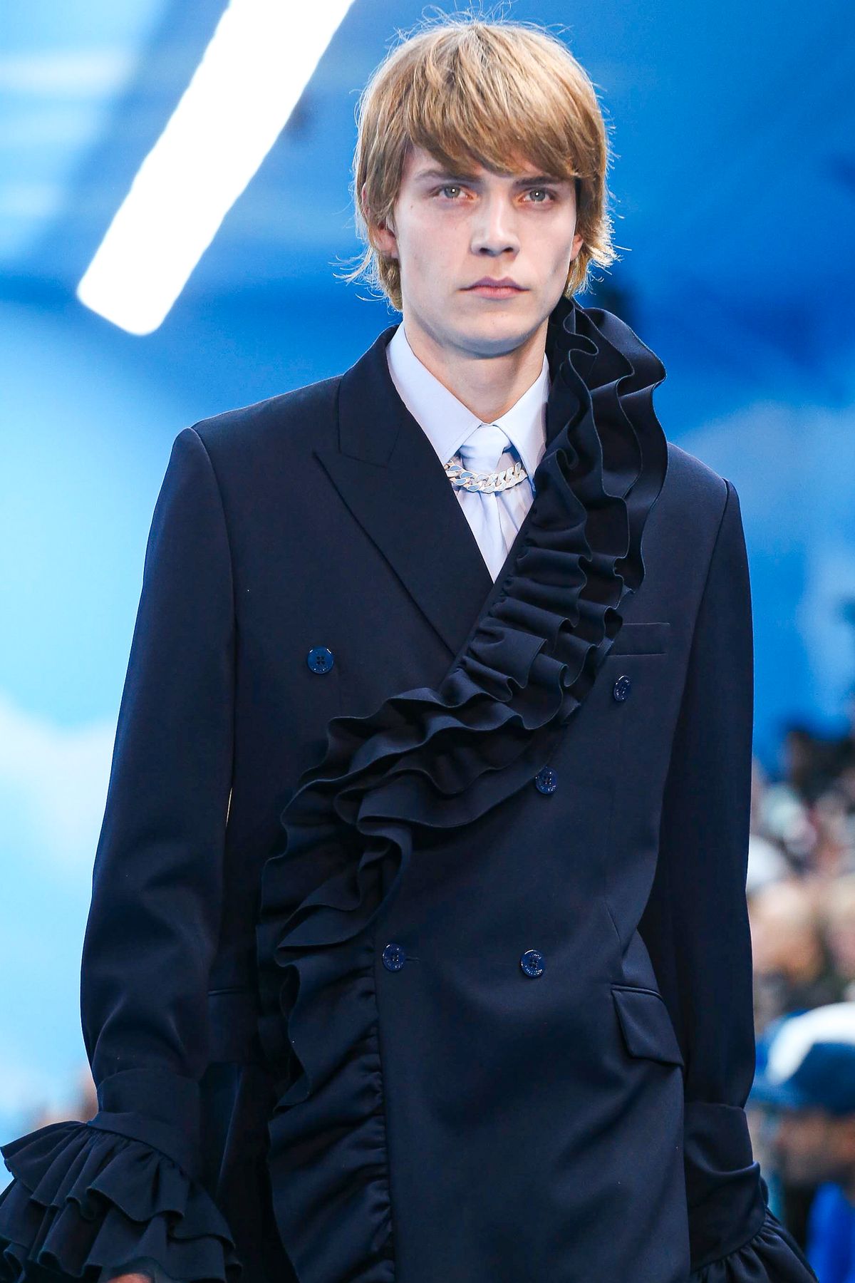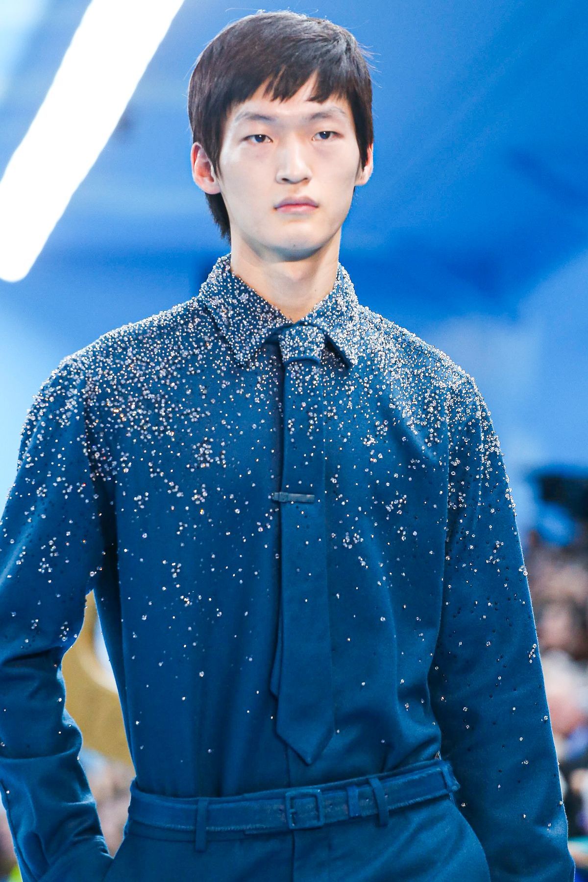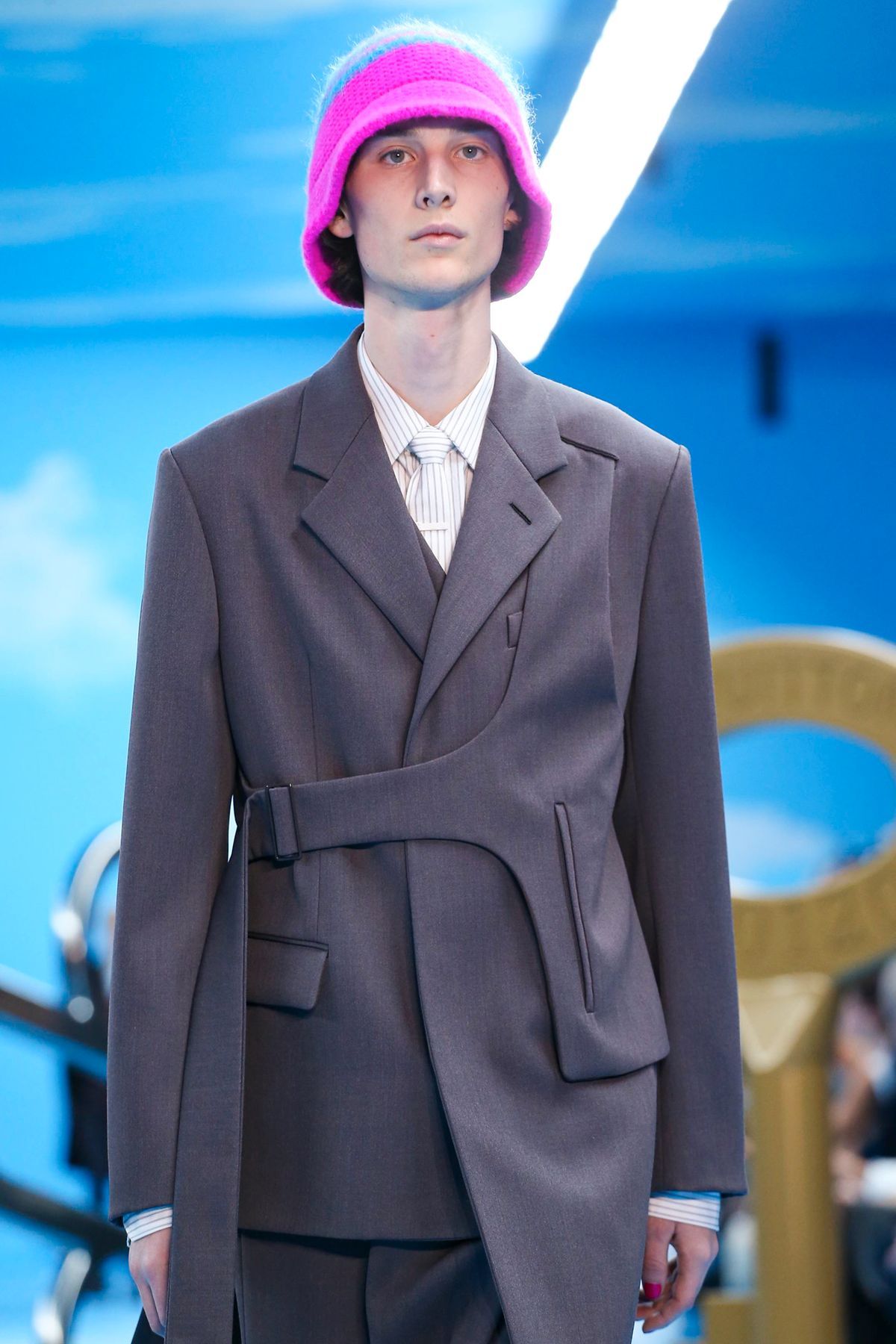 Un certo tipo di straniamento è stato impiegato anche nei look della collezione, in cui i capi classici del guardaroba maschile sono stati decostruiti o sottilmente modificati tramite layering inaspettati, gradienti di colori, incrostazioni di cristalli e costruzioni sartoriali insolite. Un tema visivo importante è stato il cielo azzurro punteggiato da nuvole, fondale caro a molta pittura surrealista e specialmente a Renè Magritte, che è stato riproposto in un’intera sezione di look, decorati con una stampa all-over simile a quello del setting dello show.