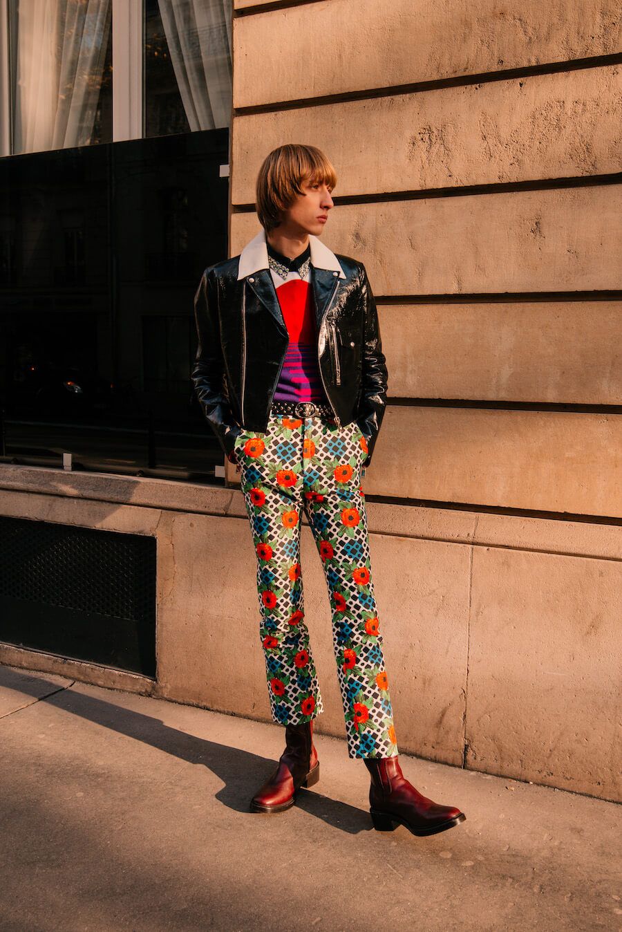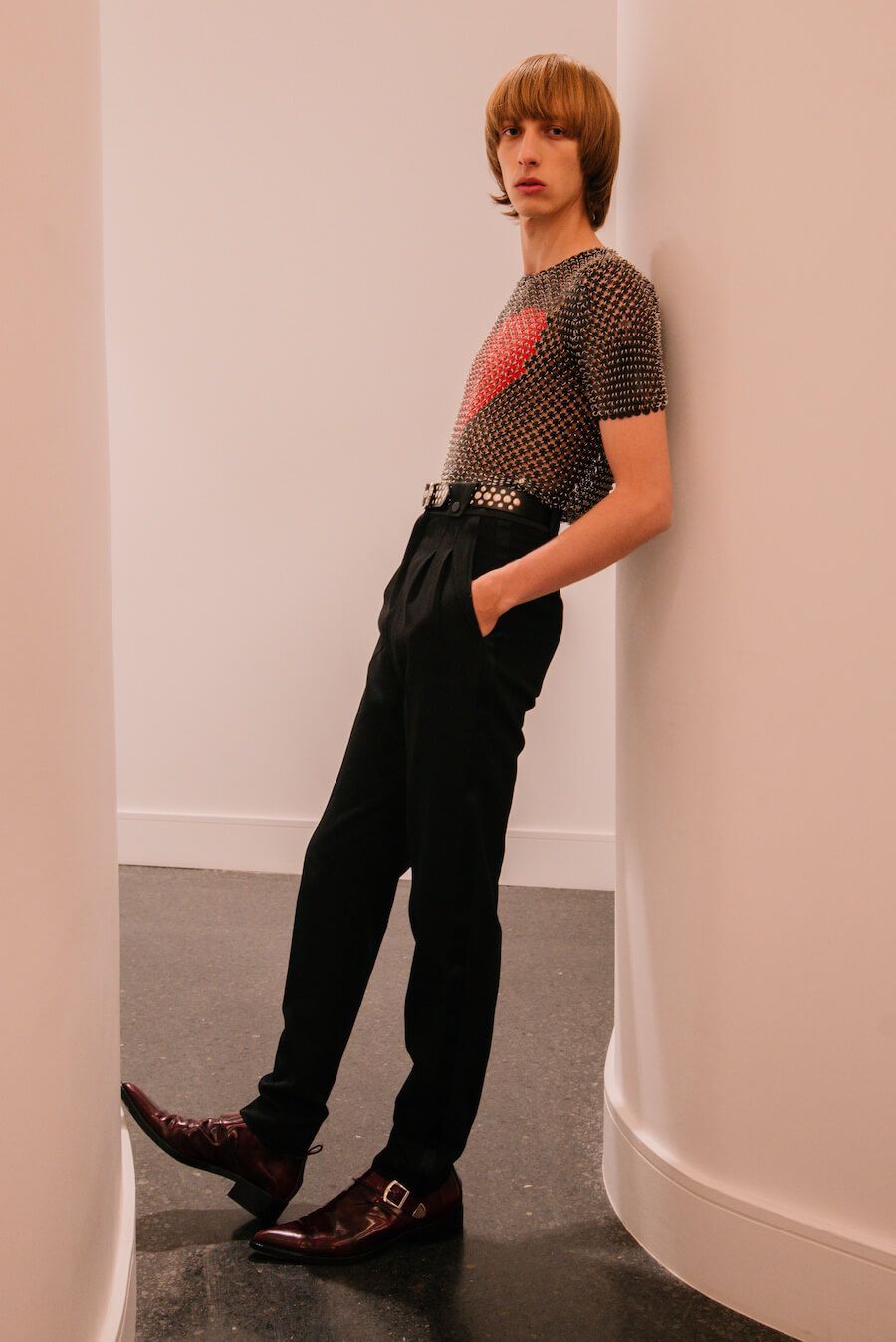 Un chiaro riferimento agli anni '60 e'70: giacche da biker, maglie couture di catene, lunghi trench e spalle prorompenti, e per finire un mix e match di stampe micro-fiori da un look romantico e vivace che si intrecciano tra loro. Da sempre, Paco Rabanne è sinonimo di traslazione di silhouette innovative che volgono lo sguardo a dettagli futuristici. Il marchio, diretto attualmente da Juliene Dossena, si lancia per la prima volta nell’impresa del menswear.