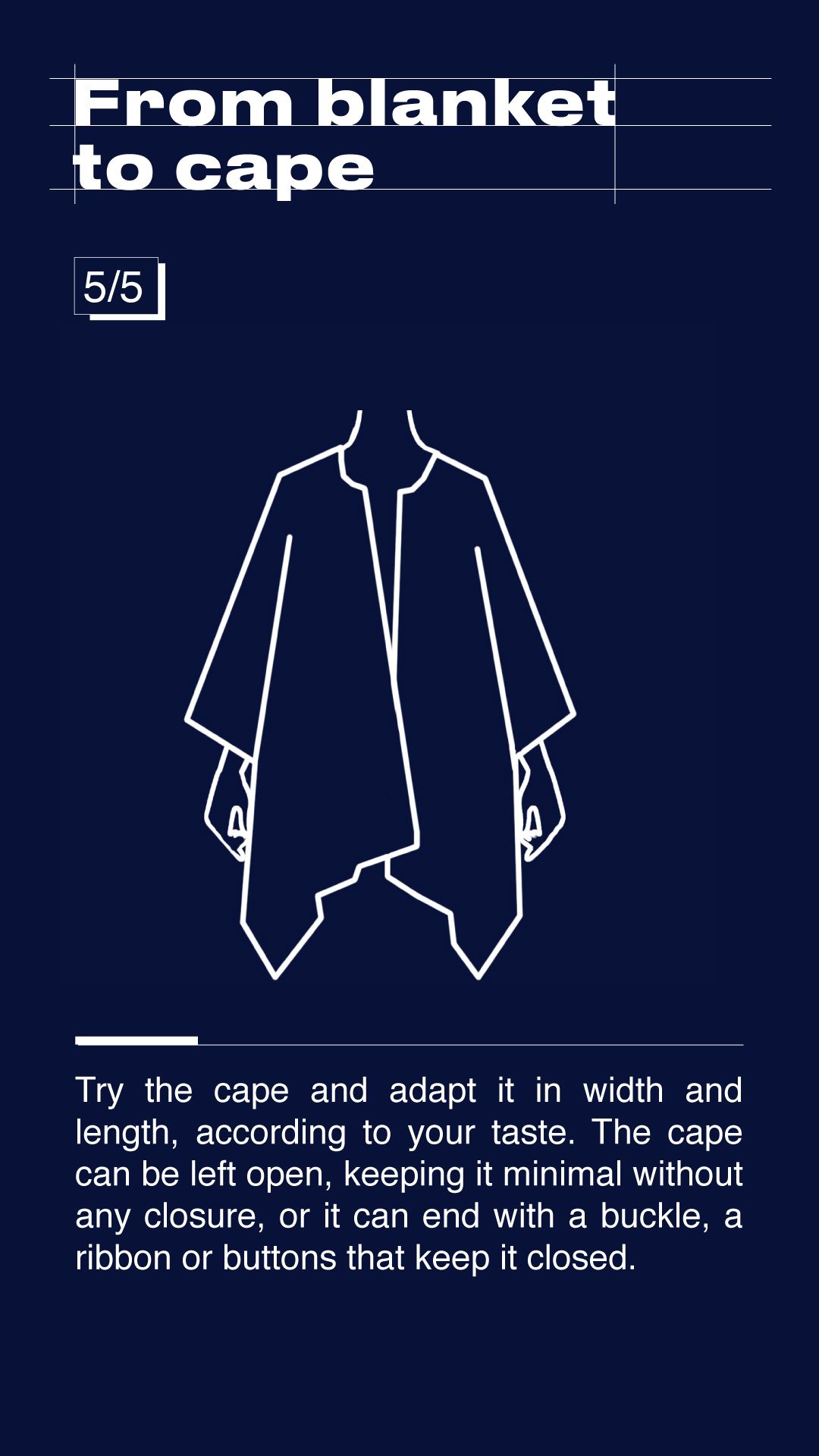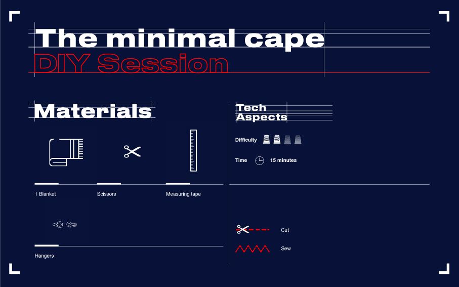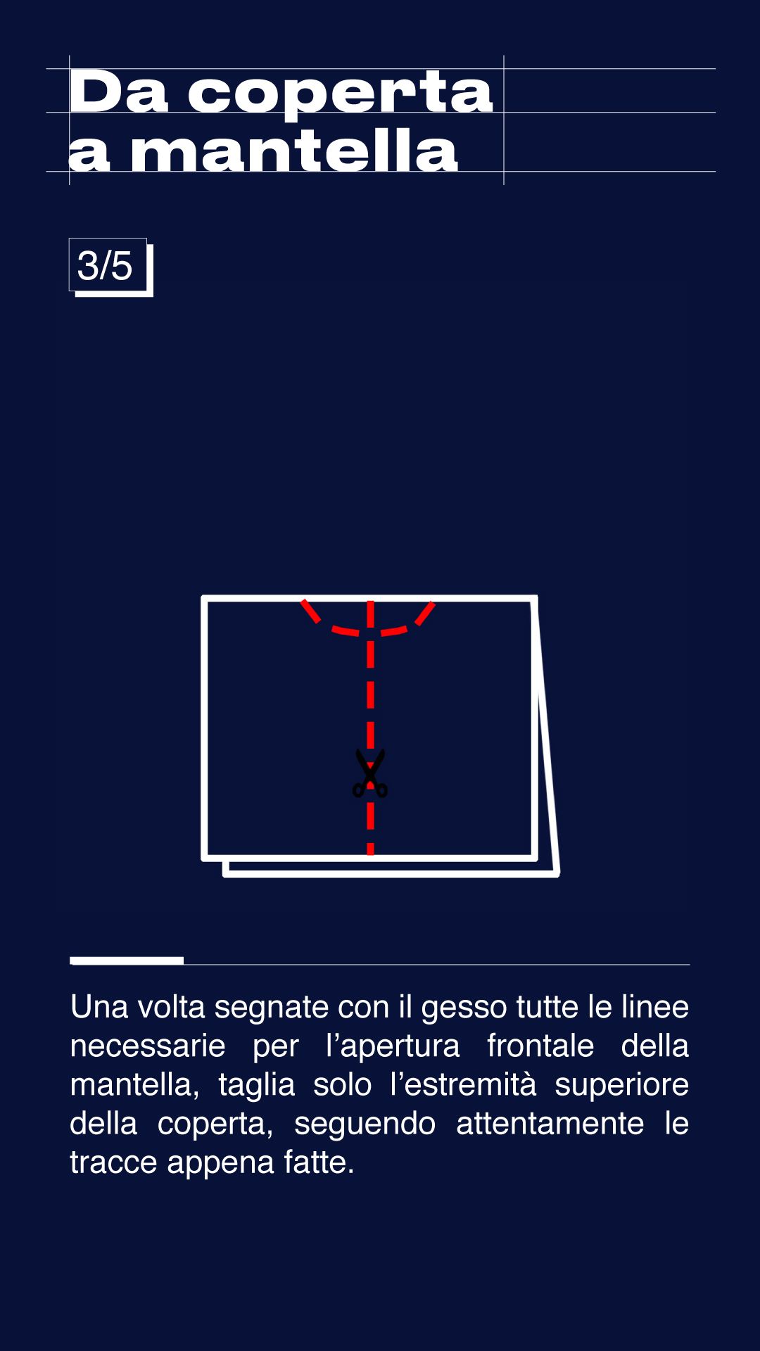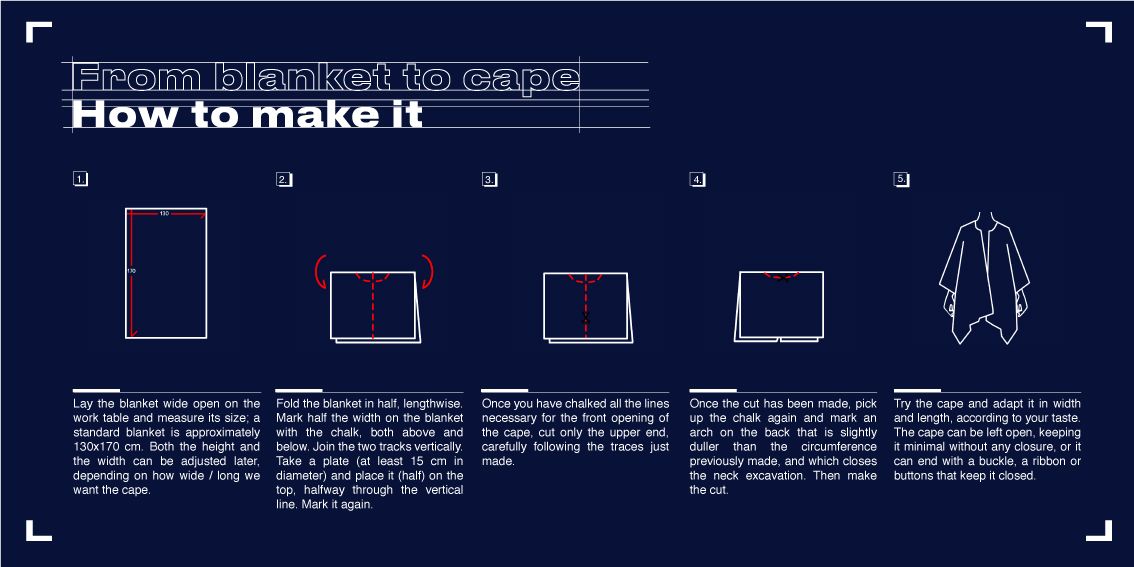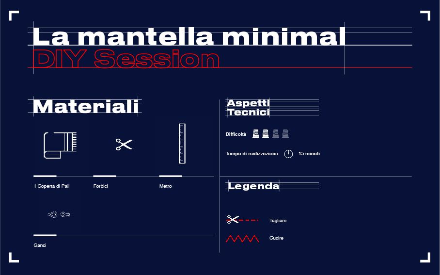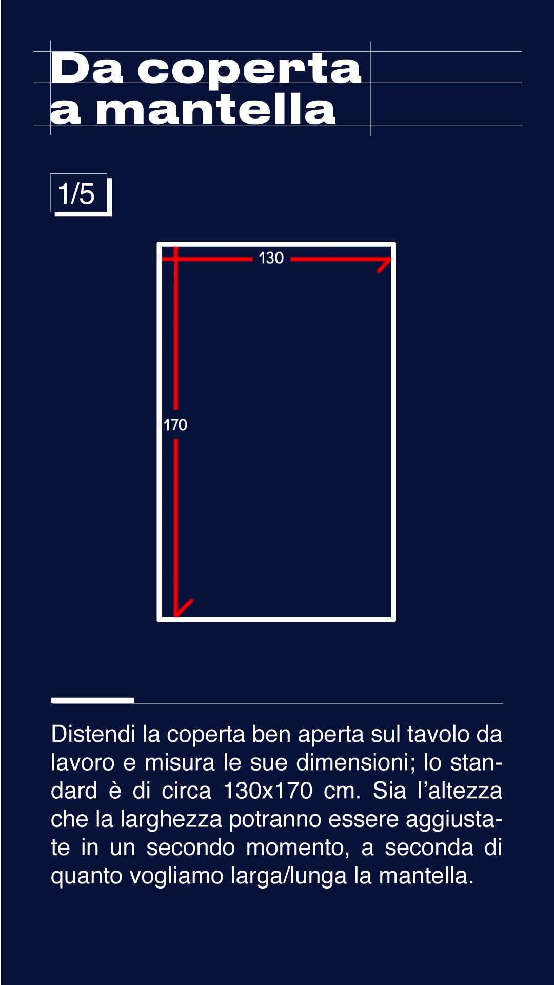 Partendo da questa consapevolezza, il pile che abbiamo tutti a casa non sarà sicuramente un tessuto riciclato, ma possiamo pensarci noi a renderlo tale, trasformando una semplice coperta in una mantella da indossare nelle giornate più fredde. La coperta utilizzata è un plaid 130x170 cm, 100% poliestere, di colore bianco e con frange alle due estremità. Per rendere la futura mantella più minimale e semplice possibile, occorre eliminare le frange, lasciando le due estremità a taglio vivo, senza rifiniture inutili. Less is more.