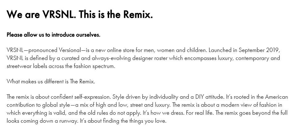 Considerato che Nike ha interrotto a Novembre le sue vendite su Amazon e che il gruppo LVMH ha pubblicamente dichiarato di non avere interessi a condurre le proprie vendite sulla piattaforma, VRSNL potrebbe essere una “palestra” in cui Amazon, con discrezione, si allena alla sua entrata nel luxury e-commerce, una maniera di sondare il terreno o la beta version di un progetto più ampio e articolato. La sezione “The Remix” del sito offre anche approfondimenti sulla storia dei vari brand (commettendo un errore di spelling nello scrivere “Bottega Veneta” con una “t” in più) simile all’Editorial Archive di Ssense o gli editoriali di Farfetch. È chiaro insomma come VRSNL stia provando ad adeguarsi alle maggiori piattaforme e-commerce di lusso ma senza essere ancora pronta ad aprirsi al grande pubblico.
