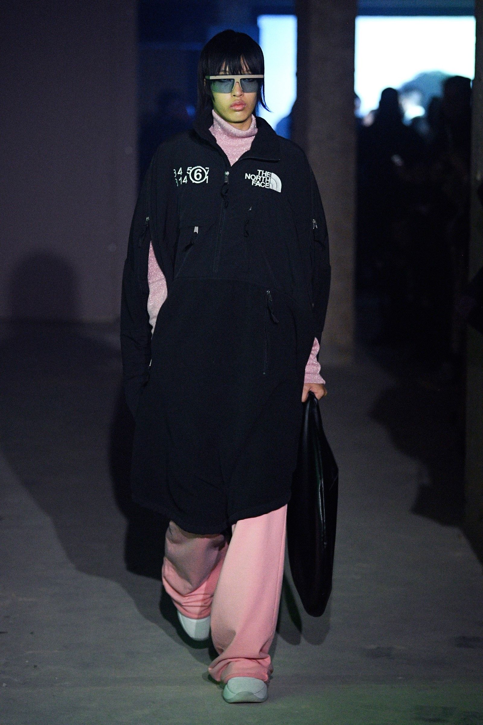 Il leitmotiv concettuale che ispira l'output creativo del collettivo anonimo dietro MM6, infatti, è la forma geometrica circolare. Giacconi e fleece sono stati ibridati con mantelle e privati delle maniche, sostituite da sistemi di zip regolabile, modificandone la silhouette. Il risultato è un outerwerar con una fortissima estetica avant-garde ma più vicina alle silhouette prive di braccia viste sulla passerella di Raf Simons che alle grandiose e architettoniche creazioni firmate da Craig Green o Piccioli per Moncler.