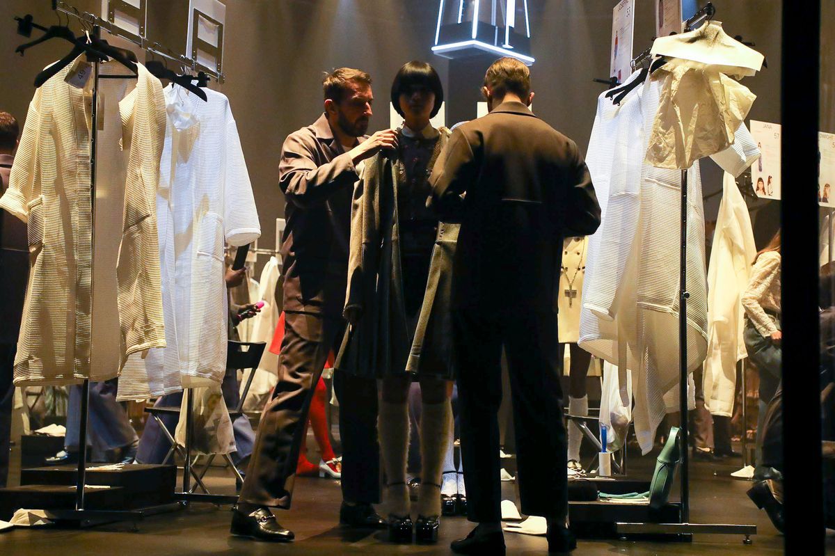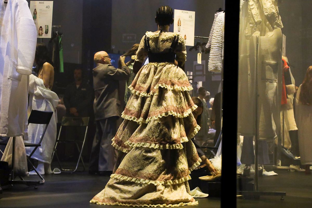 “Ho sempre pensato alla sfilata come ad un accadimento magico capace di sprigionare incantesimi” scrive Michele in una lettera pubblicata su Instagram poche ore prima dello show. Introdotto dalle parole di Federico Fellini (“Il cinema era proprio questo: suggestione ipnotica, ritualistica […]”), lo show ha messo in scena un vero e proprio rituale di vestizione che ha celebrato “l’intelligenza collettiva che cura la gestazione con brivido che infuria”. Dalle prime immagini della diretta social, che inquadravano truccatori e modelle all'opera, fino al letterale passo in avanti fatto dagli stylist dopo l’uscita delle modelle dalla struttura di vetro.