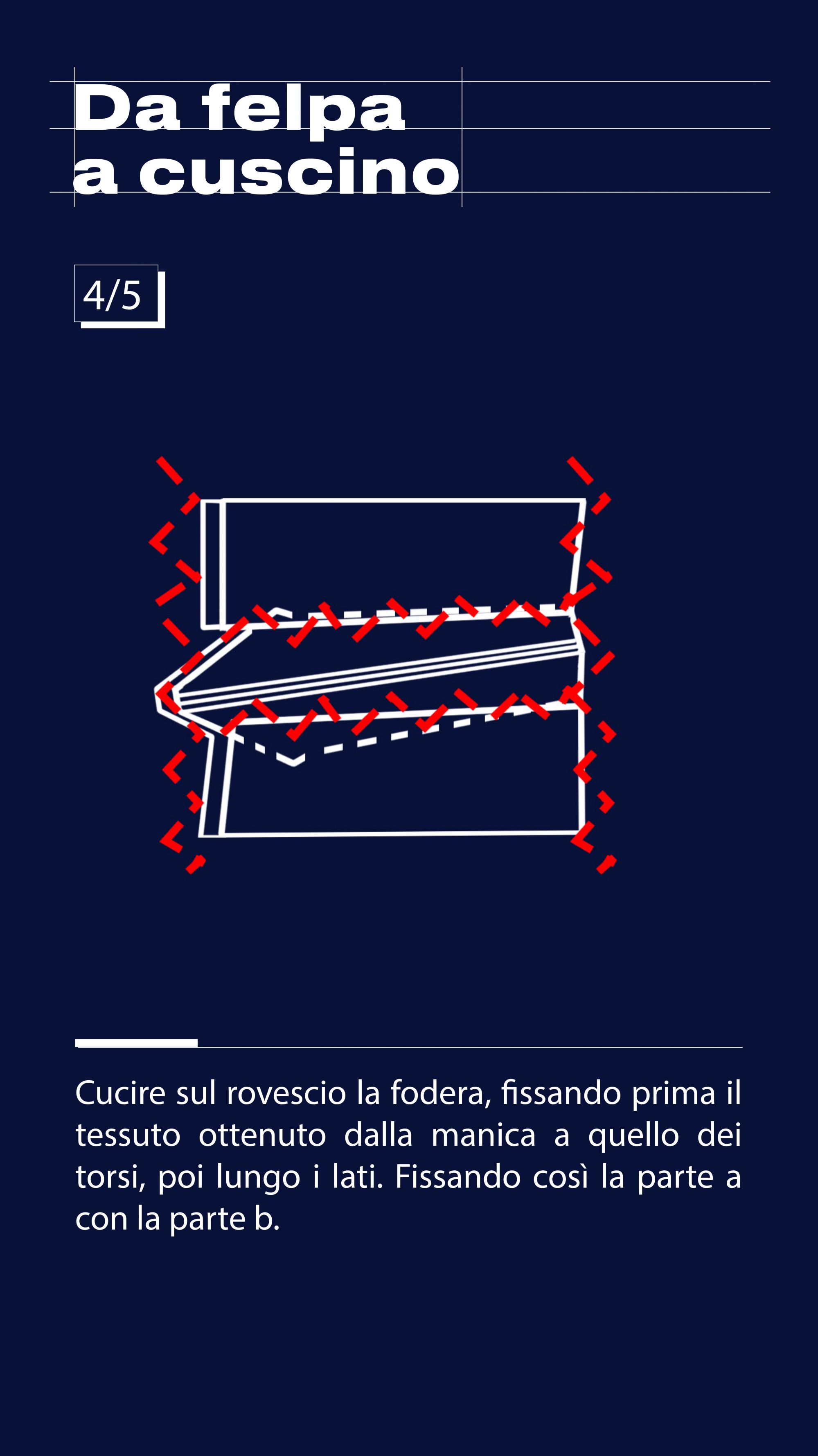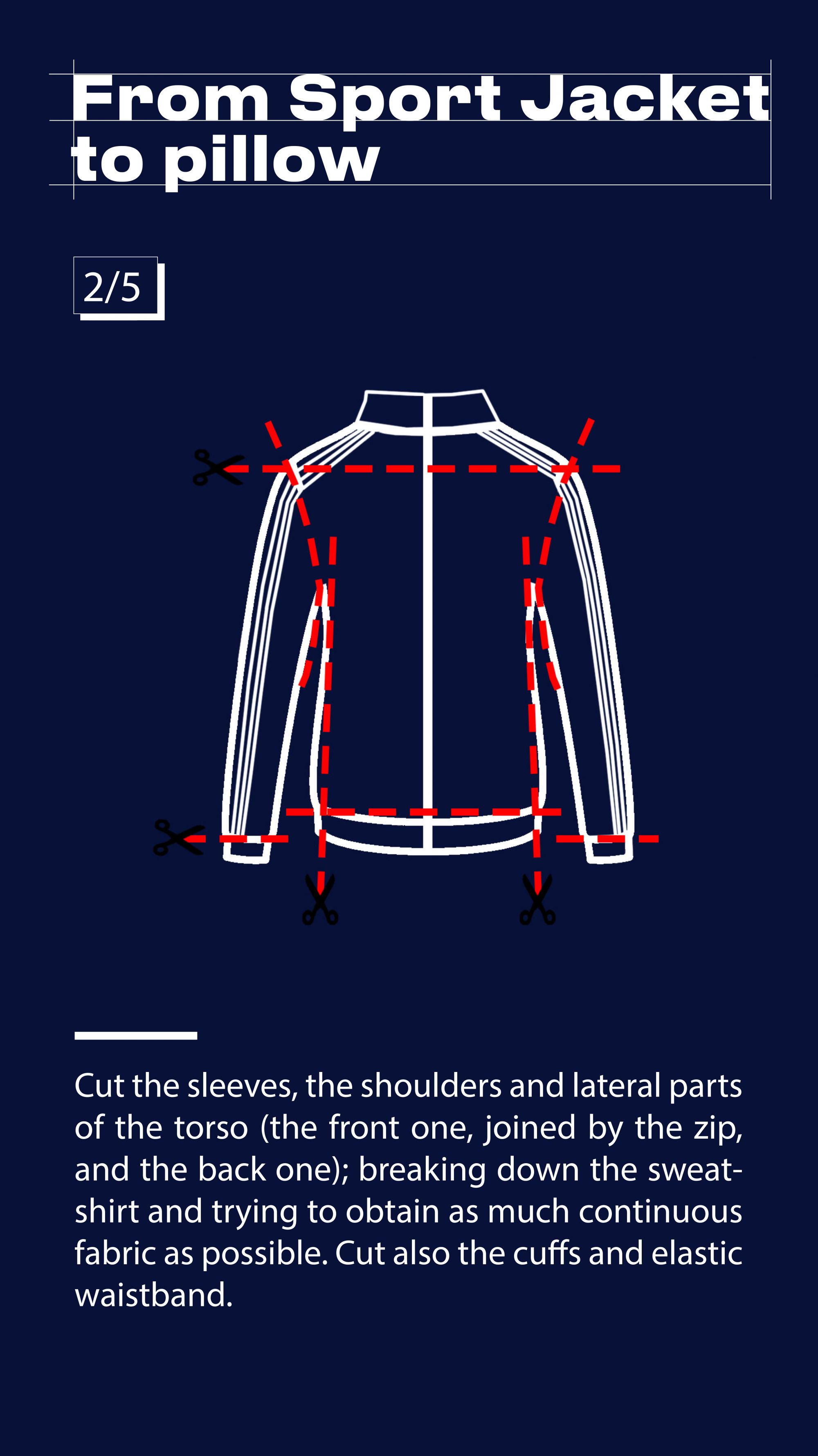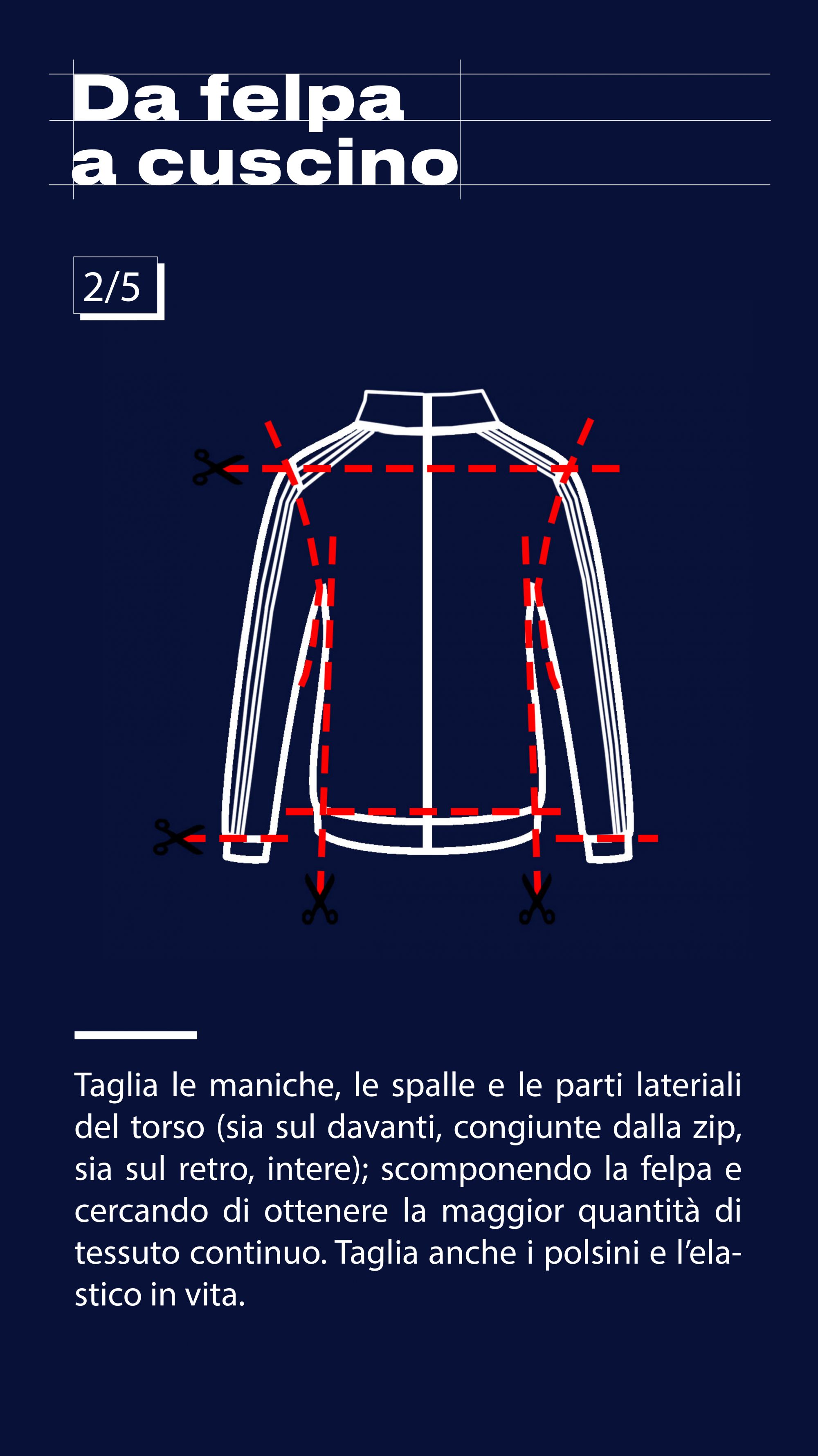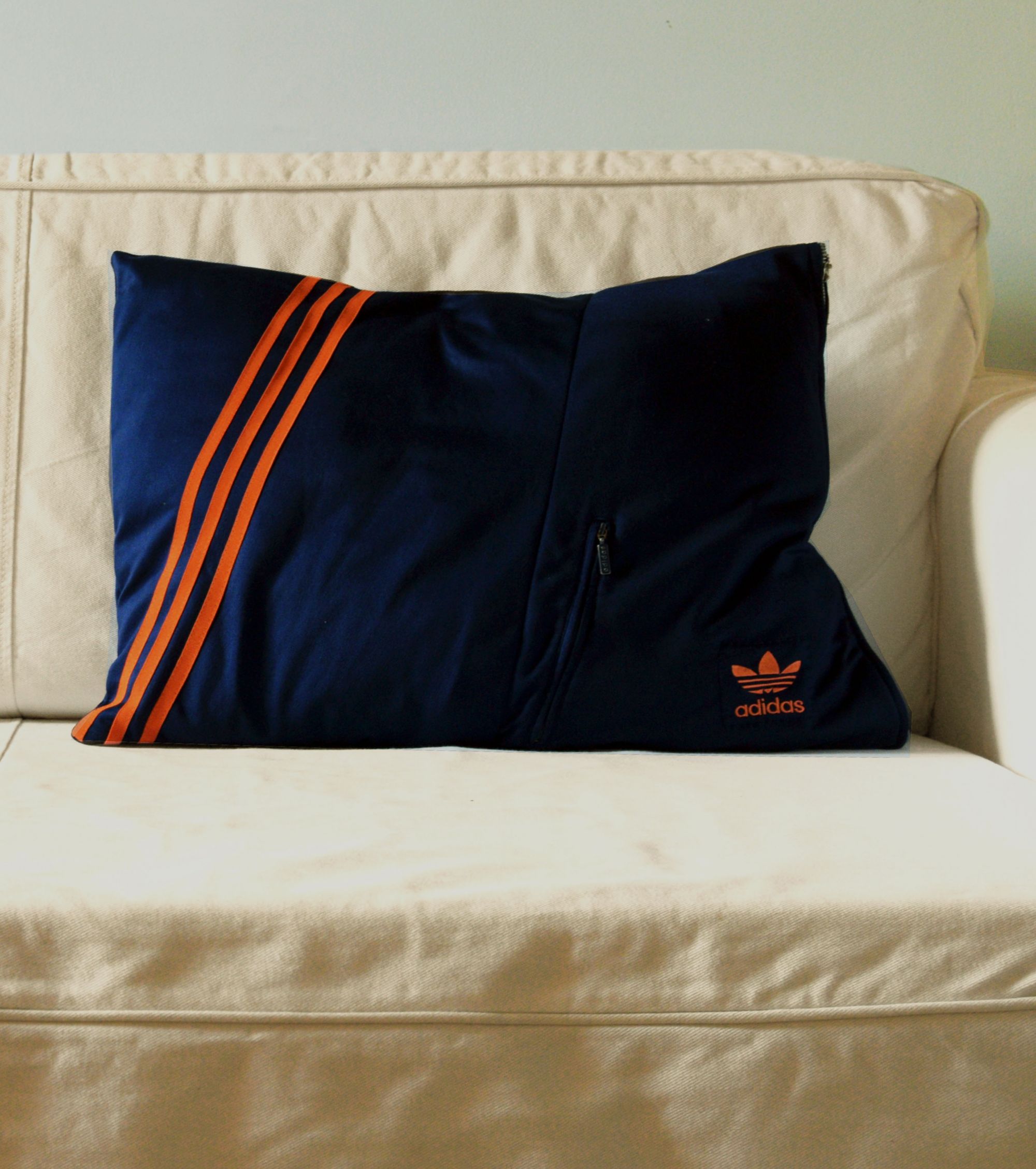Il tessuto, morbido e non eccessivamente pesante, è perfetto per essere trasformato in una fodera per cuscini. Per farlo avrete bisogno di una macchina da cucire in casa per tenere meglio insieme le parti, ma il trucco è scomporre la felpa, cercando di ottenere la maggior quantità di tessuto continuo. Una volta che avrete tutte le parti tagliate e ben distese, potrete facilmente giocarci ed incastrarle tra loro, arrivando alla combinazione che più vi convince. Per risparmiare tempo, ho utilizzato la zip della felpa per creare l’apertura della fodera stessa, in cui verrà infilato il cuscino. Le tasche laterali, infine, si sono trasformate in comodi portaoggetti. Un investimento di stile che ne vale veramente la pena, perché oltre a non aver buttato un capo, ho donato anche un aspetto più street al divano.