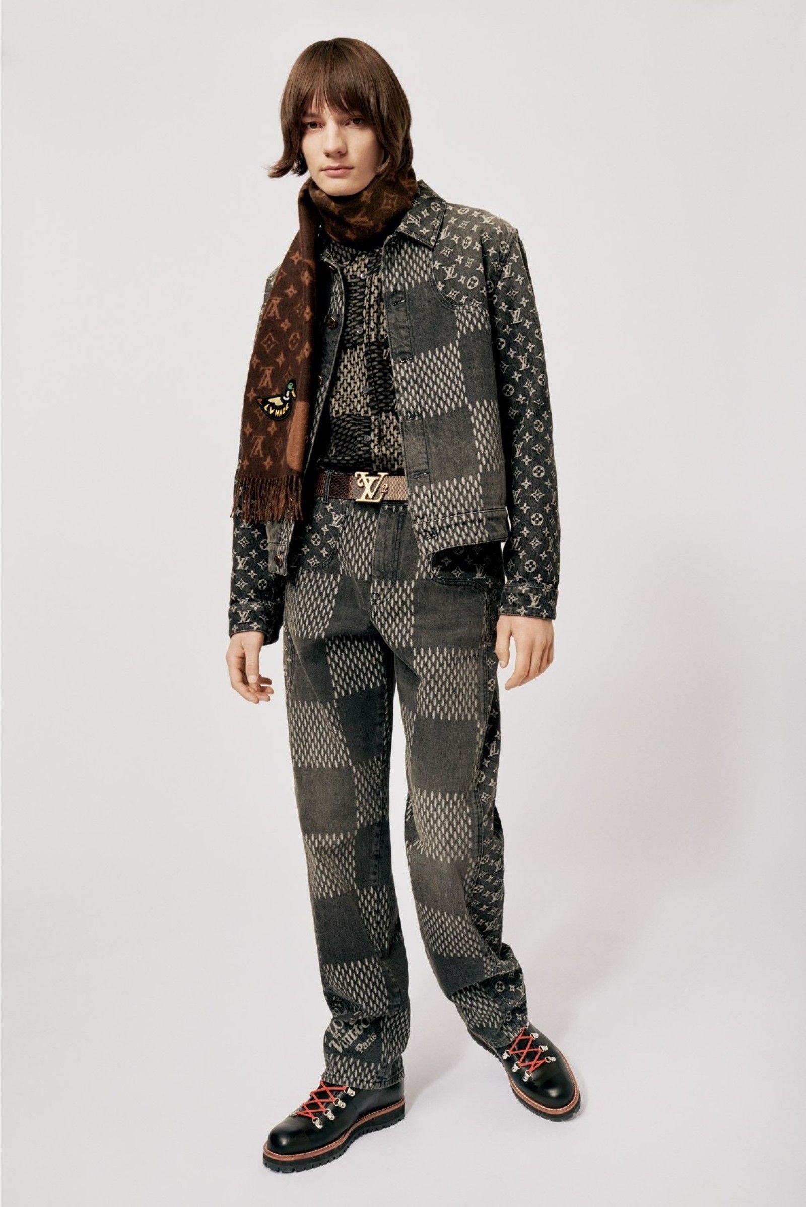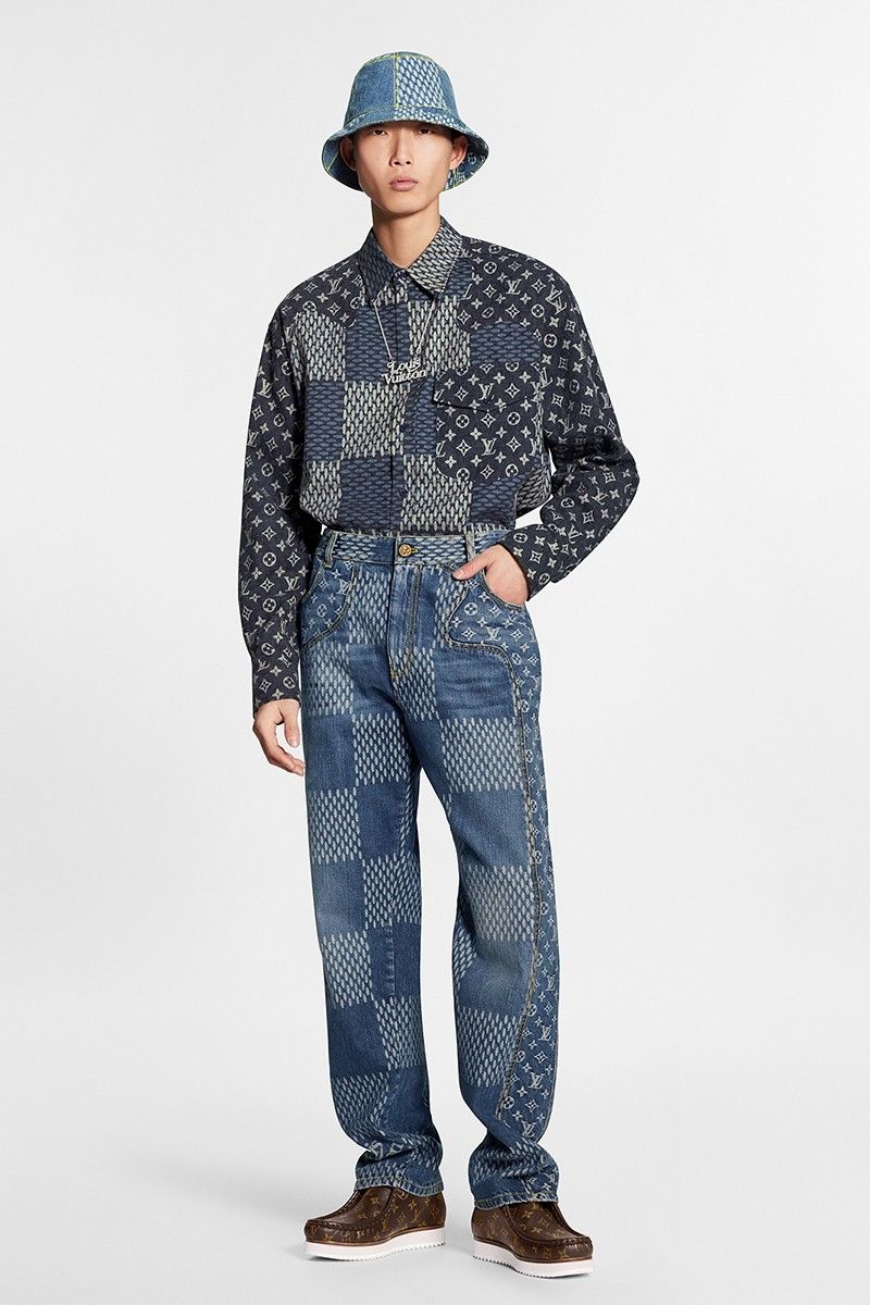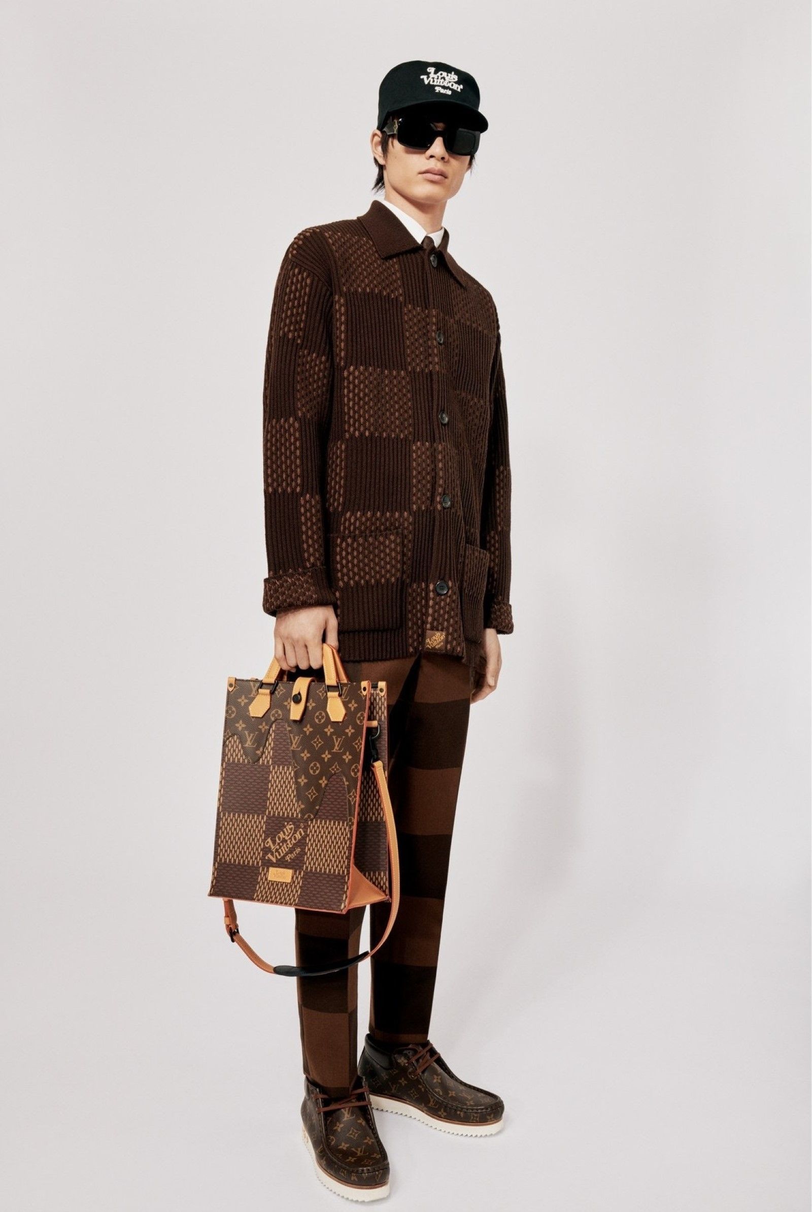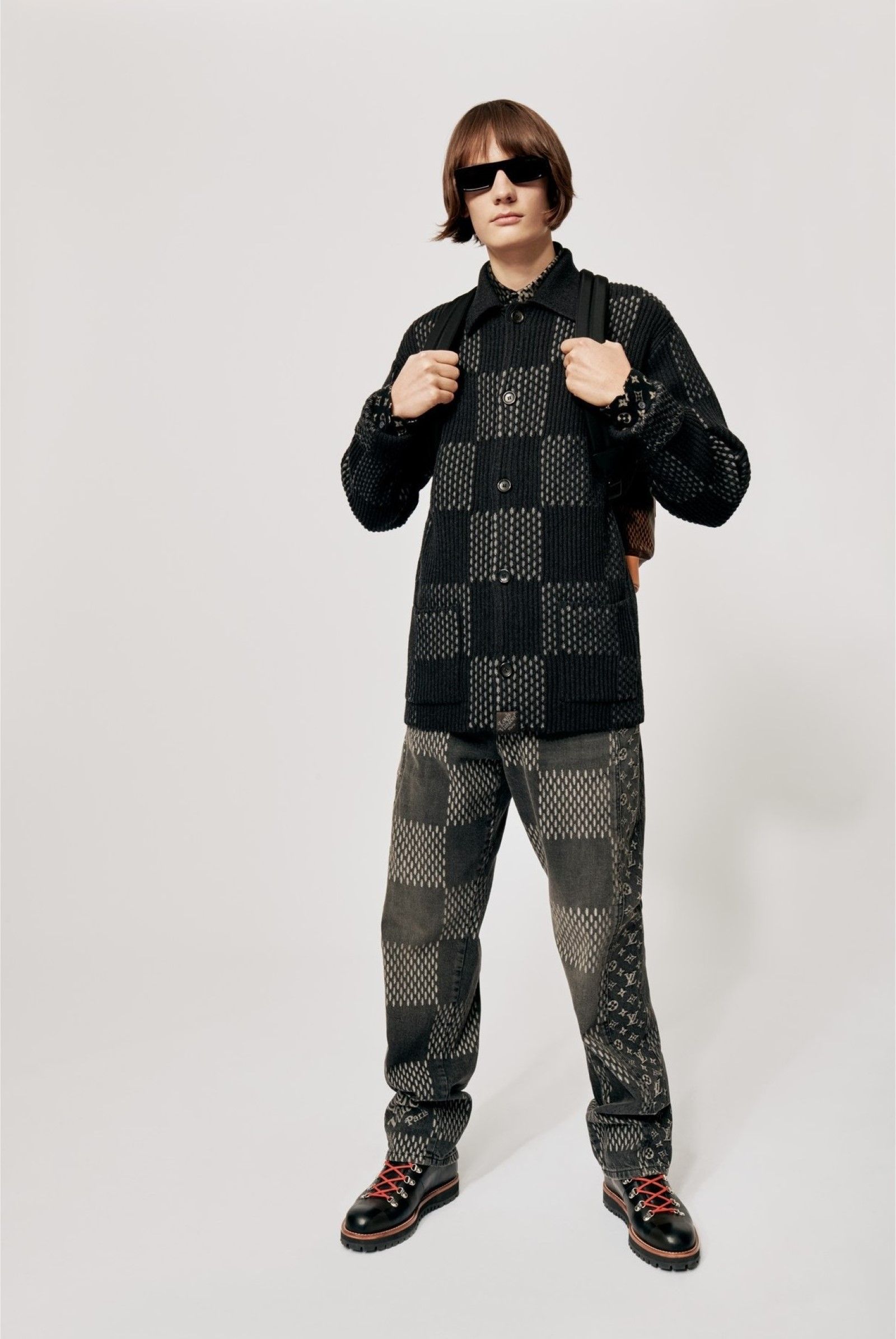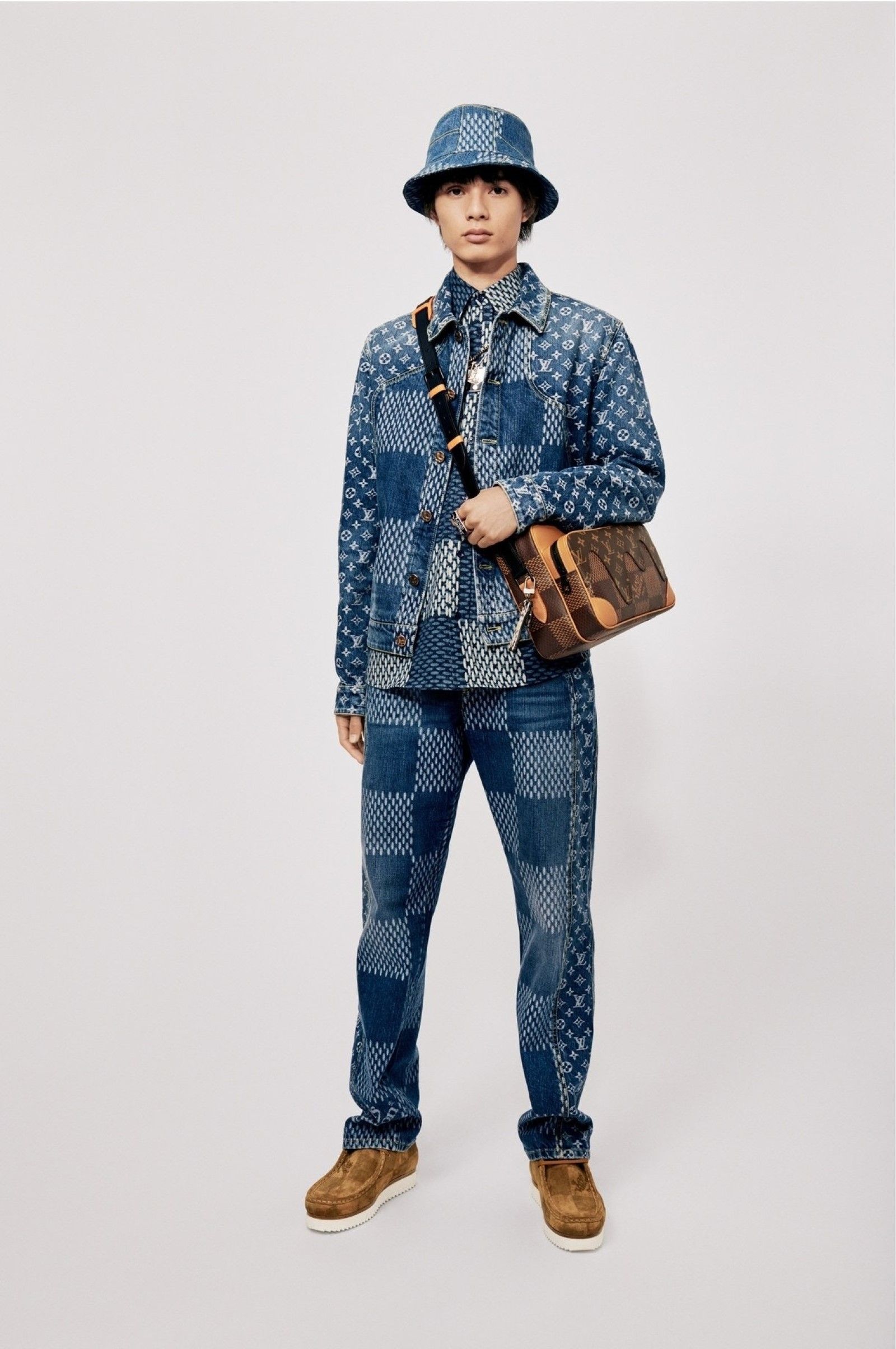 La collezione copre tutte le aree del menswear, dai completi sartoriali all’outerwear, dai jeans agli accessori fino alla pelletteria. I due protagonisti grafici sono il pattern a quadri, detto LV Damier Check, e l’effetto dripping. Specialmente negli item di pelletteria come borse e zaini i due pattern si mescolano, creando l’effetto del classico monogram Louis Vuitton che “cola” sulle sezioni a quadri. L’effetto “drip” rappresenta una fusione perfetta dei linguaggi dei rispettivi designer, Nigo lo aveva infatti introdotto per la prima volta nelle sue collezioni per Icecream. Alcuni degli item più vicini ai codici dello streetwear sono i completi in denim e un puffer jacket di nylon nero, mentre il resto della collezione appartiene a quel nuovo lusso sartoriale su cui Abloh ha lavorato sin dalla sua collezione Pre-Fall 2020 “Pivot” per Off-White™.