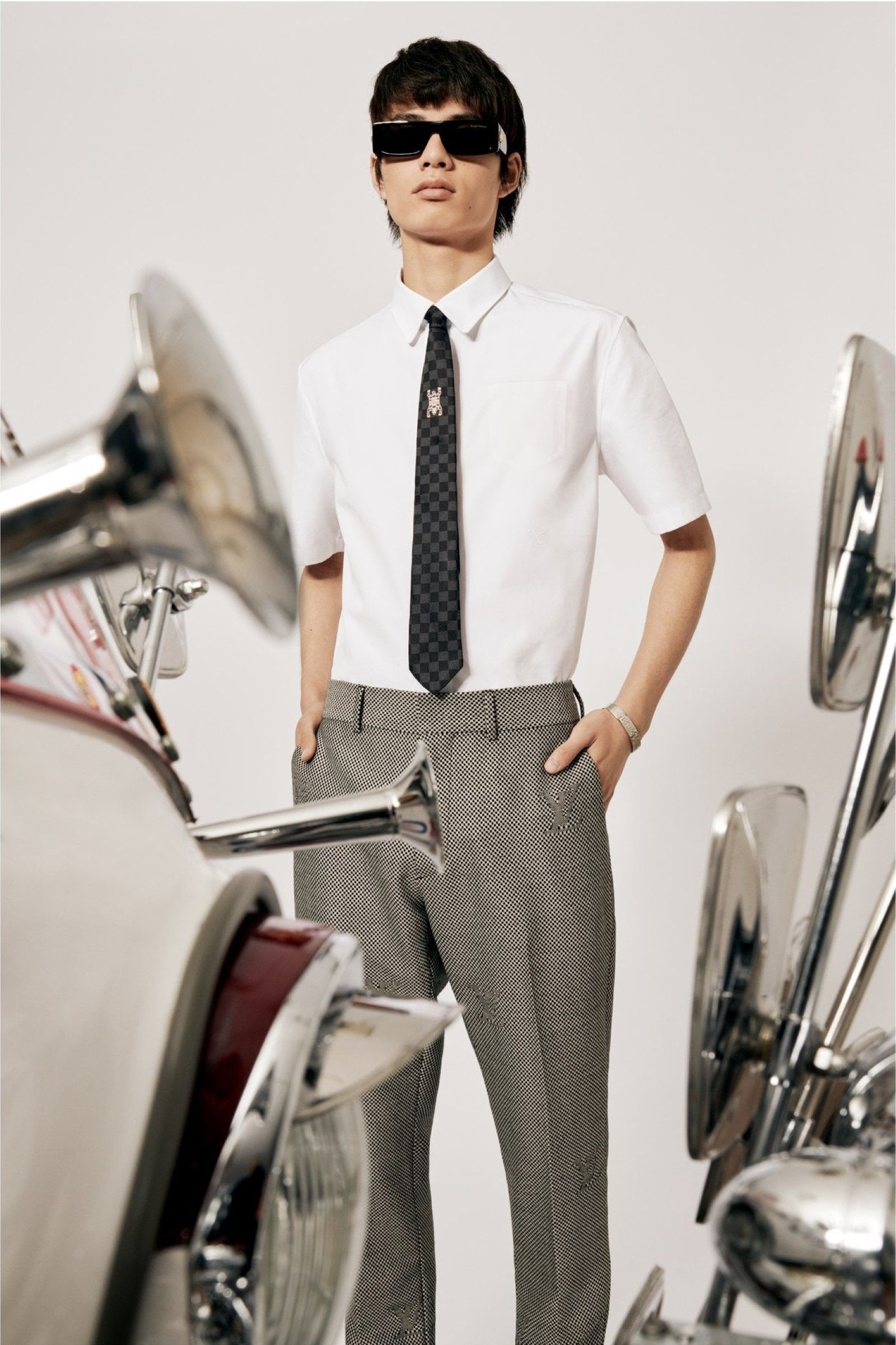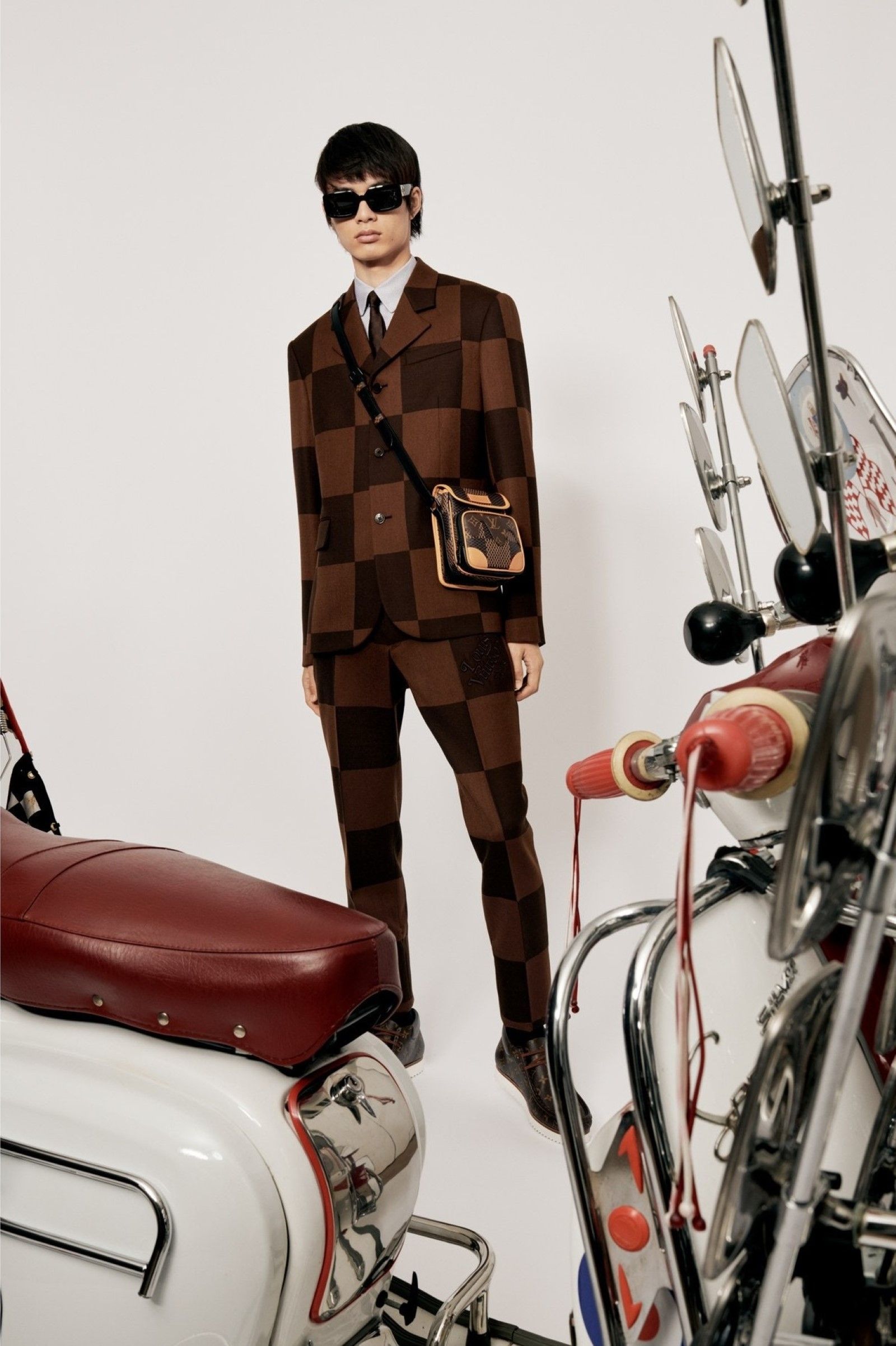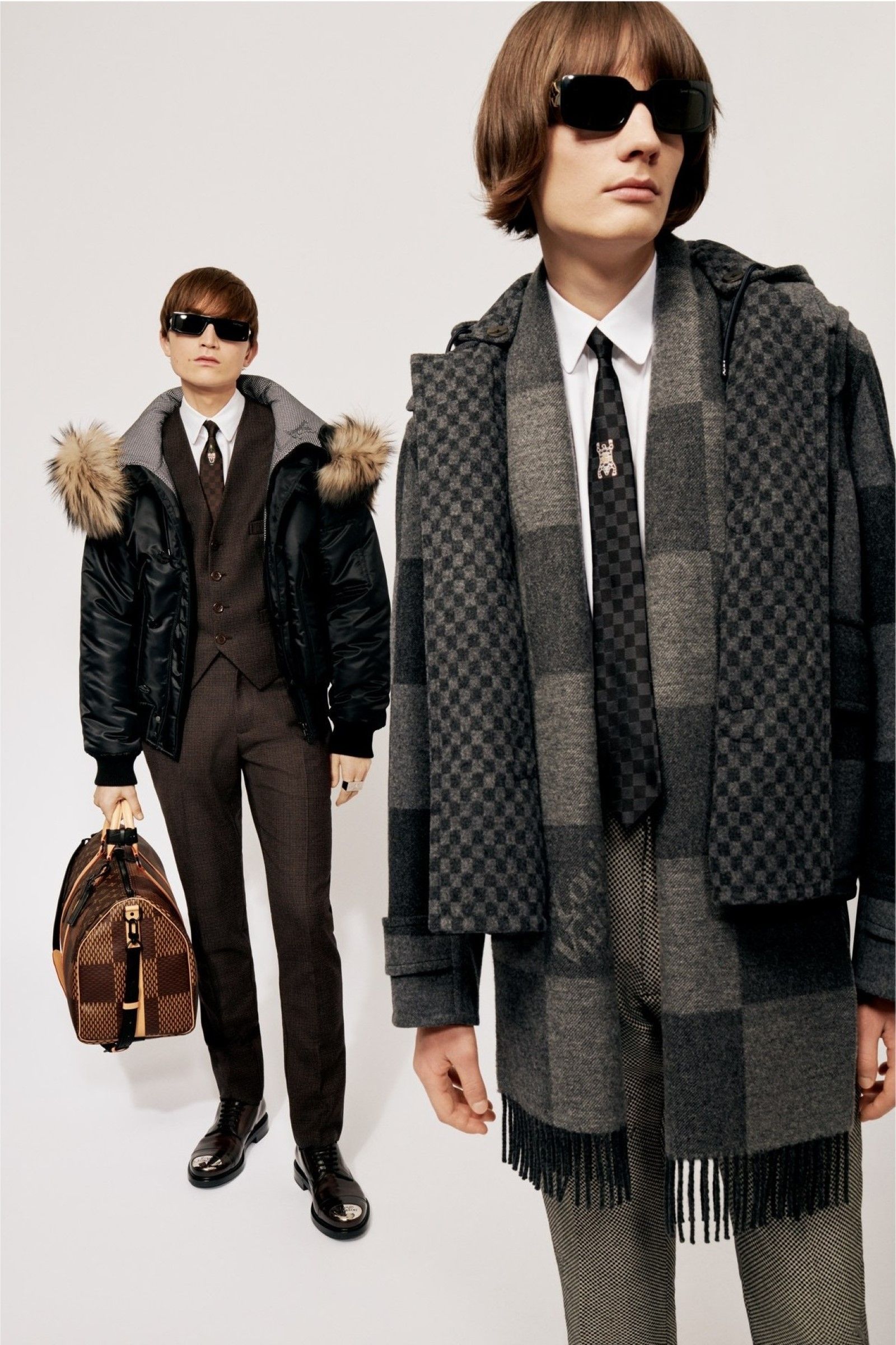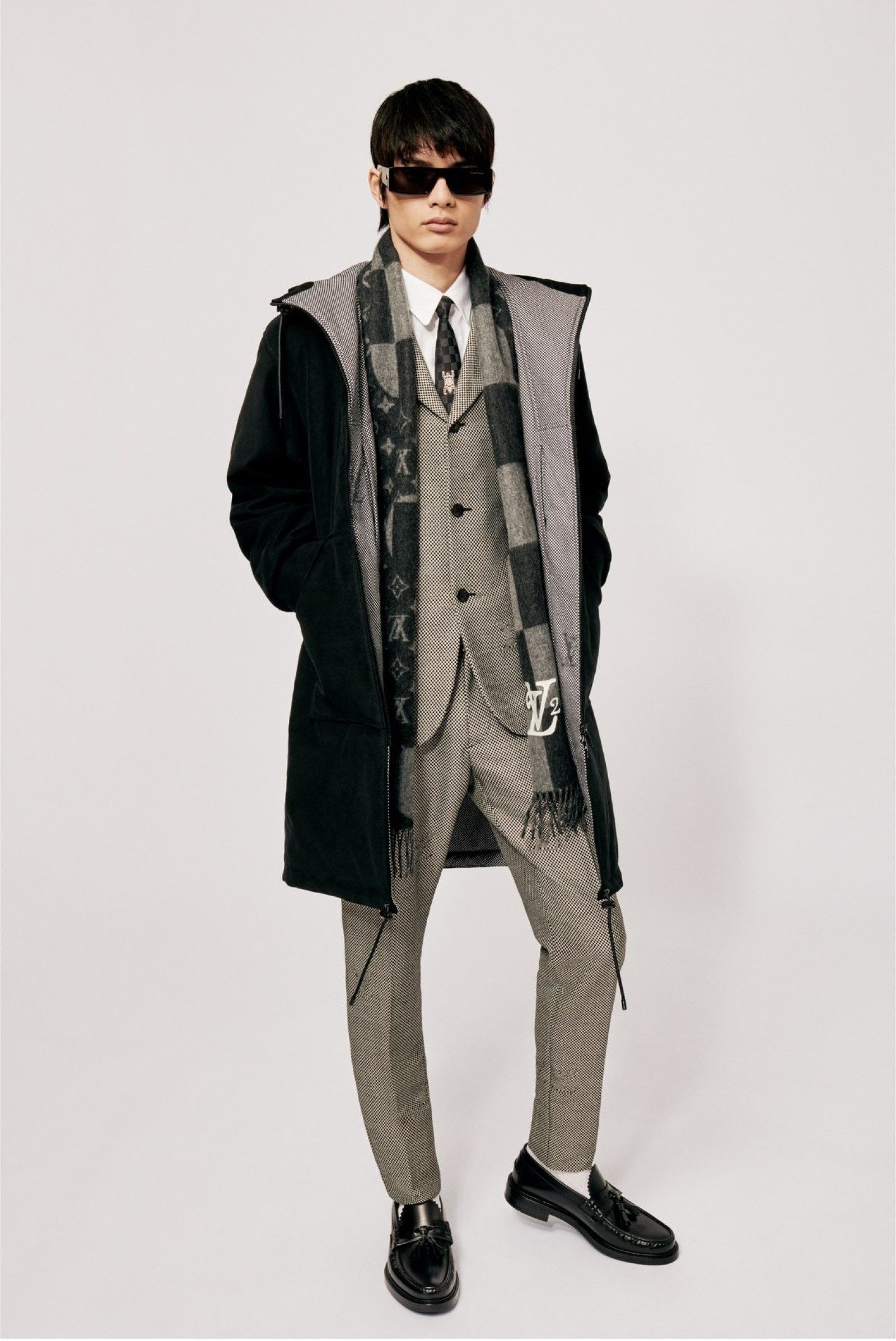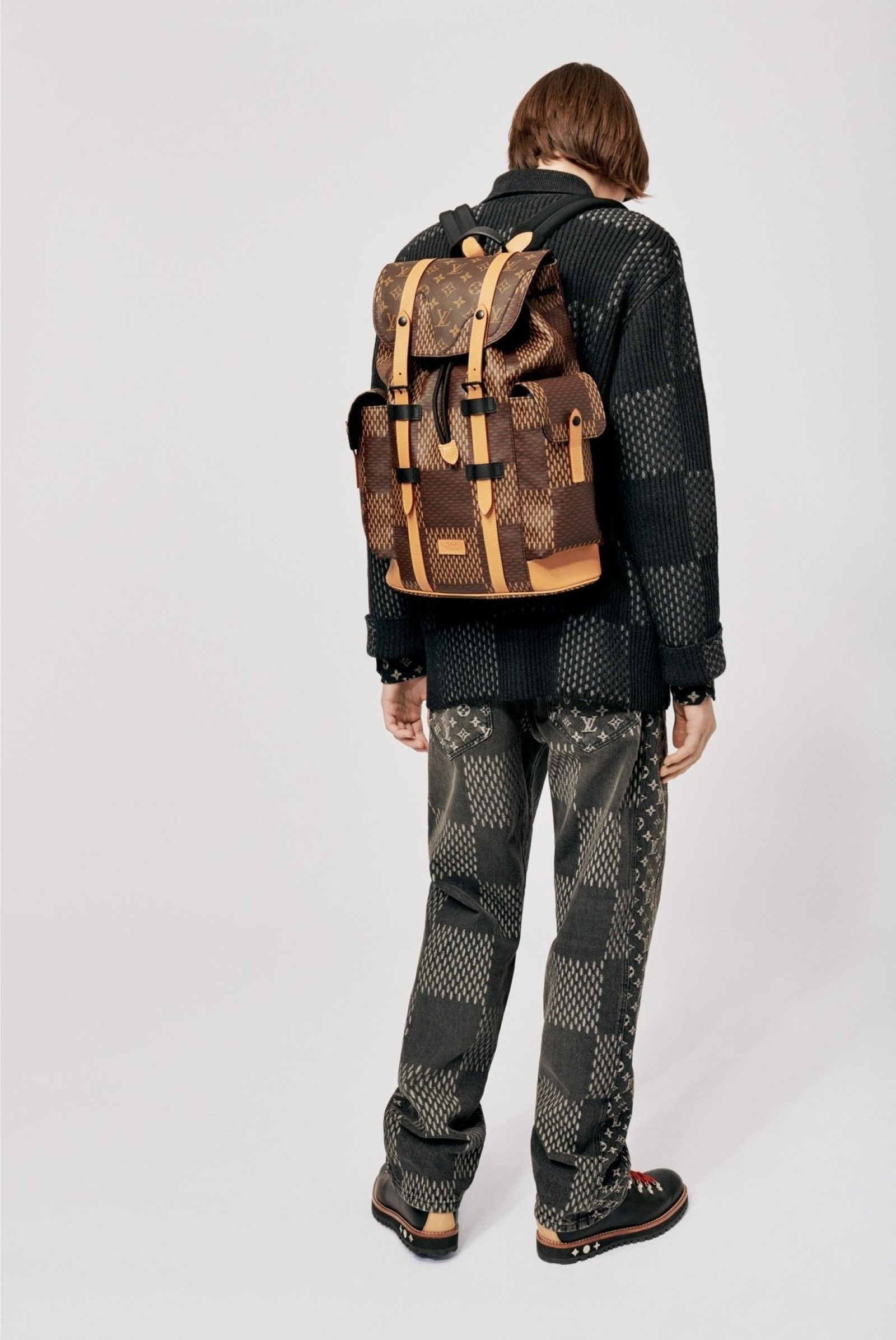 La collezione copre tutte le aree del menswear, dai completi sartoriali all’outerwear, dai jeans agli accessori fino alla pelletteria. I due protagonisti grafici sono il pattern a quadri, detto LV Damier Check, e l’effetto dripping. Specialmente negli item di pelletteria come borse e zaini i due pattern si mescolano, creando l’effetto del classico monogram Louis Vuitton che “cola” sulle sezioni a quadri. L’effetto “drip” rappresenta una fusione perfetta dei linguaggi dei rispettivi designer, Nigo lo aveva infatti introdotto per la prima volta nelle sue collezioni per Icecream. Alcuni degli item più vicini ai codici dello streetwear sono i completi in denim e un puffer jacket di nylon nero, mentre il resto della collezione appartiene a quel nuovo lusso sartoriale su cui Abloh ha lavorato sin dalla sua collezione Pre-Fall 2020 “Pivot” per Off-White™.