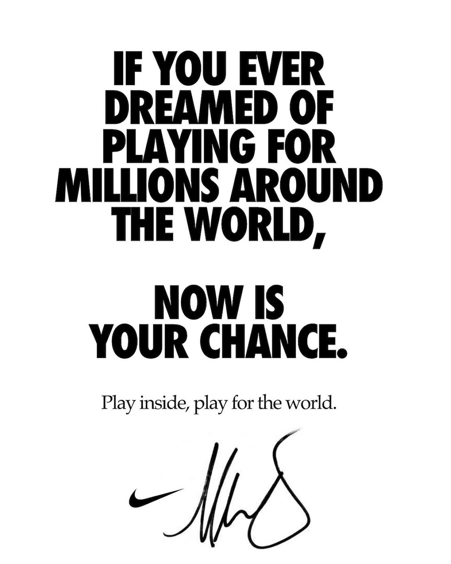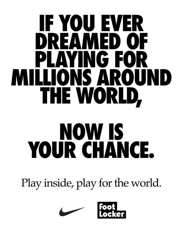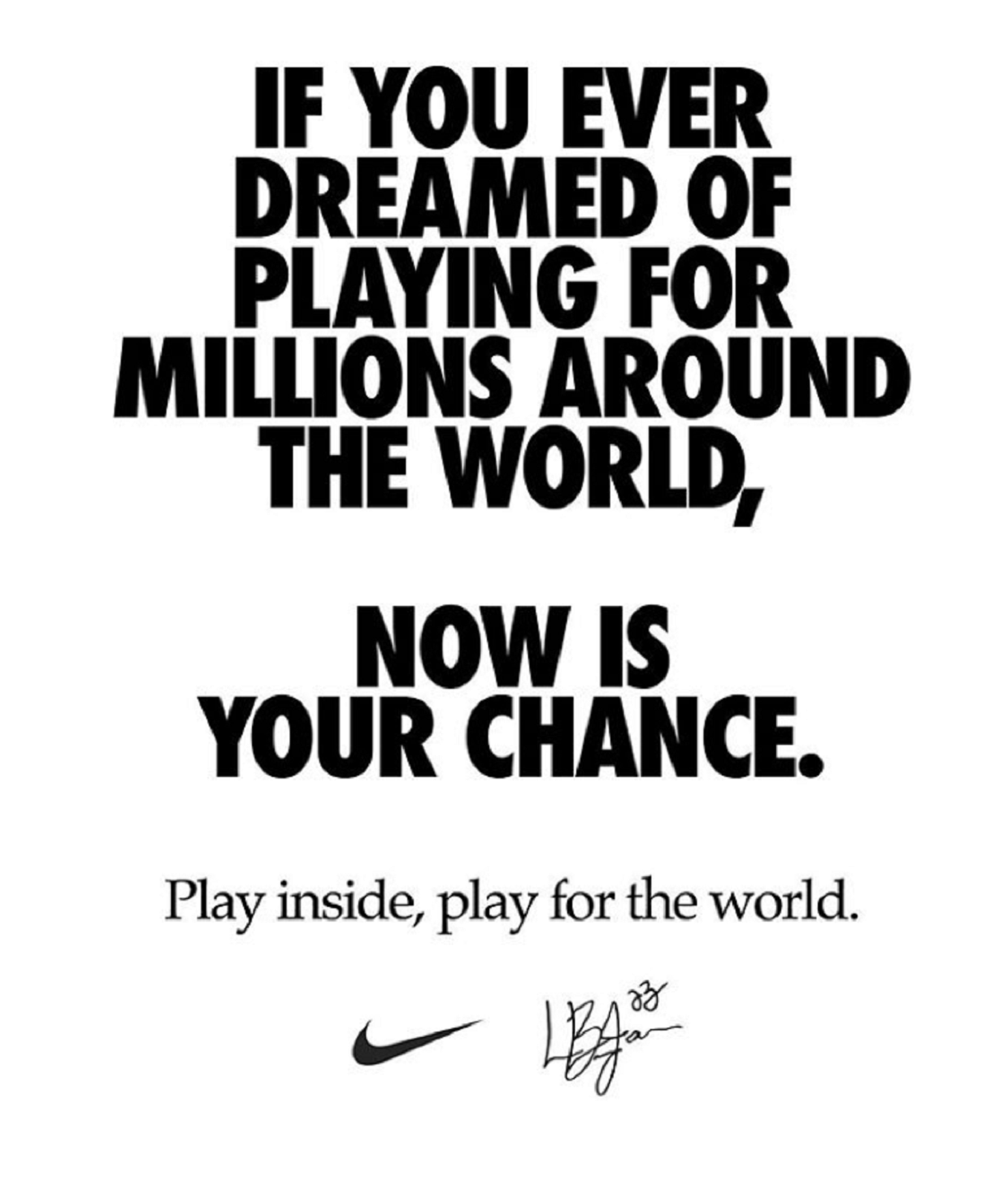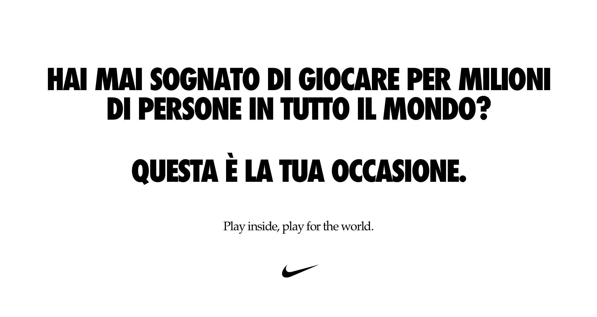 Attraverso i social media, il brand ha pubblicato un messaggio che recita ''Se hai mai sognato di giocare per persone di tutto il mondo, ora è la tua occasione. Gioca dentro, gioca per il mondo'', seguito - a mo’ di firma - dall’iconico Swoosh. Lo slogan, progettato insieme allo studio Wieden + Kennedy Portland e repostato da una serie infinita di atleti e società sponsorizzate Nike, segue l'annuncio secondo cui il marchio e la sua fondazione avrebbero stanziato oltre 15 milioni di dollari per sostenere gli sforzi per combattere il COVID-19.