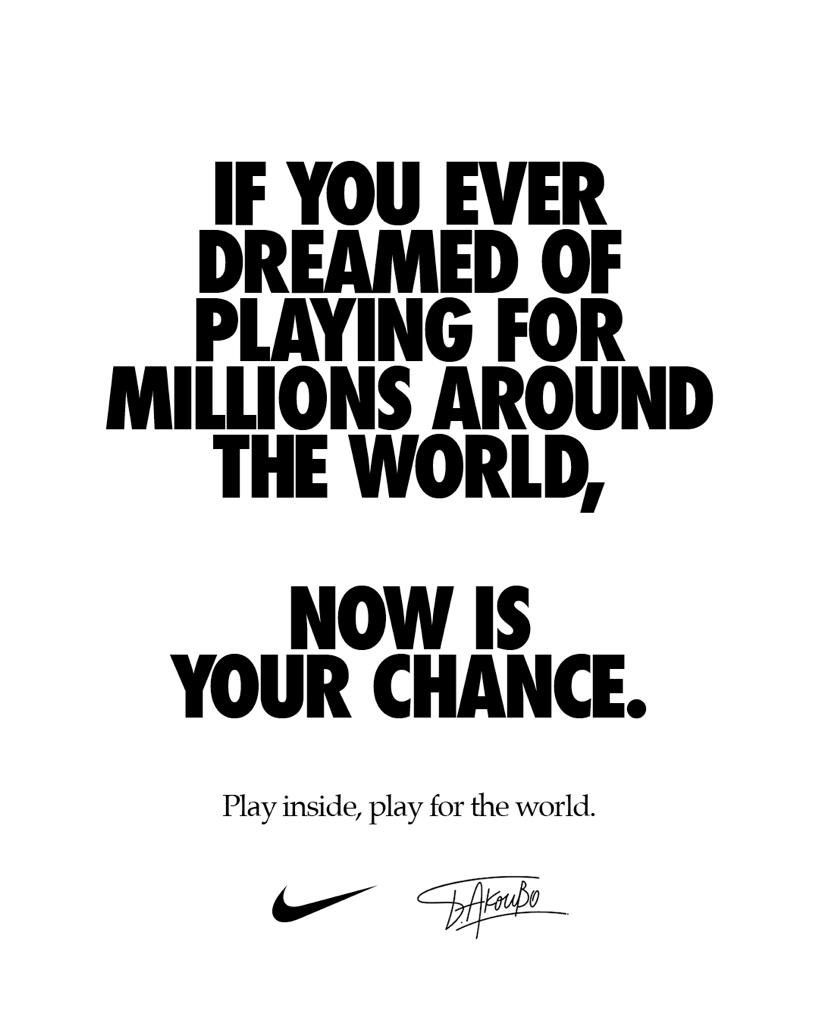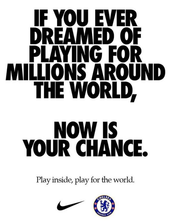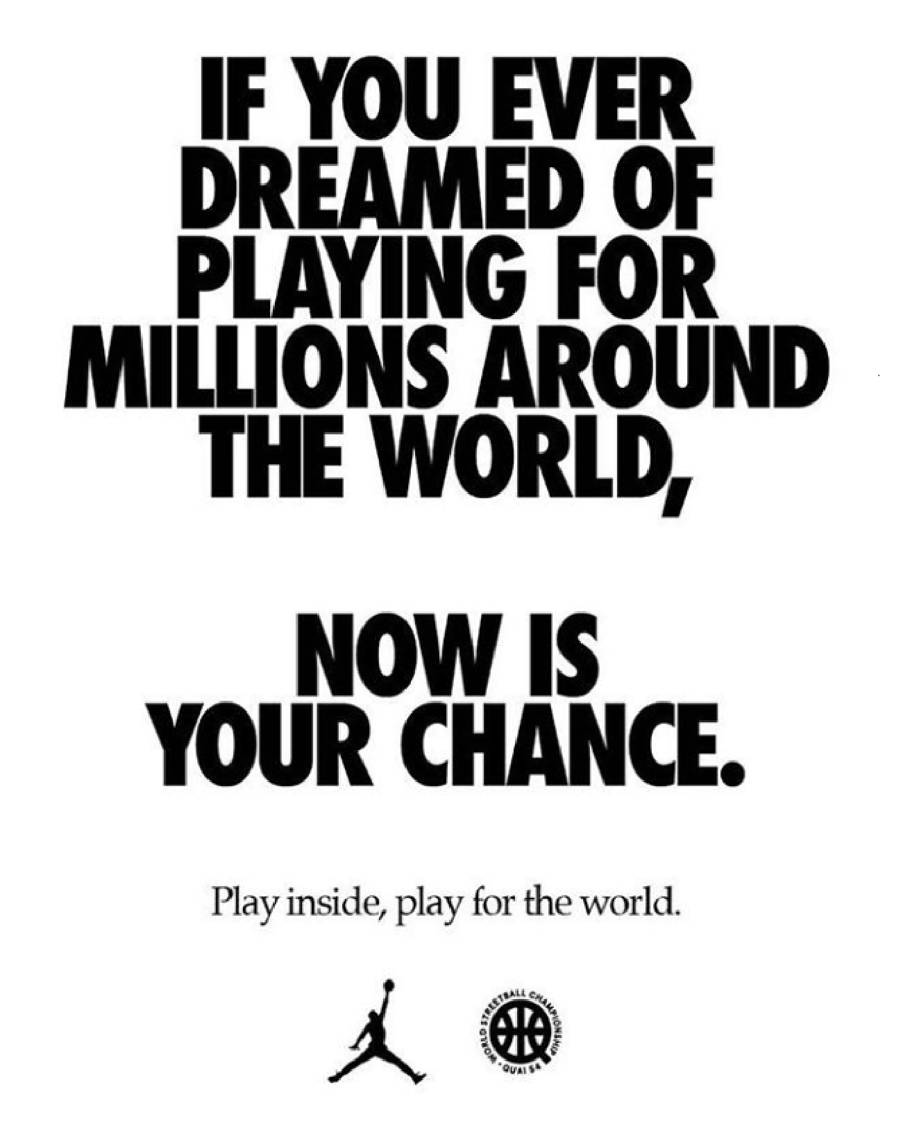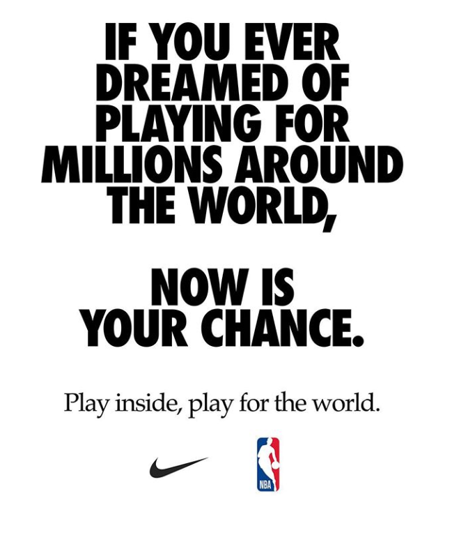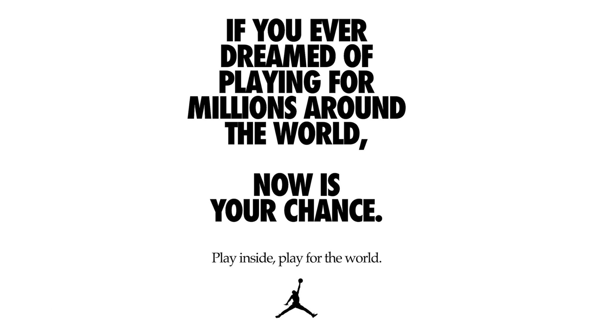 Attraverso i social media, il brand ha pubblicato un messaggio che recita ''Se hai mai sognato di giocare per persone di tutto il mondo, ora è la tua occasione. Gioca dentro, gioca per il mondo'', seguito - a mo’ di firma - dall’iconico Swoosh. Lo slogan, progettato insieme allo studio Wieden + Kennedy Portland e repostato da una serie infinita di atleti e società sponsorizzate Nike, segue l'annuncio secondo cui il marchio e la sua fondazione avrebbero stanziato oltre 15 milioni di dollari per sostenere gli sforzi per combattere il COVID-19.