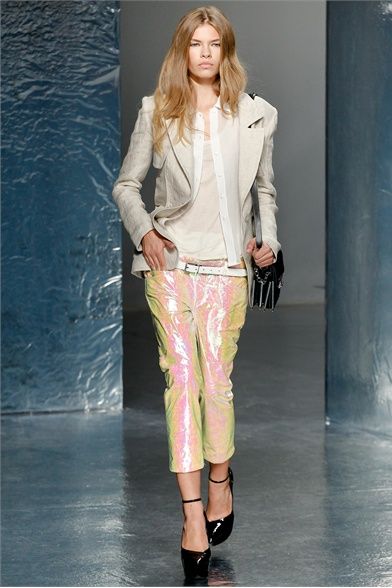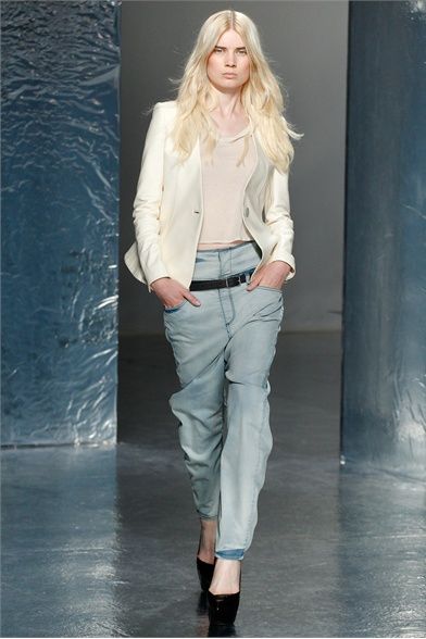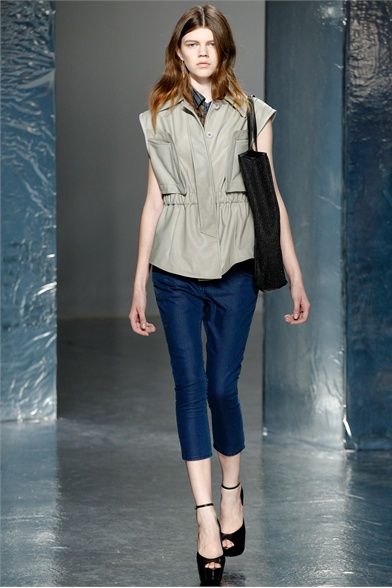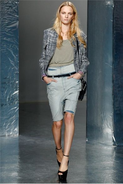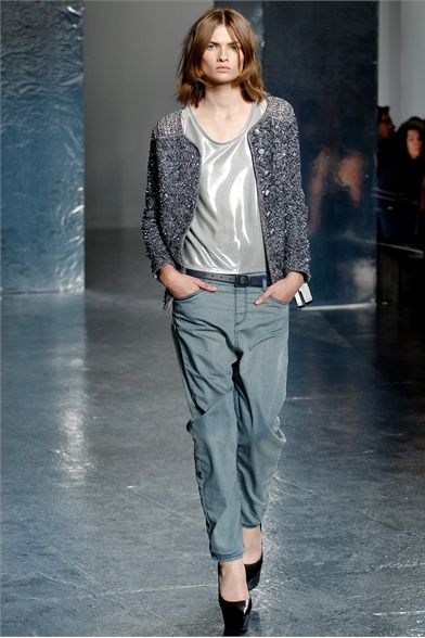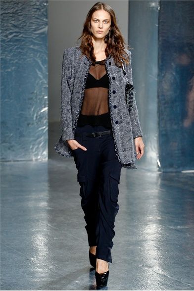 A New York per la SS 2012 Olivier Theyskens porta in passerella una silhouette innovativa, uno streetwear in versione high fashion. Le linee dei pantaloni sono singolari, la vita è sempre molto bassa ma il tronco non è mai scoperto. Per il capospalla sceglie linee morbide e destrutturate e tessuti come il lino, tweed e maglia ad uncinetto. Per i top punta sulle trasparenze e sulle preziosità e per i colori resta nei neutri con qualche accenno di blu e verde e talvolta insolitamente metallizzato. Gli outfits non sono scontati pur essendo pratici e versatili, adatti al giorno e alla sera nella stessa misura. Le borse di paglia nera e le scarpe con tacchi e plateau vertiginosi raccontano la storia di donne vanitose con il feticcio per quell'accessorio e per quel dettaglio che fa la differenza.