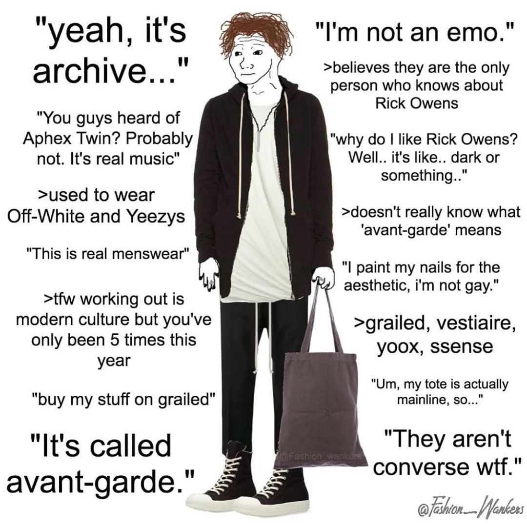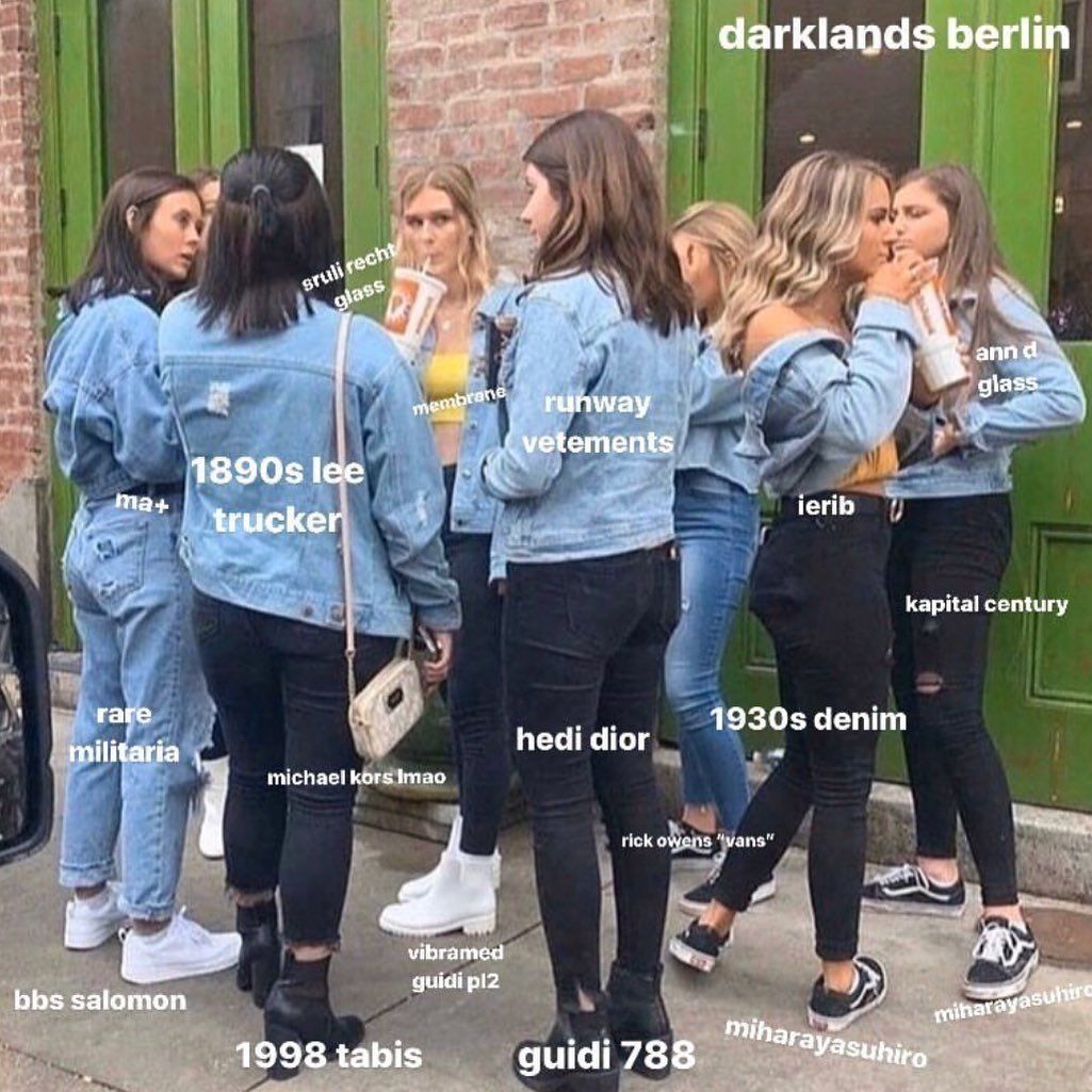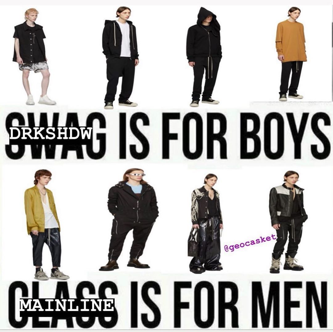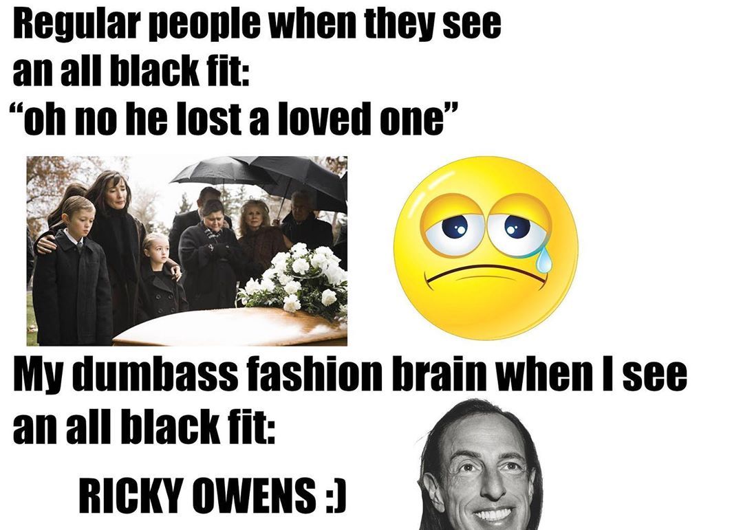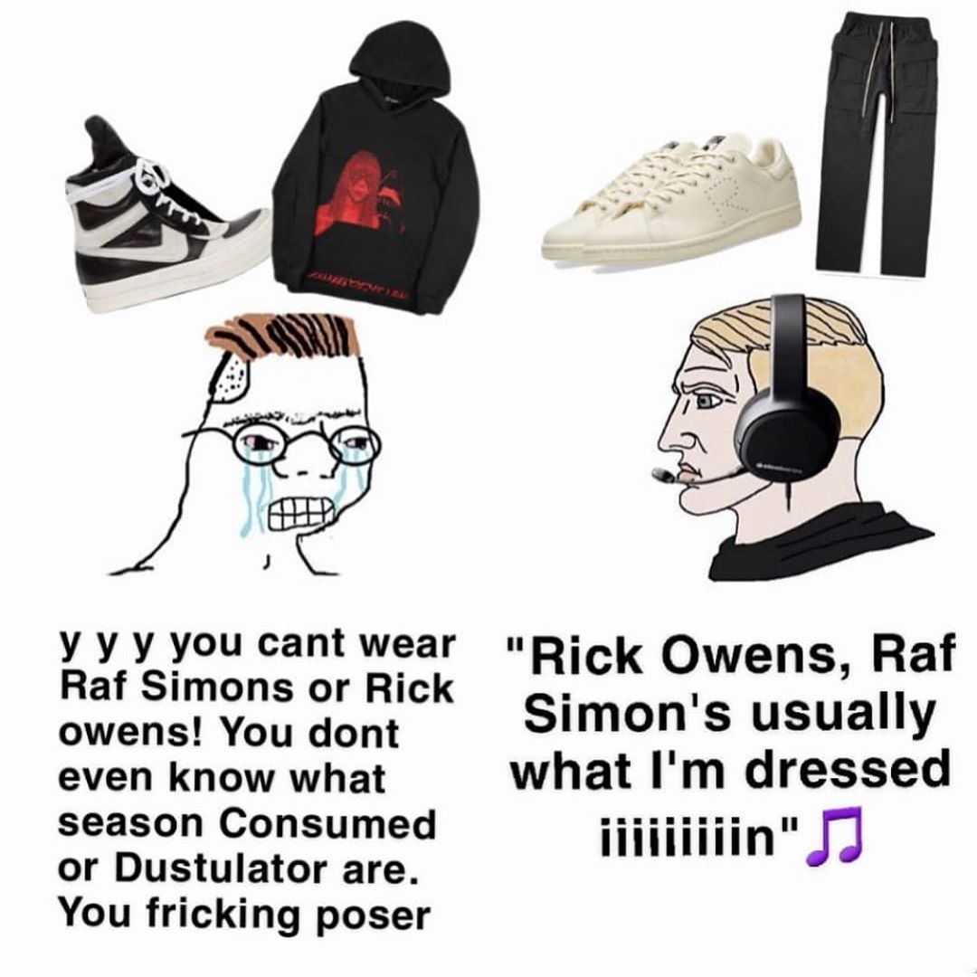In questo senso, i fashion meme di queste pagine creano un linguaggio comune per tutti i membri della community, evitando di appiattirli tutti in un singolo stereotipo e rendendoli riconoscibili l’uno per l’altro. Un linguaggio e un sistema di riferimenti comuni porta inevitabilmente a rafforzare il senso d’identità della community stessa. Questa community è una delle più pure espressioni del Nuovo Lusso, i cui consumatori sono hyperaware della storia dei brand, in grado di comprendere i layer di ironia nascosti in un meme. Il vecchio lusso, invece, era del tutto privo di questa autoironia che appunto, nel caso dei meme di moda, si concentra su brand decollati negli anni ‘90, come Raf Simons e Rick Owens, e non sulle firme più storiche del settore, troppo istituzionali per essere terreno fertile allo humor dissacrante dei meme.