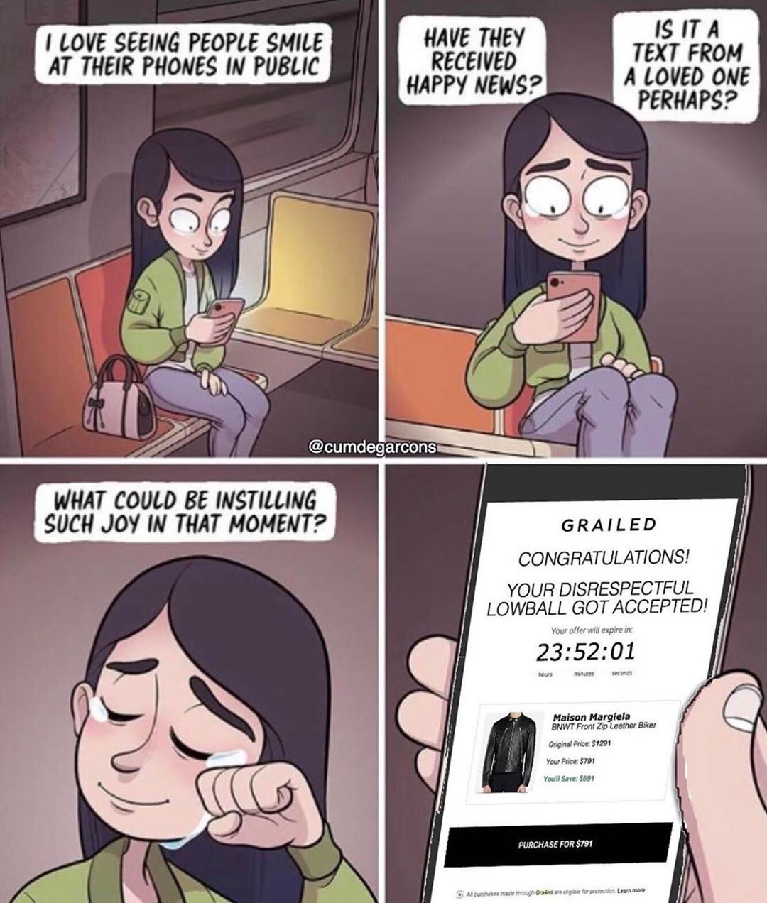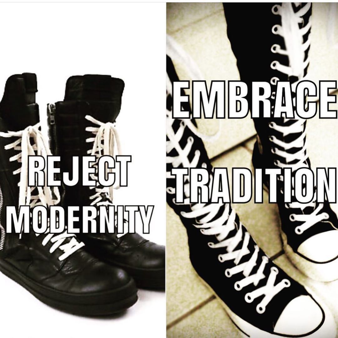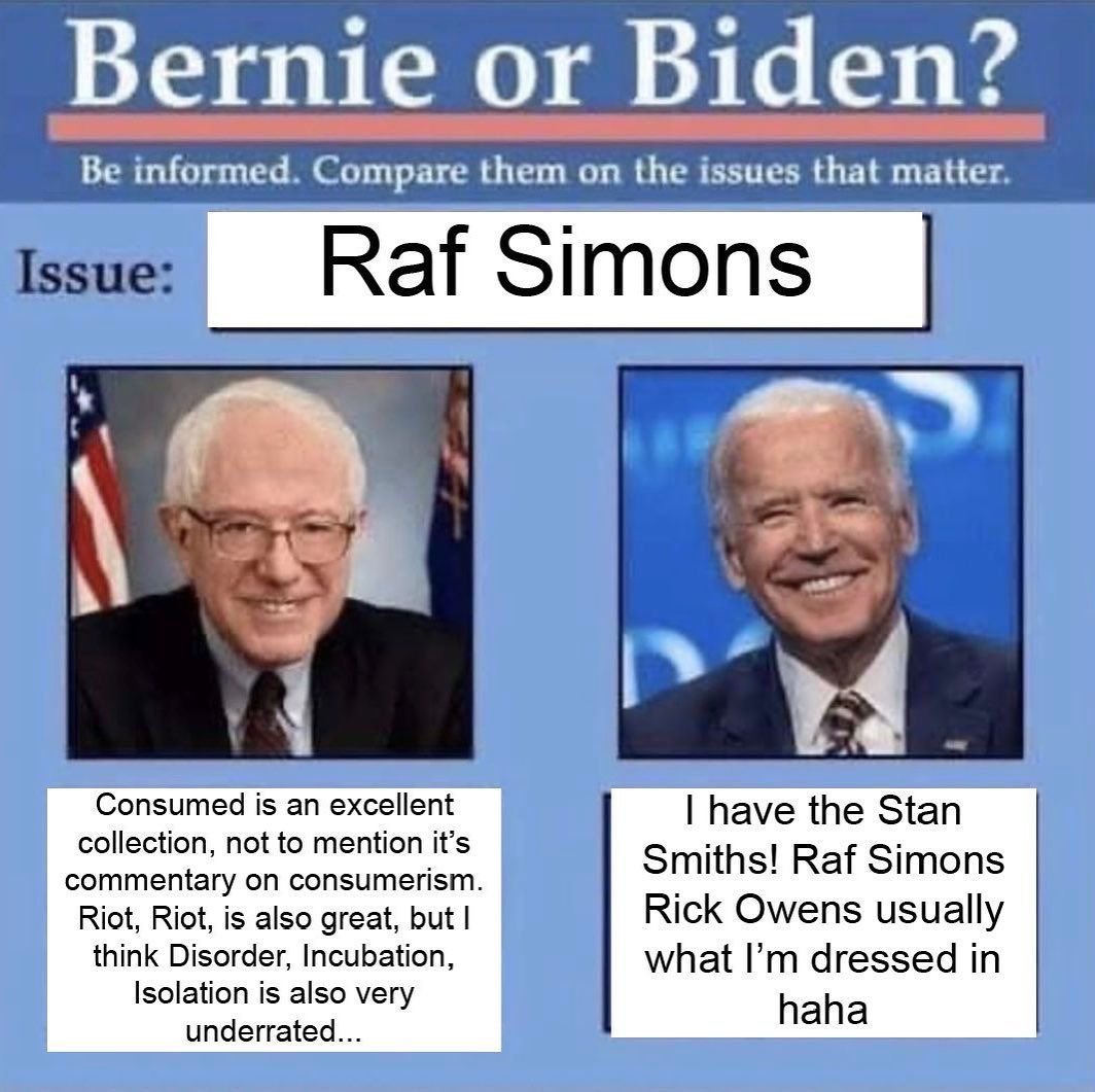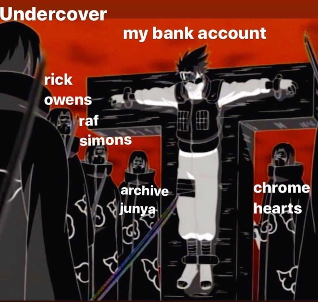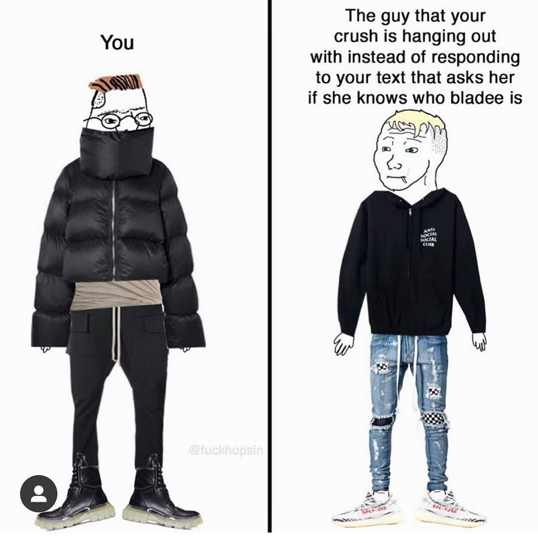 In questo senso, i fashion meme di queste pagine creano un linguaggio comune per tutti i membri della community, evitando di appiattirli tutti in un singolo stereotipo e rendendoli riconoscibili l’uno per l’altro. Un linguaggio e un sistema di riferimenti comuni porta inevitabilmente a rafforzare il senso d’identità della community stessa. Questa community è una delle più pure espressioni del Nuovo Lusso, i cui consumatori sono hyperaware della storia dei brand, in grado di comprendere i layer di ironia nascosti in un meme. Il vecchio lusso, invece, era del tutto privo di questa autoironia che appunto, nel caso dei meme di moda, si concentra su brand decollati negli anni ‘90, come Raf Simons e Rick Owens, e non sulle firme più storiche del settore, troppo istituzionali per essere terreno fertile allo humor dissacrante dei meme.