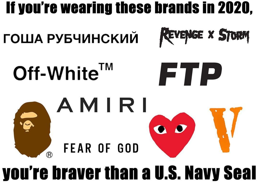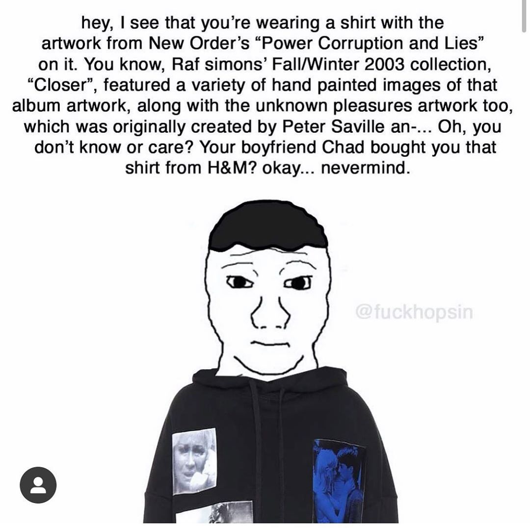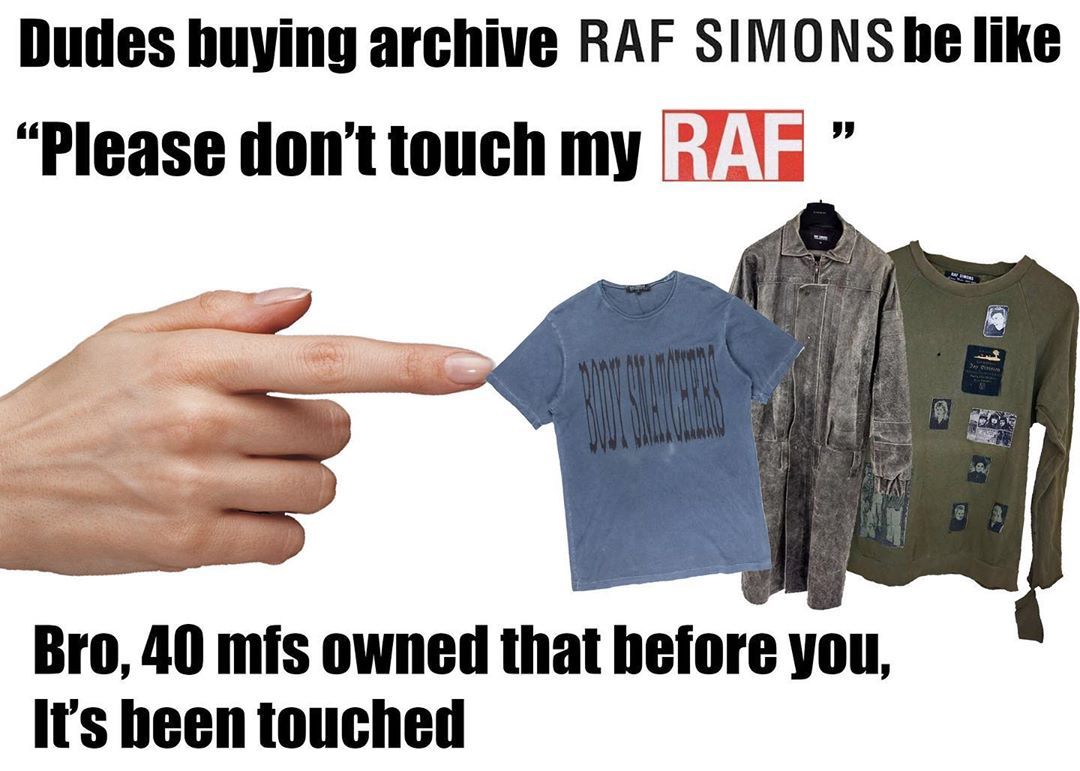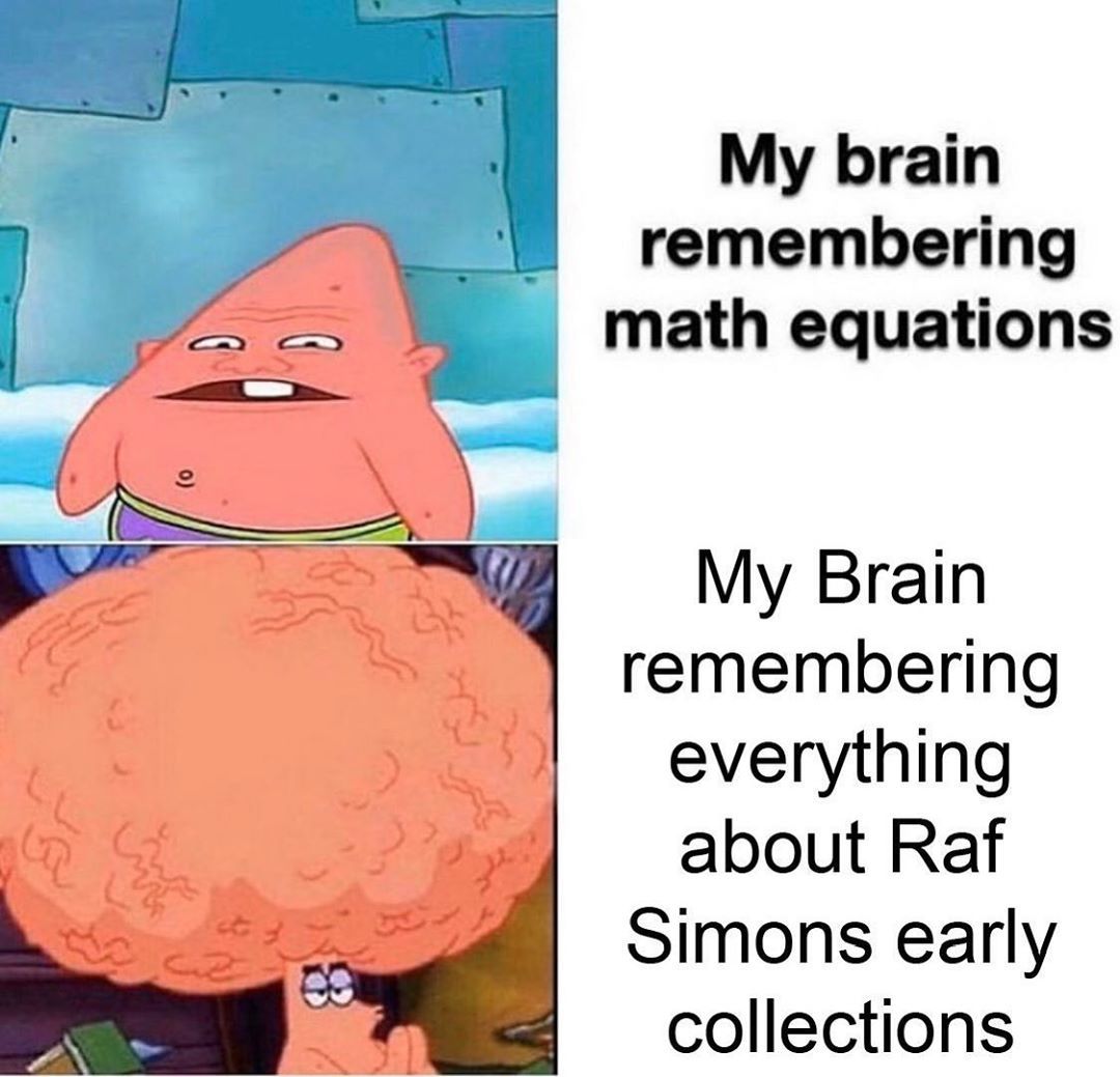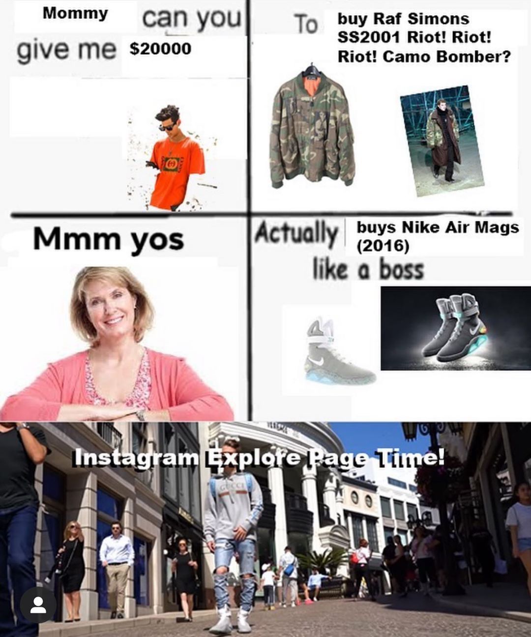 L’umorismo di queste pagine, però, non si basa soltanto sulla parodia dei fashion addicted che si vedono online ma anche un tipo di umorismo “informativo” che nasconde in mezzo ai meme piccole lezioni di storia della moda. Non si tratta però mai di spiegoni o riepiloghi di storie sui brand più popolari, ma più a riferimenti ultra-specialistici a singoli item e collezioni o a designer di moda avant-garde. La comicità deriva proprio dall’oscurità del riferimento – una vera e propria comicità nerd che mescola cultura e parodia della cultura. Più un riferimento è astruso e specialistico (protagonista di molte gag è l’ormai mitologico “Riot Riot Riot Camo Bomber” della FW01 di Raf Simons), più si accentuano i suoi tratti bizzarri e surreali.