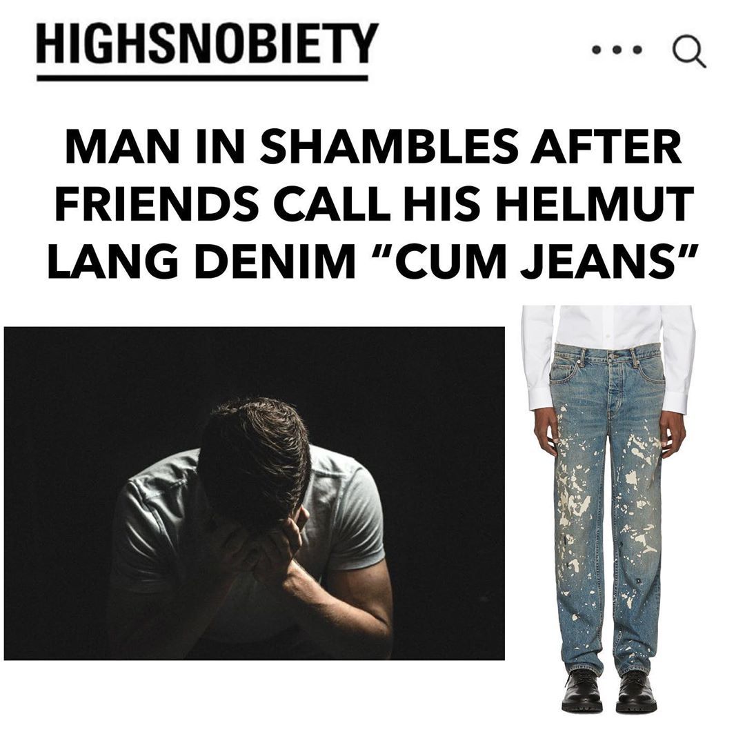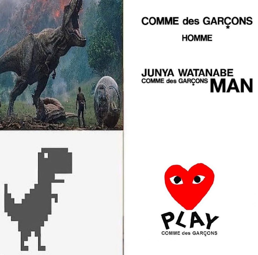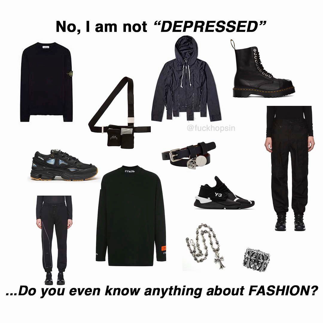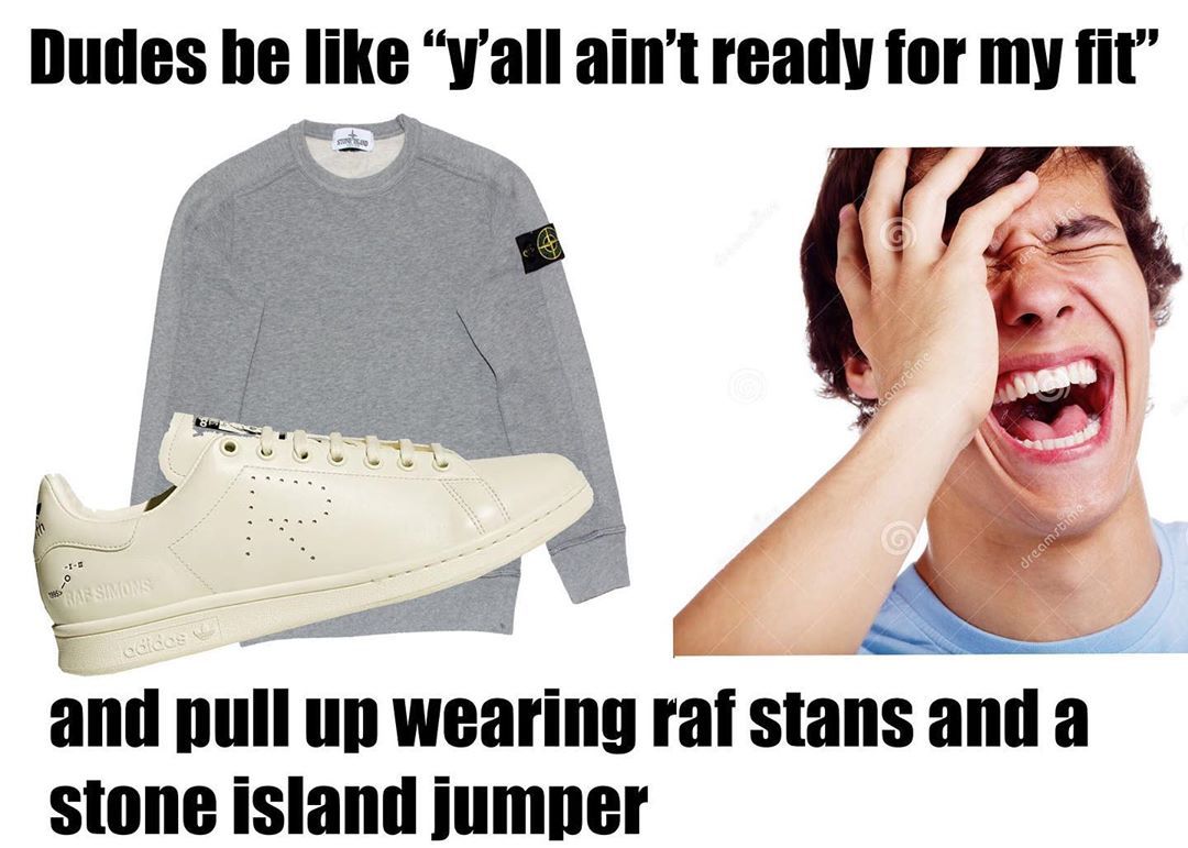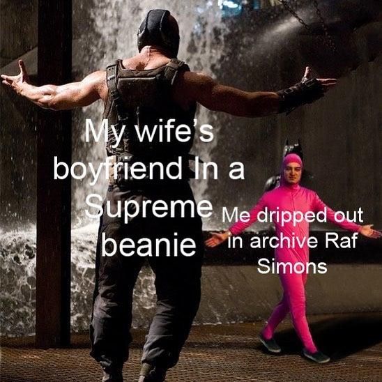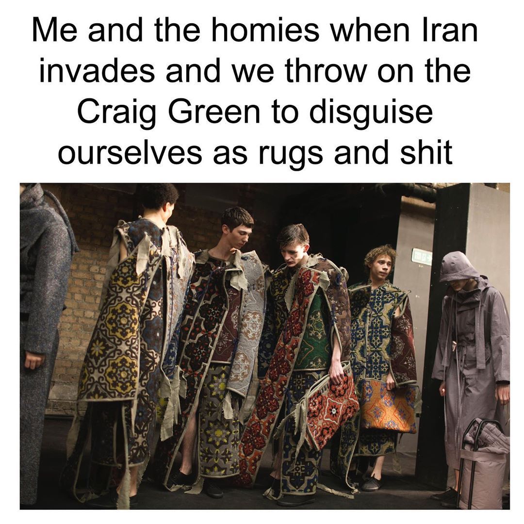 L’umorismo di queste pagine, però, non si basa soltanto sulla parodia dei fashion addicted che si vedono online ma anche un tipo di umorismo “informativo” che nasconde in mezzo ai meme piccole lezioni di storia della moda. Non si tratta però mai di spiegoni o riepiloghi di storie sui brand più popolari, ma più a riferimenti ultra-specialistici a singoli item e collezioni o a designer di moda avant-garde. La comicità deriva proprio dall’oscurità del riferimento – una vera e propria comicità nerd che mescola cultura e parodia della cultura. Più un riferimento è astruso e specialistico (protagonista di molte gag è l’ormai mitologico “Riot Riot Riot Camo Bomber” della FW01 di Raf Simons), più si accentuano i suoi tratti bizzarri e surreali.