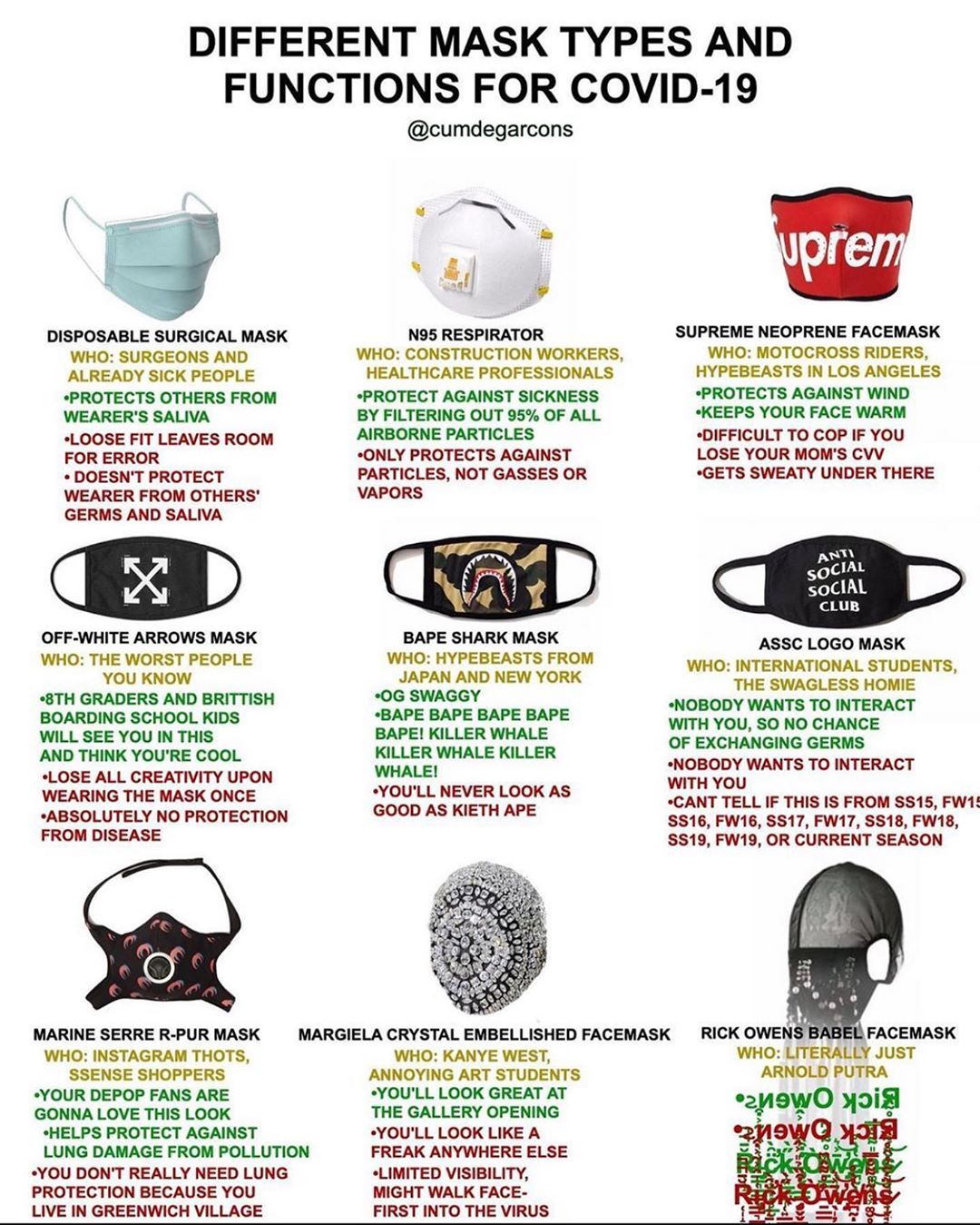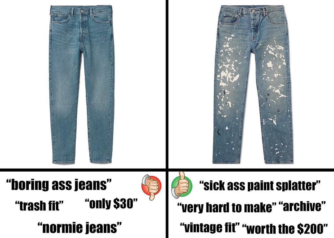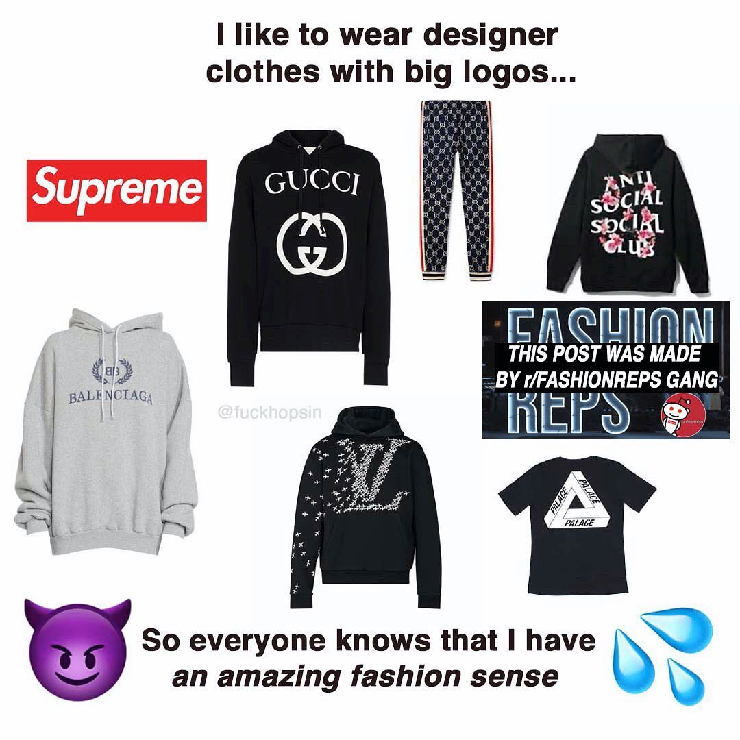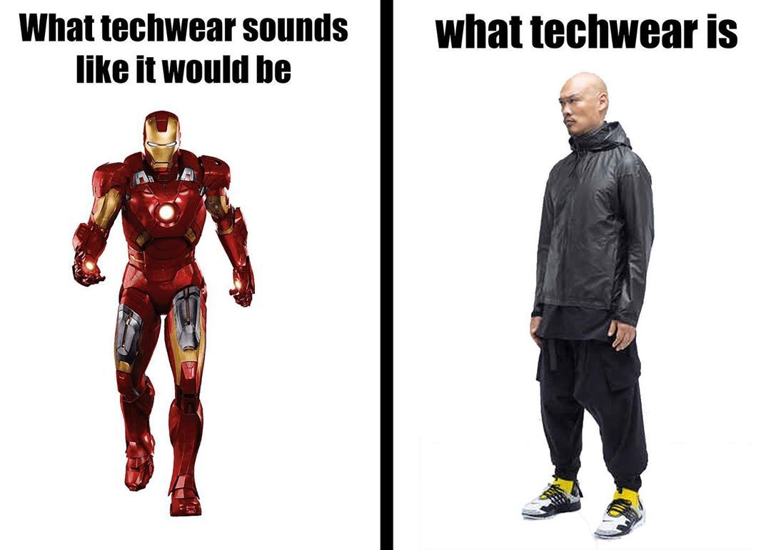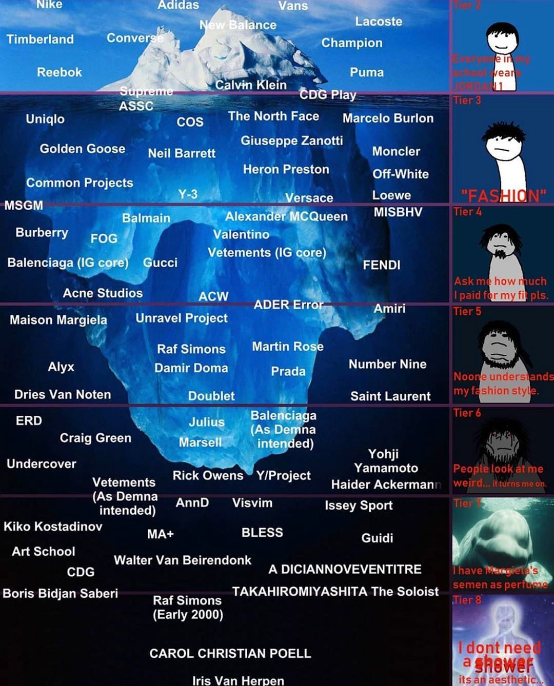 L’umorismo di queste pagine, però, non si basa soltanto sulla parodia dei fashion addicted che si vedono online ma anche un tipo di umorismo “informativo” che nasconde in mezzo ai meme piccole lezioni di storia della moda. Non si tratta però mai di spiegoni o riepiloghi di storie sui brand più popolari, ma più a riferimenti ultra-specialistici a singoli item e collezioni o a designer di moda avant-garde. La comicità deriva proprio dall’oscurità del riferimento – una vera e propria comicità nerd che mescola cultura e parodia della cultura. Più un riferimento è astruso e specialistico (protagonista di molte gag è l’ormai mitologico “Riot Riot Riot Camo Bomber” della FW01 di Raf Simons), più si accentuano i suoi tratti bizzarri e surreali.