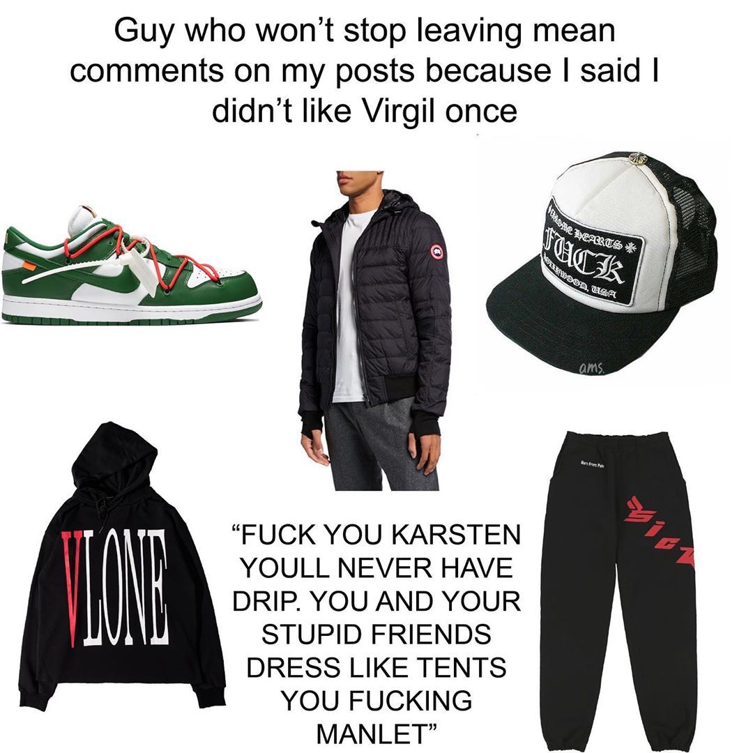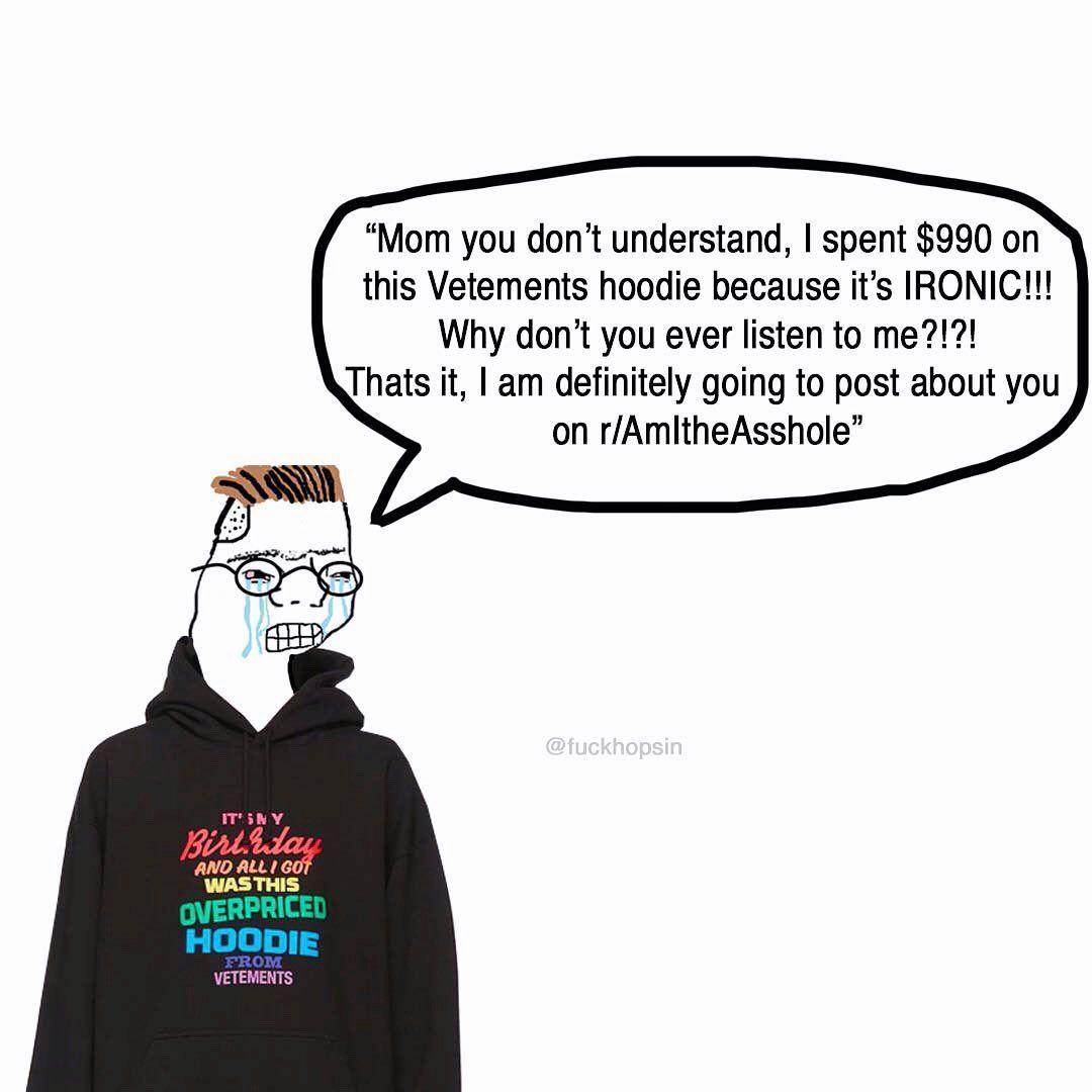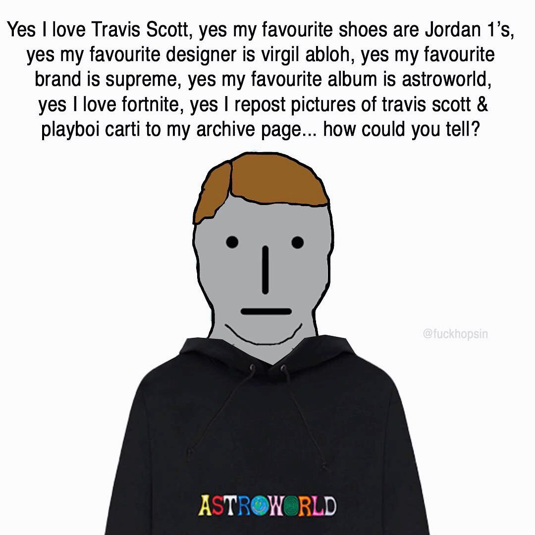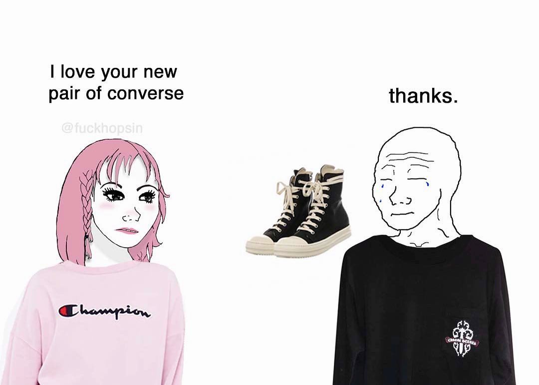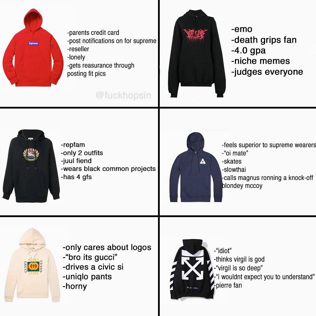 Uno dei grandi (e forse incosapevoli) meriti di queste pagine è di mettere al loro centro non tanto i produttori di moda ma i consumatori, mettendone alla berlina fisime e atteggiamenti. Esistono tante parodie quanti sono i segmenti di mercato degli stessi brand: ci sono i fanatici della moda d’archivio depressi e incompresi, i partigiani del merch di Travis Scott che amano ciecamente il proprio idolo, i “Flower Boys” ricoperti di Golf Wang dalla testa ai piedi e i classici hypebeast con in mente soltanto il resell. Ciascuno di questi personaggi possiede le proprie gag e battute ricorrenti, ma bisogna notare come nessun gruppo sia escluso da questo umorismo. In altre parole, chiunque sia appassionato di moda può riconoscere in essi se stesso o i propri amici e vedere presi in giro, ma anche celebrati, i propri tratti senza che nessuna delle categorie bersagliate sia veramente esclusa.