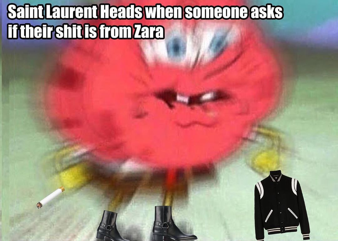 La moda non fa ridere. Anzi si potrebbe dire che i grandi brand del lusso, pur offrendo al pubblico immagini di spensieratezza e positività, si prendano terribilmente sul serio nel proprio ruolo. Del resto, dietro a ogni brand e alla sua filosofia si nascondono investitori, board di amministratori e bilanci trimestrali da far quadrare. Se dunque i brand non possono sbilanciarsi nell’ironia, tocca ai consumatori fare umorismo. E nell’epoca dei social media, l’umorismo si muove attraverso i meme. Pagine come @meme_saint_laurent, @raf_semens, @geocasket, @fuckhopsin e @cumdesgarcons contano a oggi centinaia di migliaia di follower e si distinguono sia per l’universo di riferimenti entro il quale si muovono, mescolando ironia e informazione, sia per il ricchissimo e dettagliato ritratto che fanno, sempre in chiave parodica, degli stessi consumatori di luxury fashion. Negli ultimi tempi, con l’esplosione del mercato secondhand e la comparsa di un nuovo concetto di lusso, queste pagine si sono ritagliate uno spazio crescente diventando poli di aggregazione online e fungendo da scanzonate fonti educative sulla storia della moda.