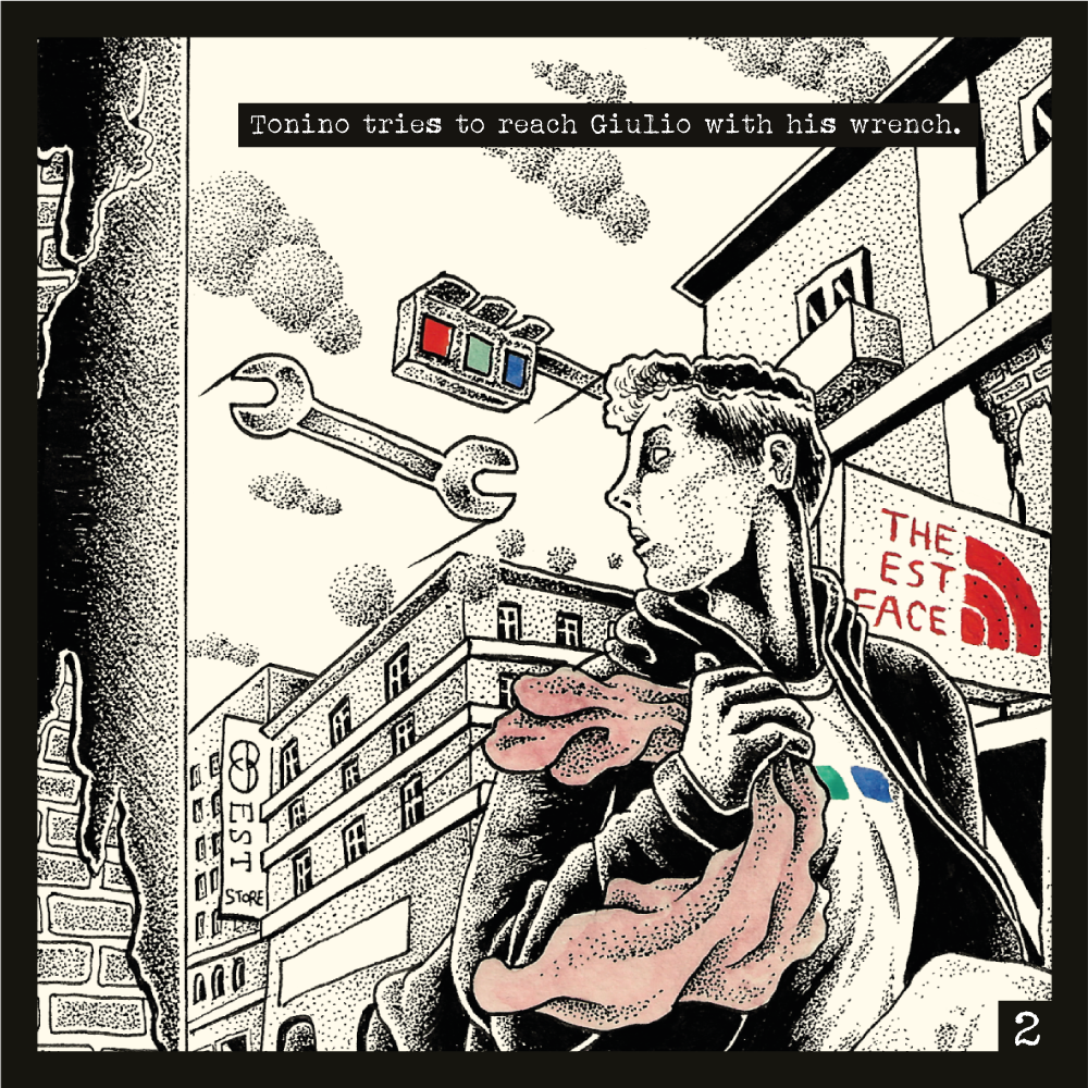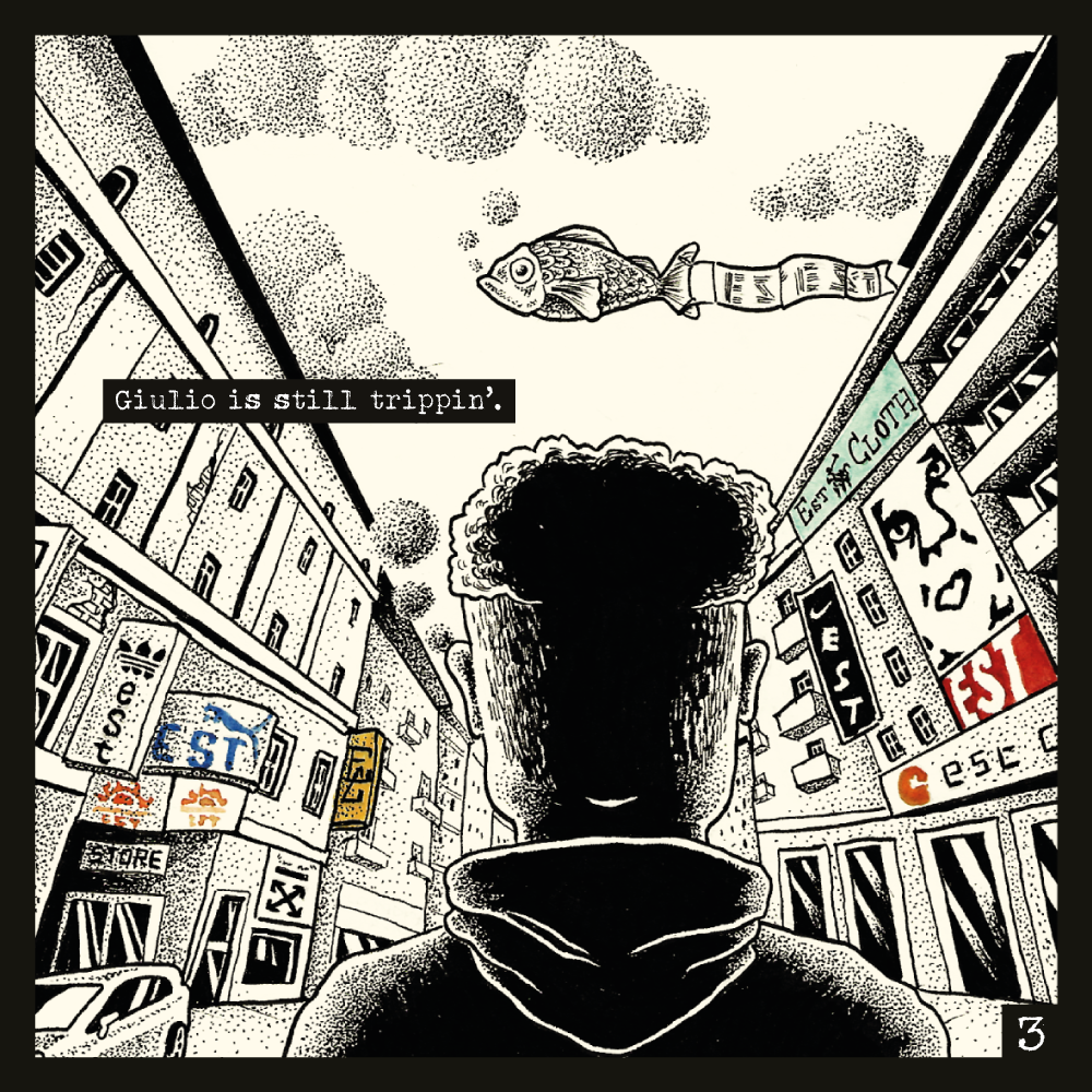 Stiamo cercando di creare un’atmosfera comune a tutti i progetti che accompagnano le collezioni. I linguaggi e le forme tramite cui comunichiamo Est sono diverse. La mia visione è quella di comunicare Est tramite tre edifici: lo shop, fisico e online; l’edicola, che contiene Est radio (web radio di Est) ed Est comics (progetto a fumetti); e il club, dove chi compra Est può andare a ballare tutti i venerdì.